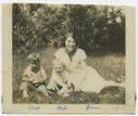 Black and white photograph of two boys and a woman. They are sitting in a field with bushes in the background. The boys are identified as Clyde and Gib. The woman is identified as Jean(?).