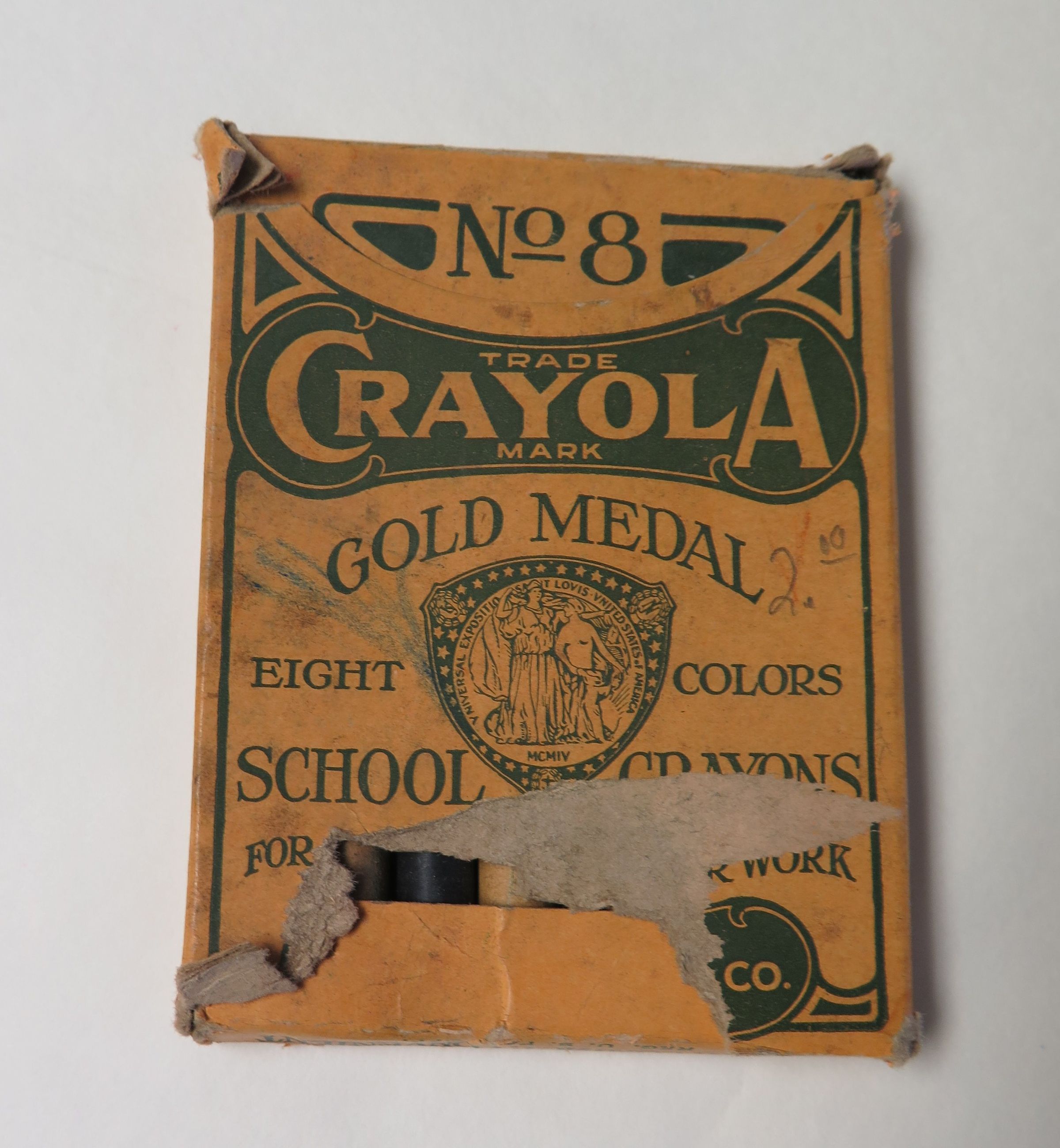This is a box of Crayola crayons. The box is yellow with green text that reads "No. 8/ Trade/Crayola/ Mark/ Gold Medal/ Eight Colors/ School Crayons/ For Educational Color Work/ Manufactured by/ Binney & Smith Co./ New York, U.S.A.". The box also has green triangle details on the borders of the lid. The box is torn so that not all of the text can be read. There are crayons in the box. In pencil, 2.00 is written on the box, indicating the price of the crayons. This box design was sold from 1919 through 1927.Collection