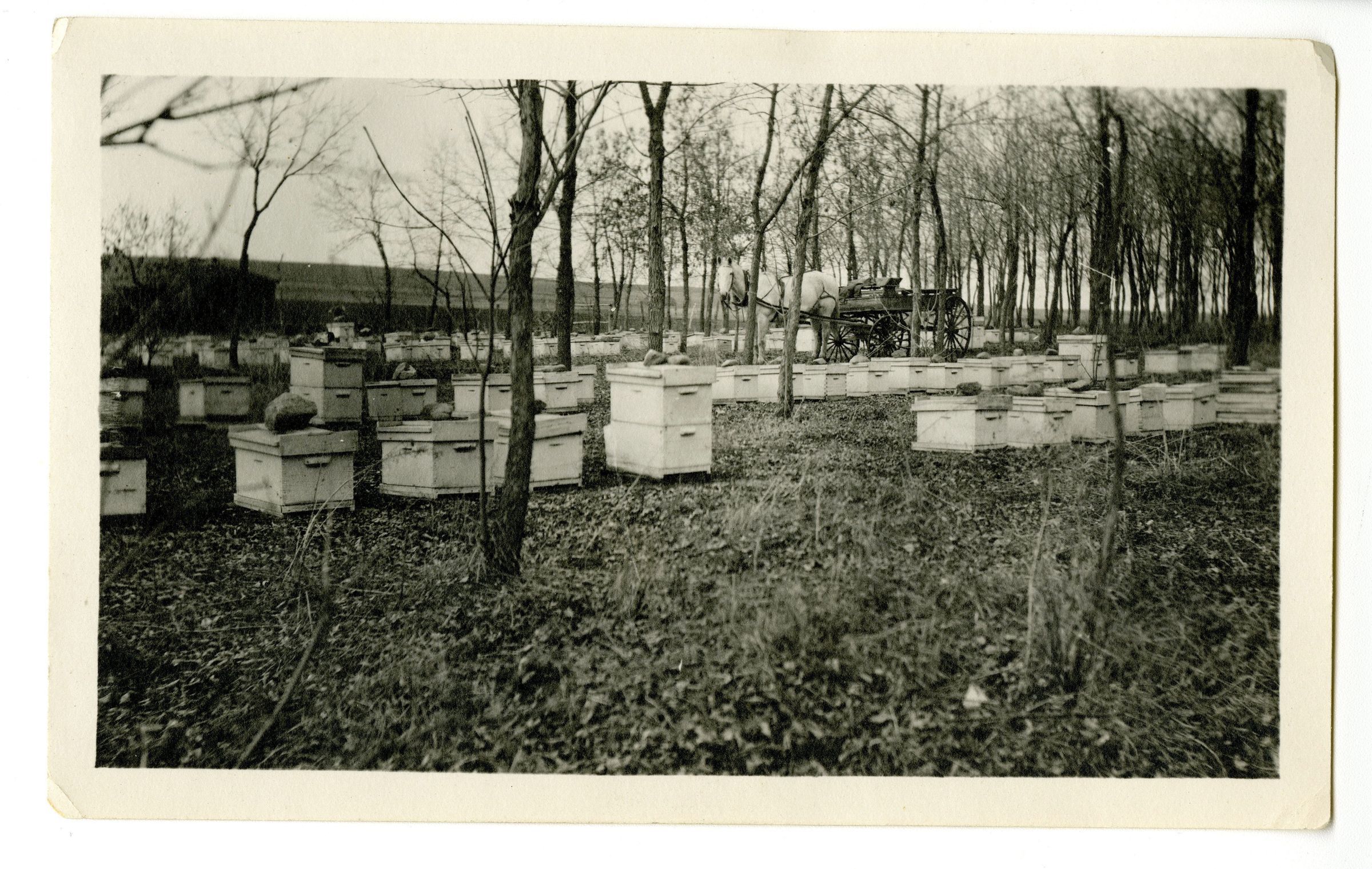 Photograph of the honey bee boxes at the Crawford farm. There is a white horse in the center.