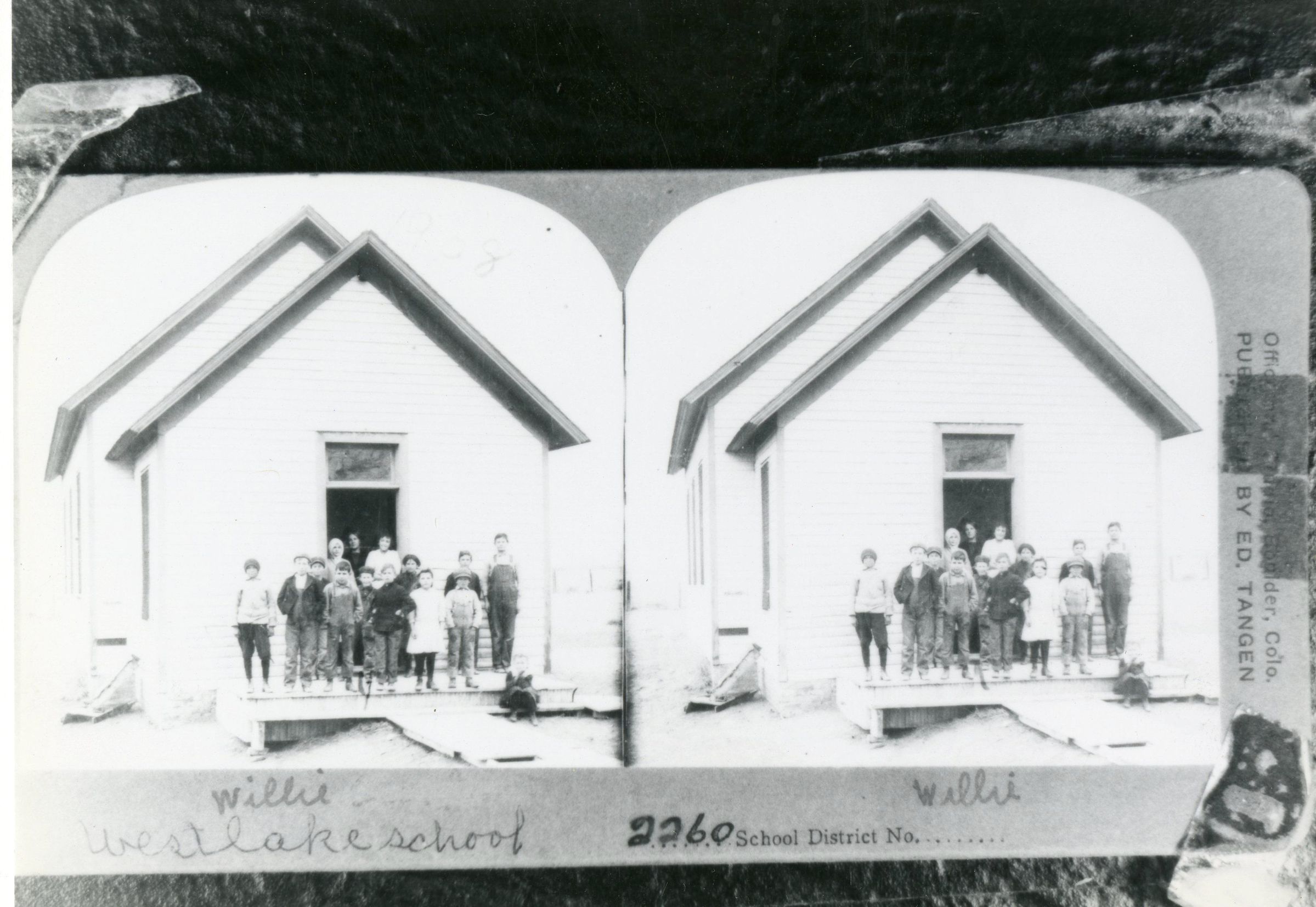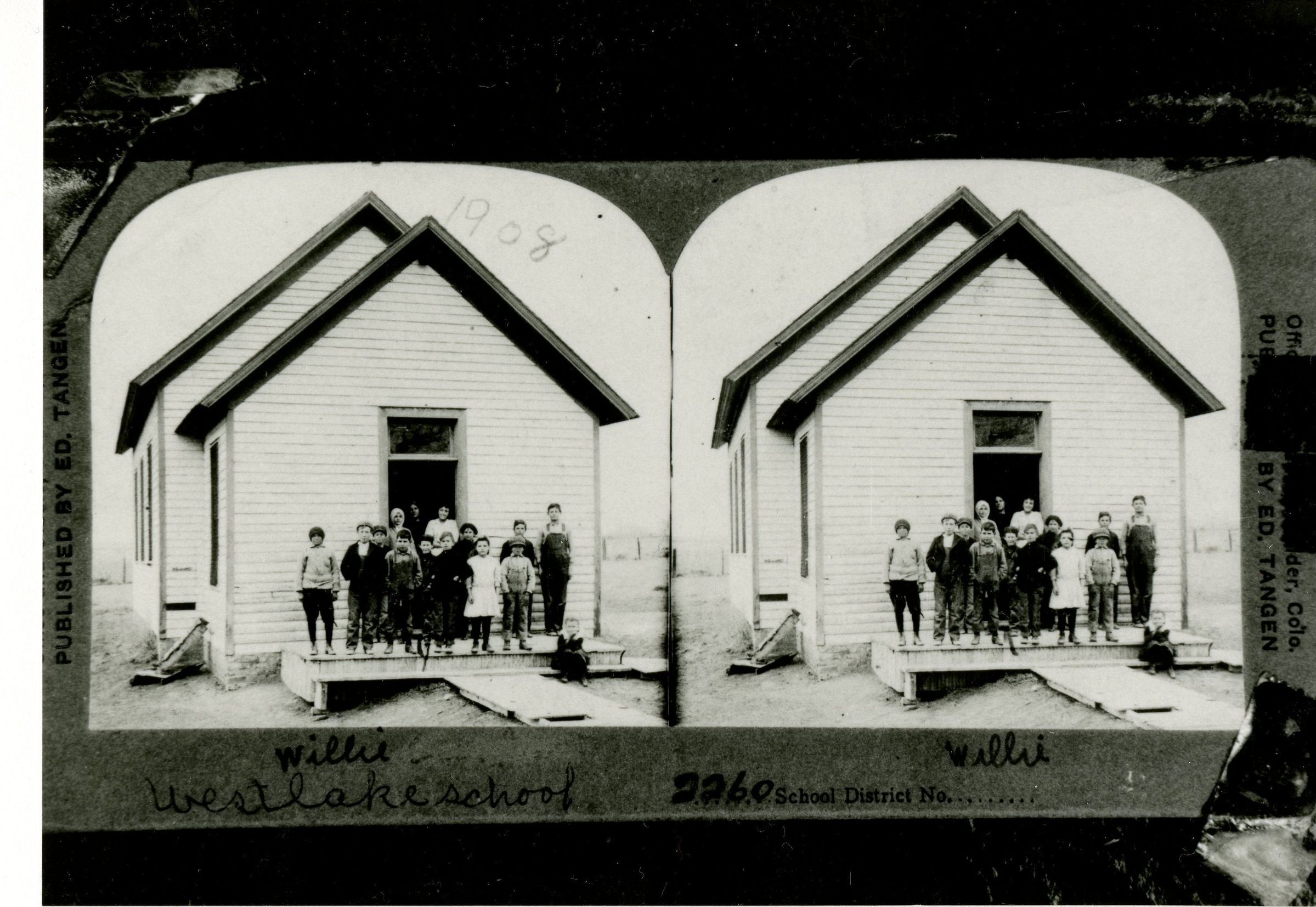 Modern copy of a stereoscopic card of the Westlake School in 1908. There are two copies of the photo, one of which is darker/more exposed, and the other is lighter/less exposed. The photos depict a white building with 14 schoolchildren standing in front of the building and in the doorway, and another student sitting on the stairs in the front. Hand written on the card is the word 'Willie' underneath the photograph, along with 'Westlake School.'