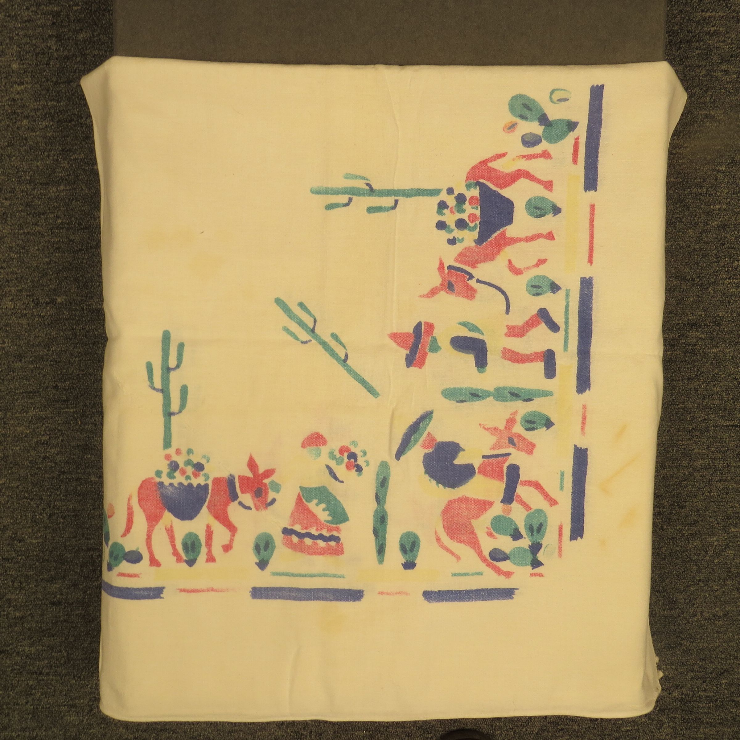 White tablecloth with a colorful Mexican design along the border of the tablecloth. The design consists of cacti, men on horses or donkeys wearing hats, horses or donkeys with bundles on their backs and people standing. Tablecloth measures 8" (w) x 8" (l).