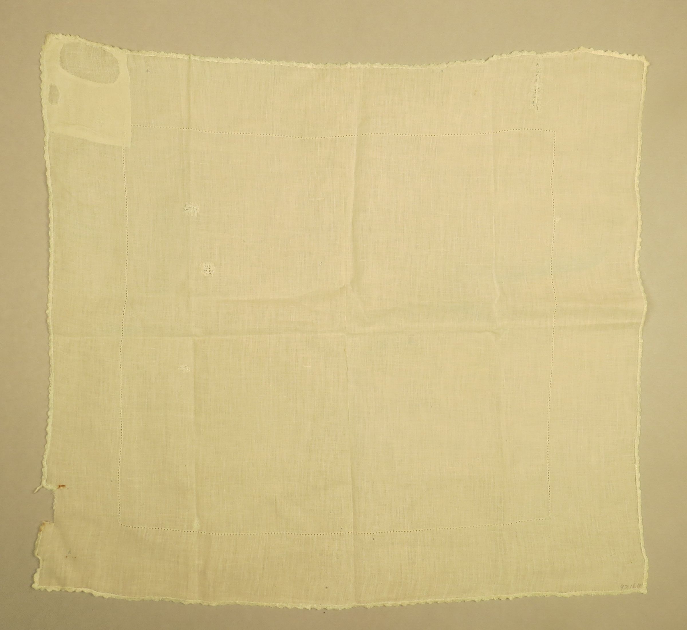 Square tablecloth that is a very faded light blue color. Tablecloth measures 27" (w) x 27" (l). Note: This was recommended for disposal by Megan Huelman in October 2013 (TTempleman 06/30/2017).