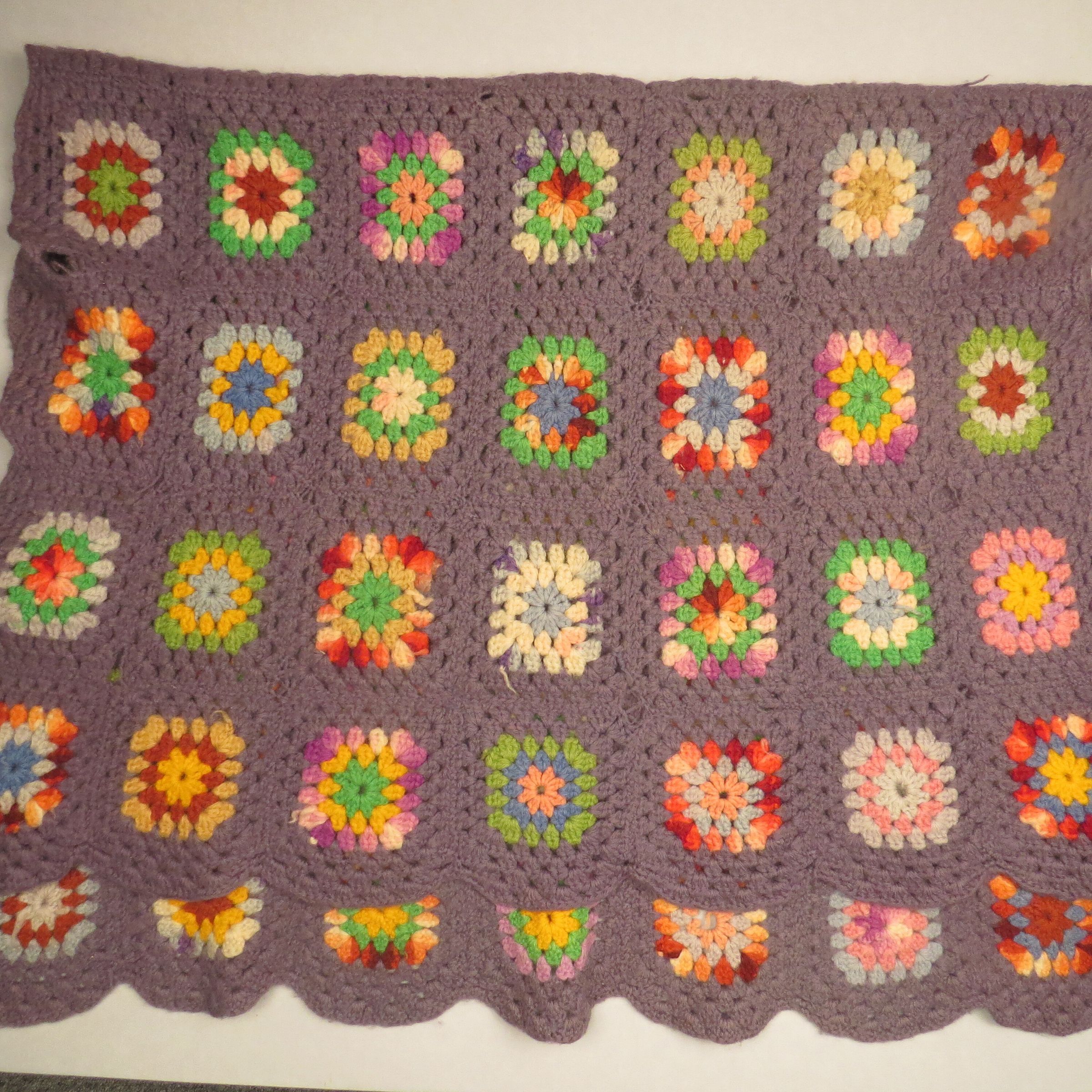 This is a flower garden style afghan with a purple background. The flowers are multiple colors. One edge of the afghan is scalloped. The afghan measures 30" (w) x 45" (l).