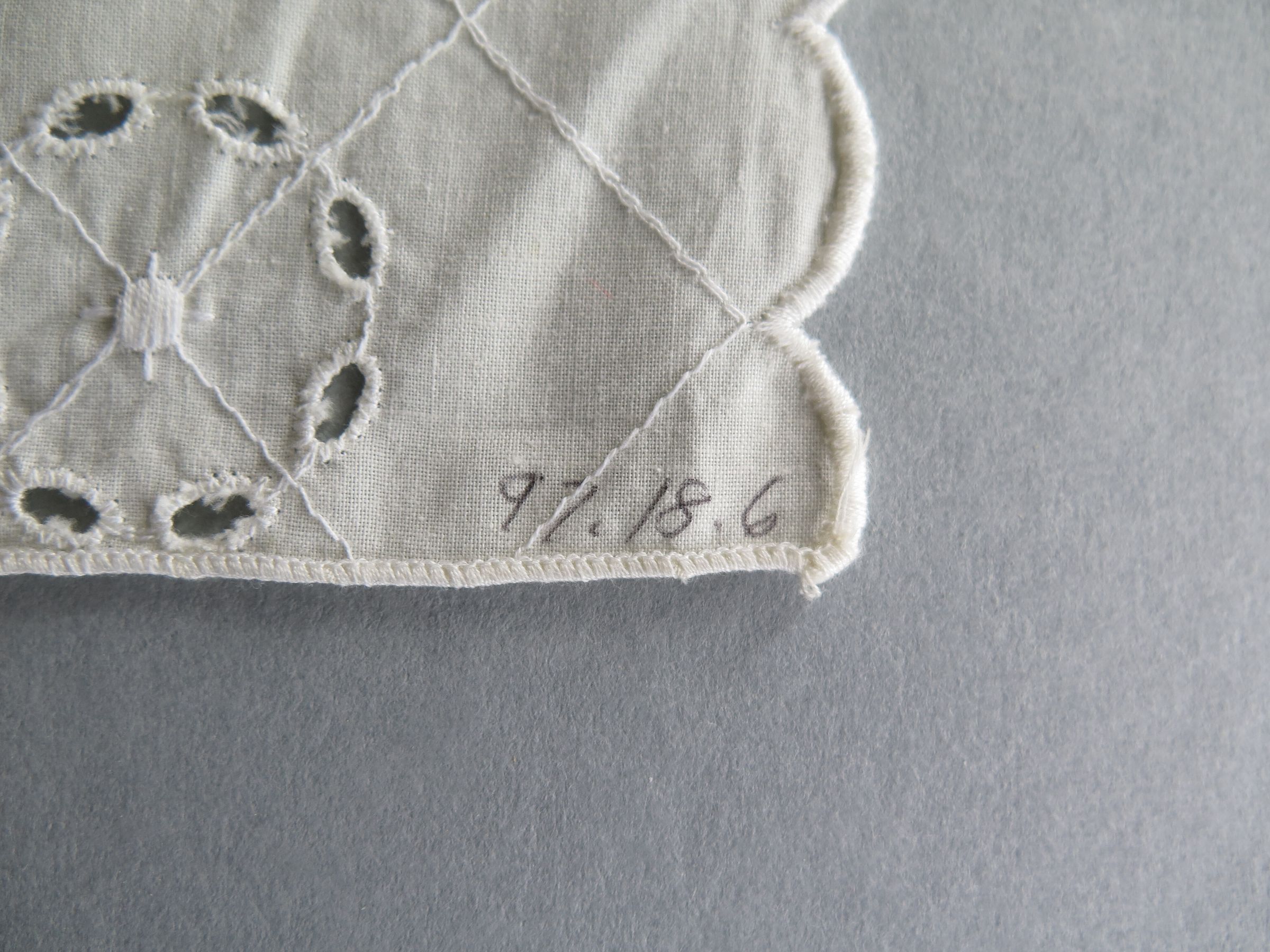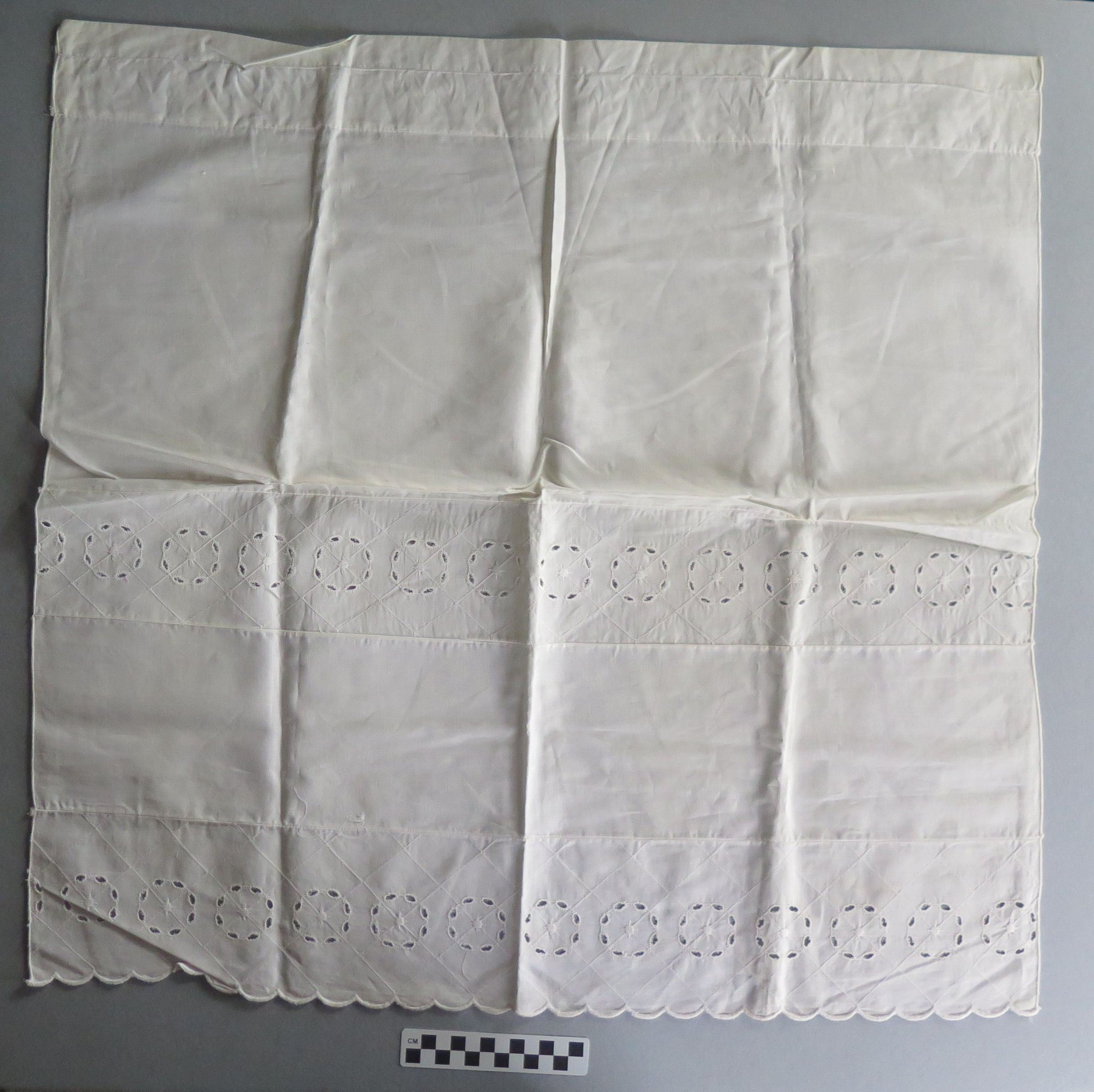 White curtain with scalloped bottom and two stripes of a circular cut out pattern running horizontally. The curtain measures 26" (w) x 28" (l).