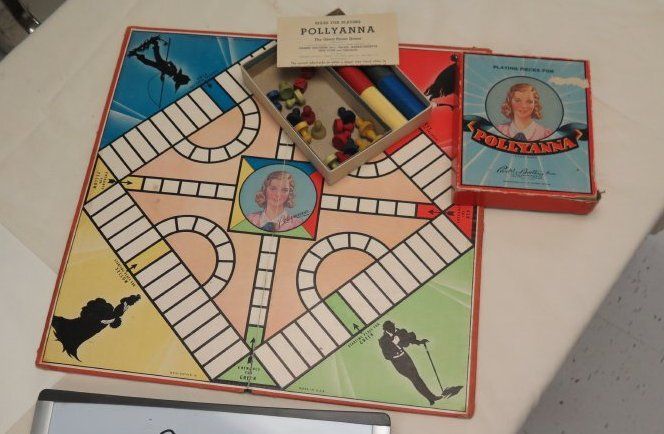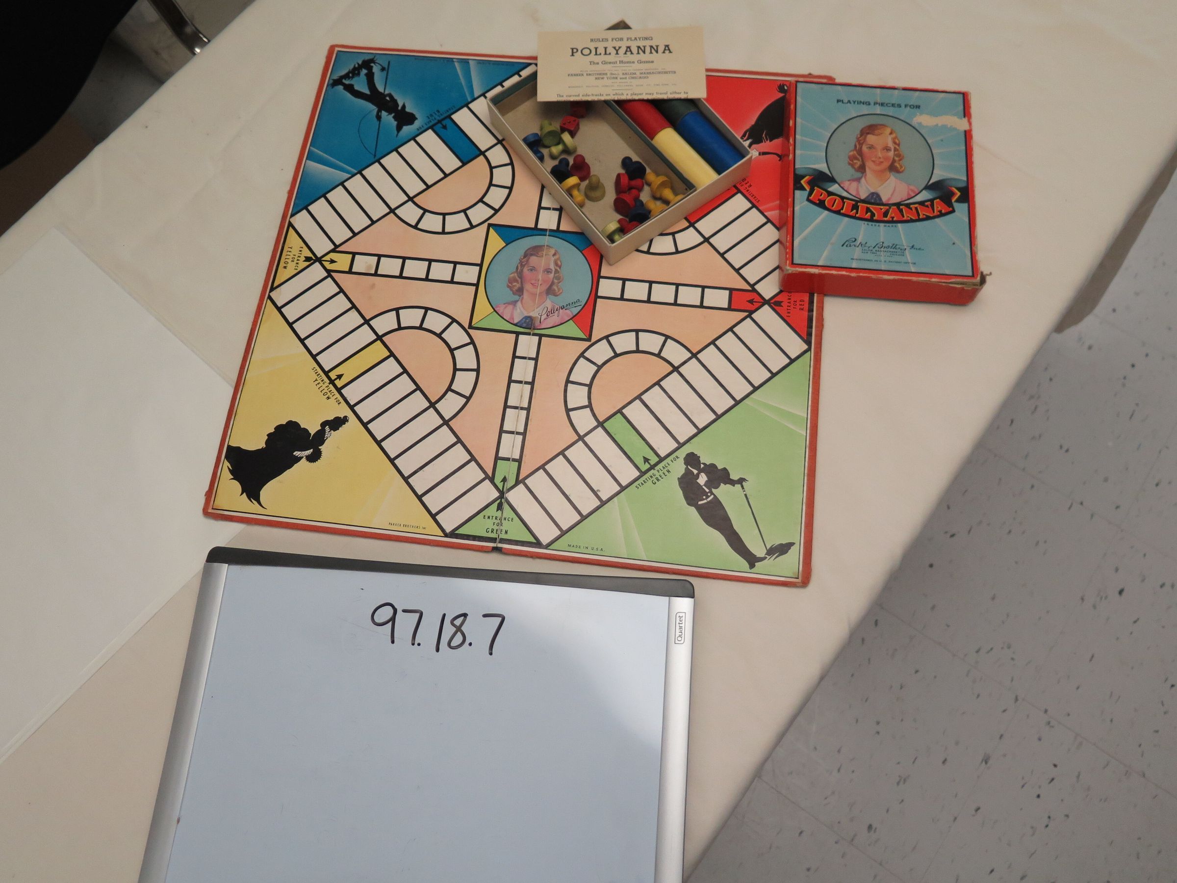 This is a Pollyanna board game. Included in the box is the board and the game pieces. The box is blue with red sides and a picture of a girl on the front. The box measures 1" (h) x 5.75" (w) x 7" (d). The game board measures 9" (w) x 18"(l).