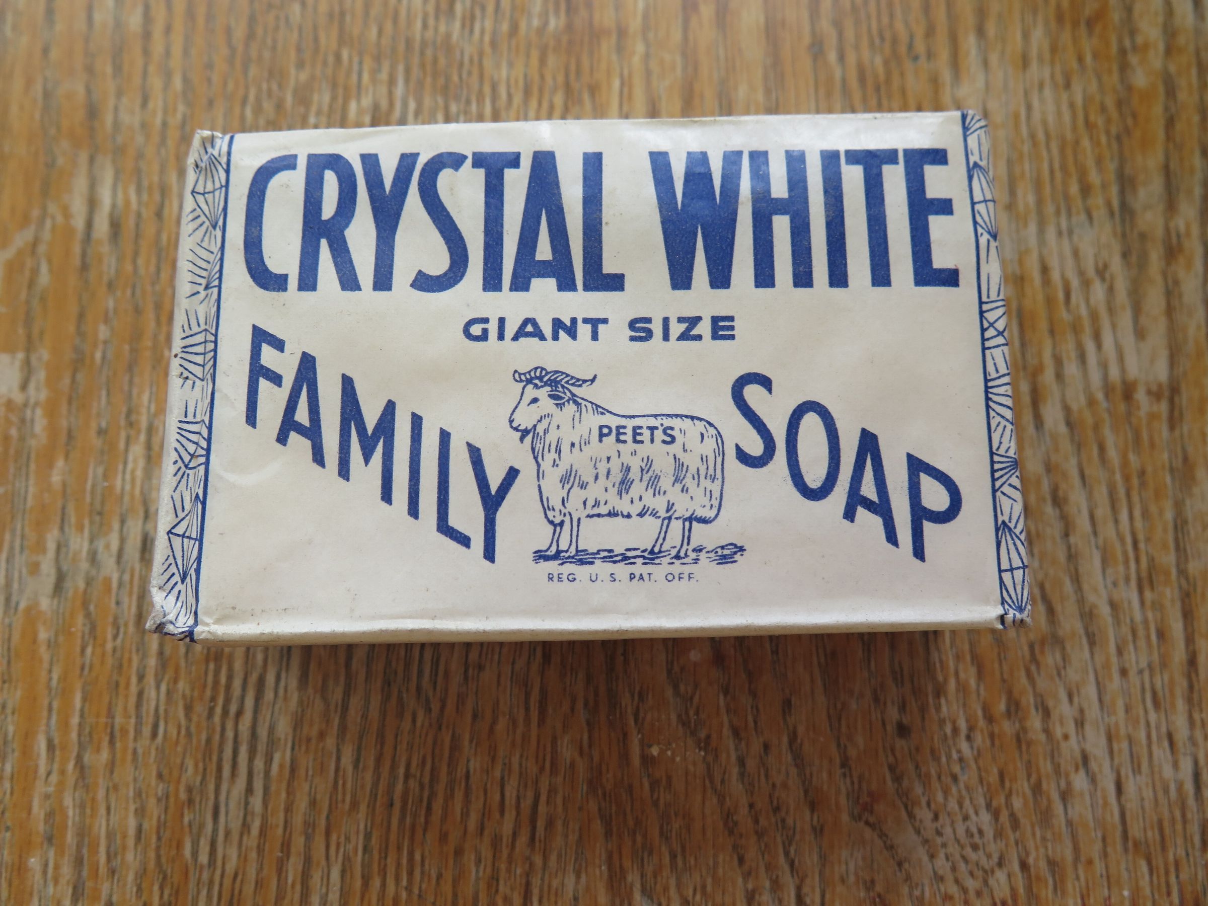This is a bar of soap in white paper packaging with blue text. The text reads; "Chrystal White Giant Size Family Soap" around an illustration of a sheep. The Crystal White brand was at it's most popular during the 1920s and was a bathing soap. The packaging measures 3" (w) x 4.5" (l).