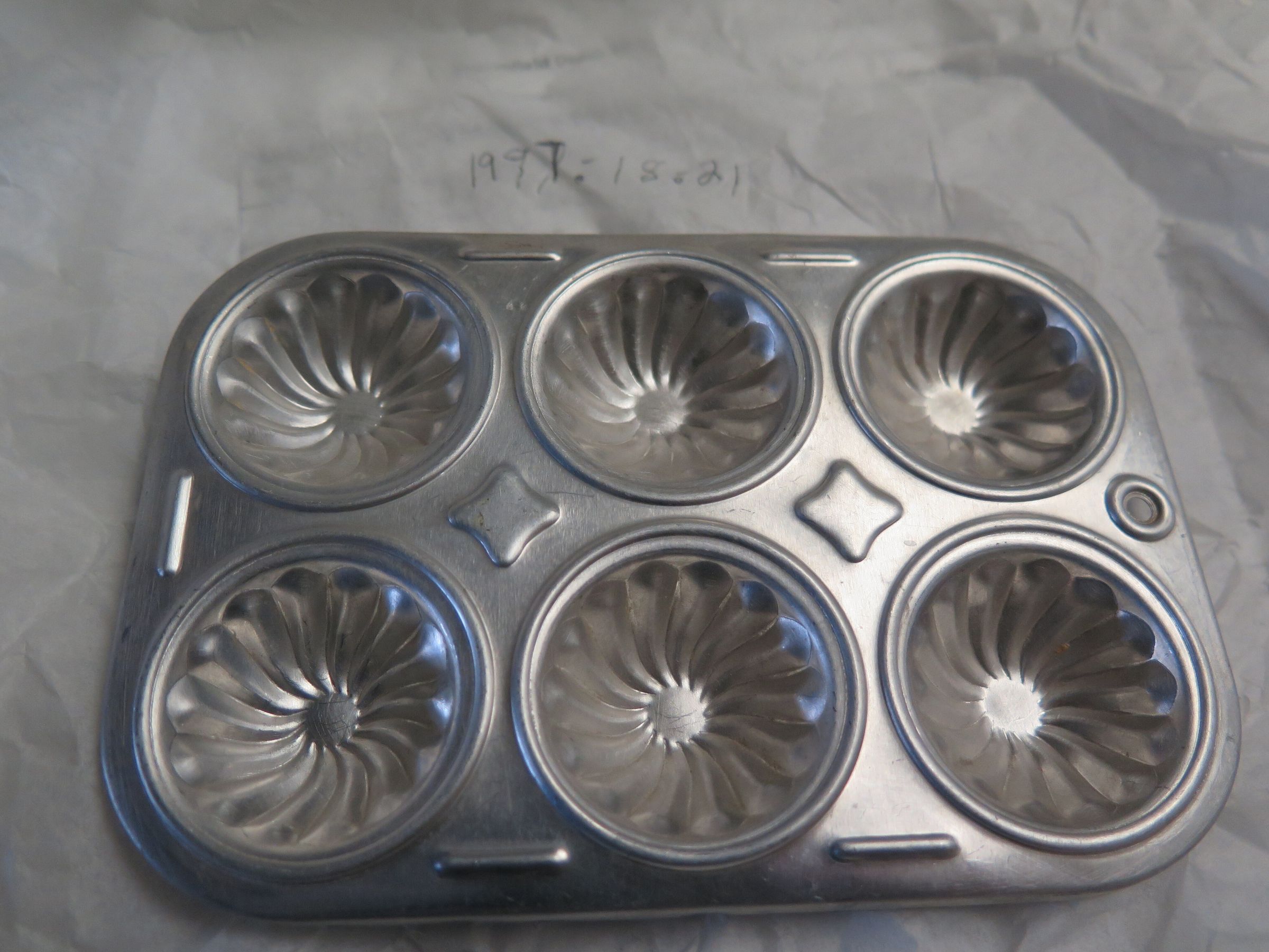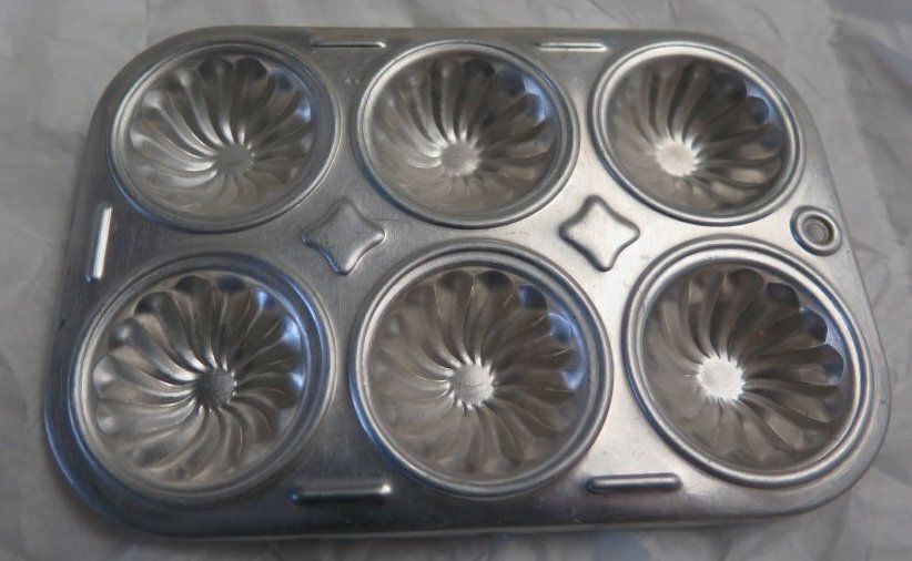 This aluminum child's jello mold or cake pan has six cups. It measures 4" (w) x 5.75" (l). This was probably manufactured by Creative Playthings, but there are no markings on the pan.Collection