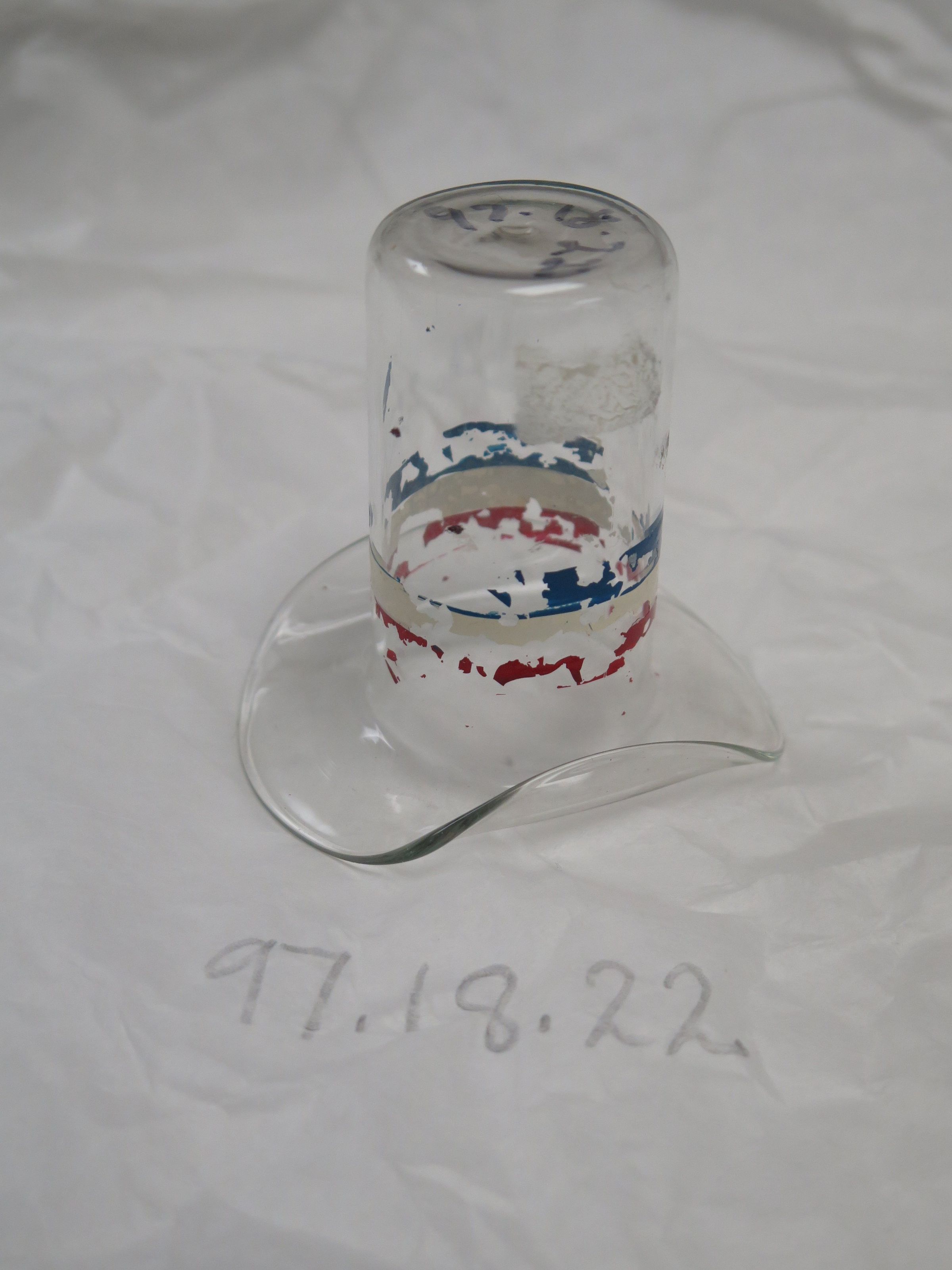 This is a clear glass souvenir top hat. The hat has been painted blue and red. The top hat measures 2.5" (h) x 2.25" (w) x 2" (d).