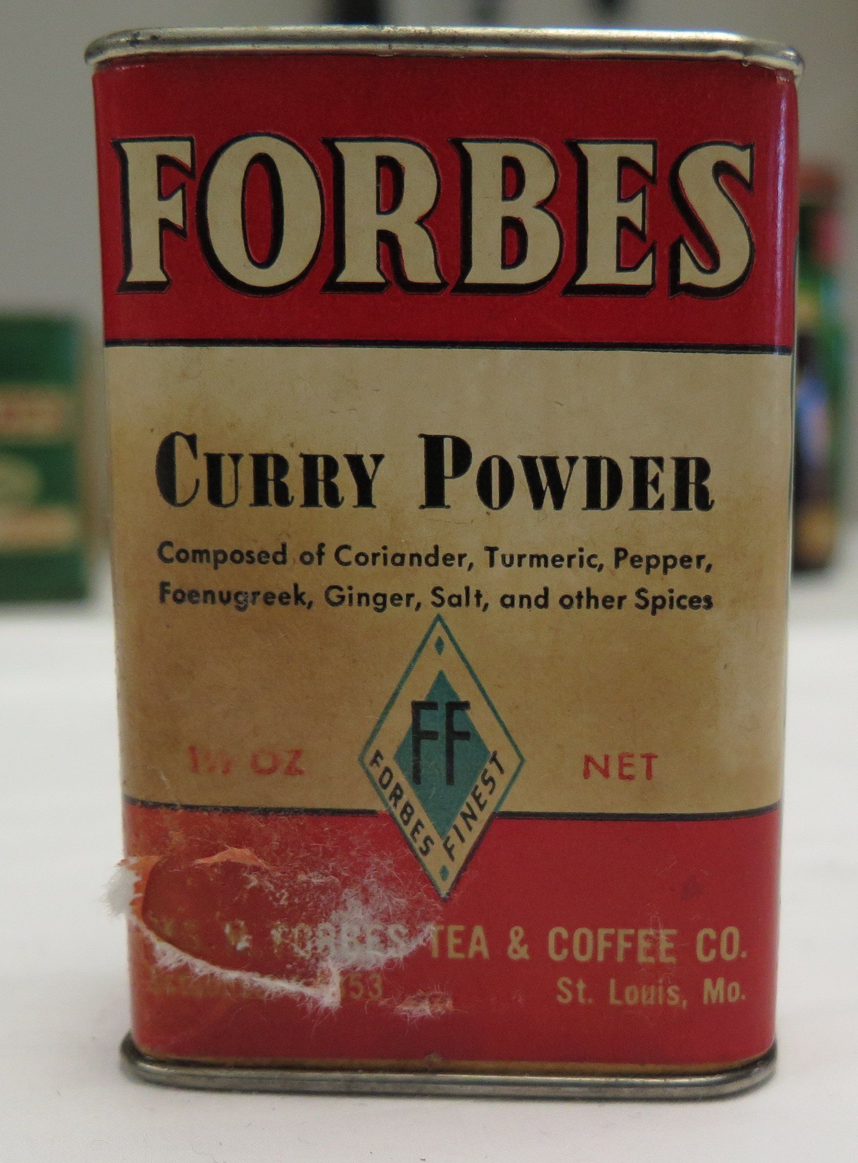 This is a metal tin of Forbes brand curry powder spice. The label is white in the middle and red on the top and bottom with black and white text on it. The tin measures 3" (h) x 2.25" (w) x 1.25" (d).