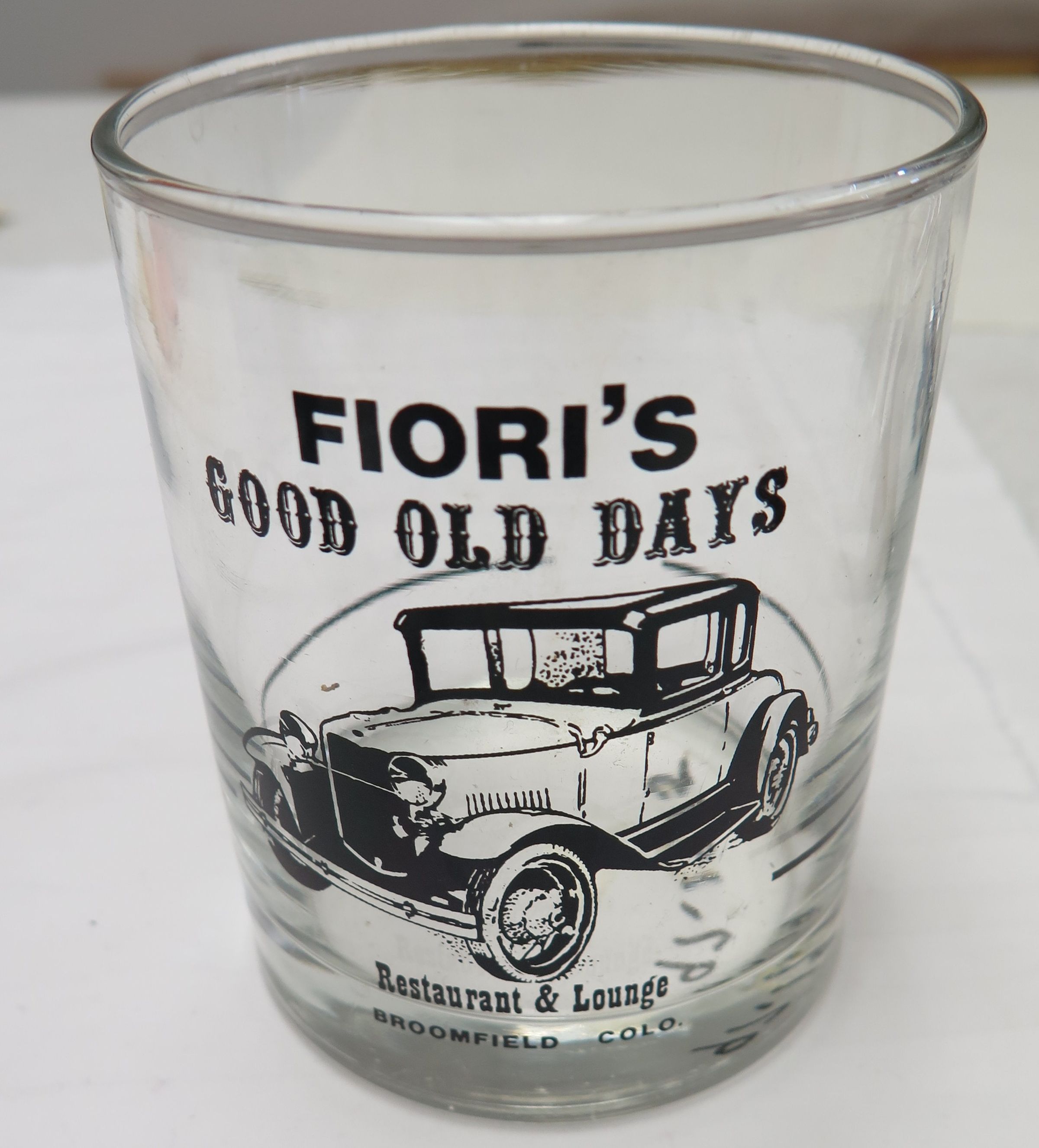 This is a souvenir drinking glass from Fiori's Lounge. 4"(H) x 3"(Dia) It features an image of a 1920's automobile and the words: "FIORI'S GOOD OLD DAYS".Collection