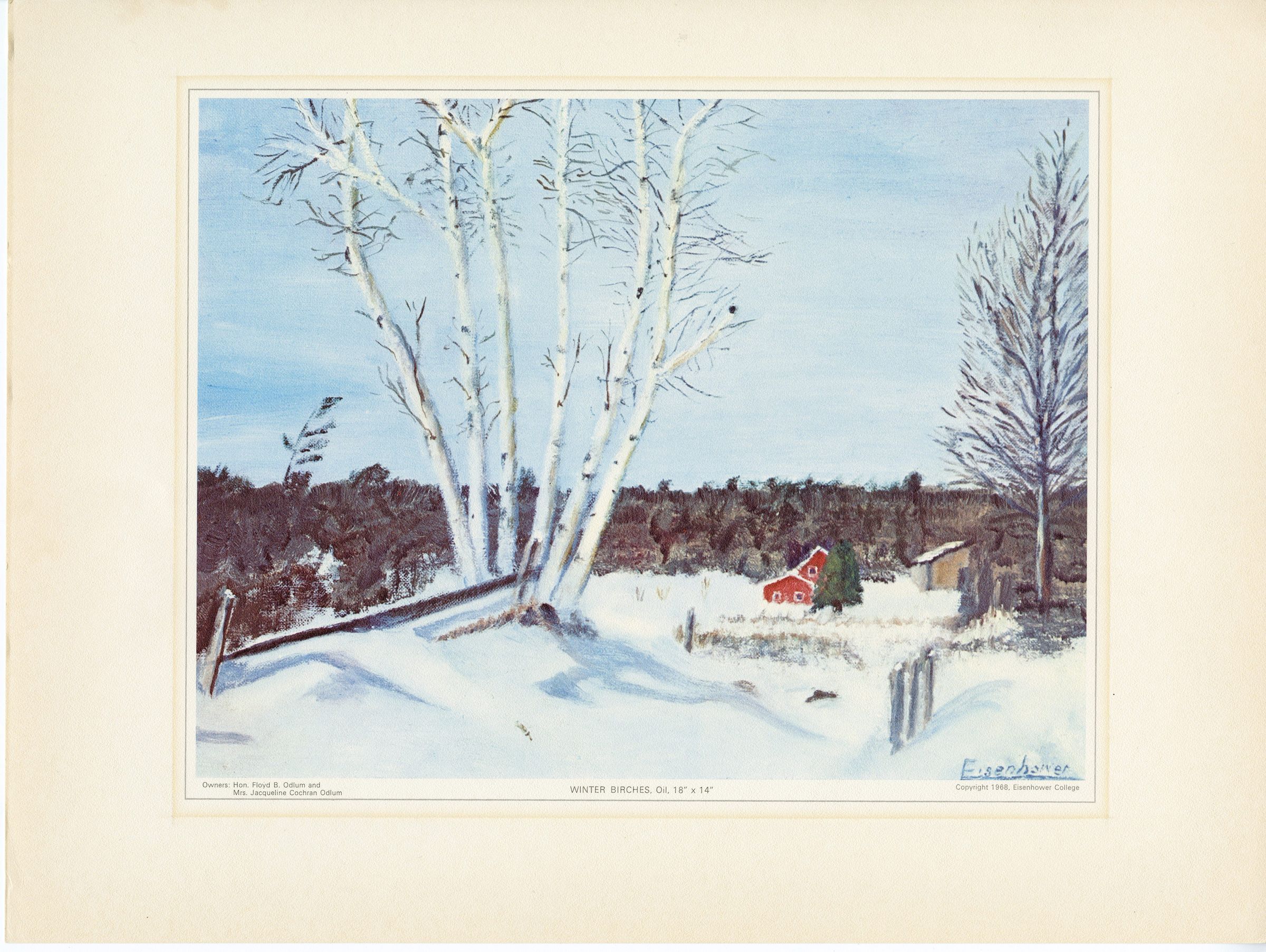 A print of an oil painting by Dwight D. Eisenhower, titled "Winter Birches". The original painting's dimensions are 18" x 14". Underneath the image, it states that the owner of the painting is Hon. Floyd B Odlum and Mrs. Jacqueline Cochran Odlum. Depicted is are white birch trees surrounded by snow and a split rail fence to the left, as the subject in the foreground. A one story and a two story red building are seen in the distance along with a beige colored outbuilding (barn?) In the background, there are hills with trees. The artist's signature is seen below in the bottom right corner.Artwork Details