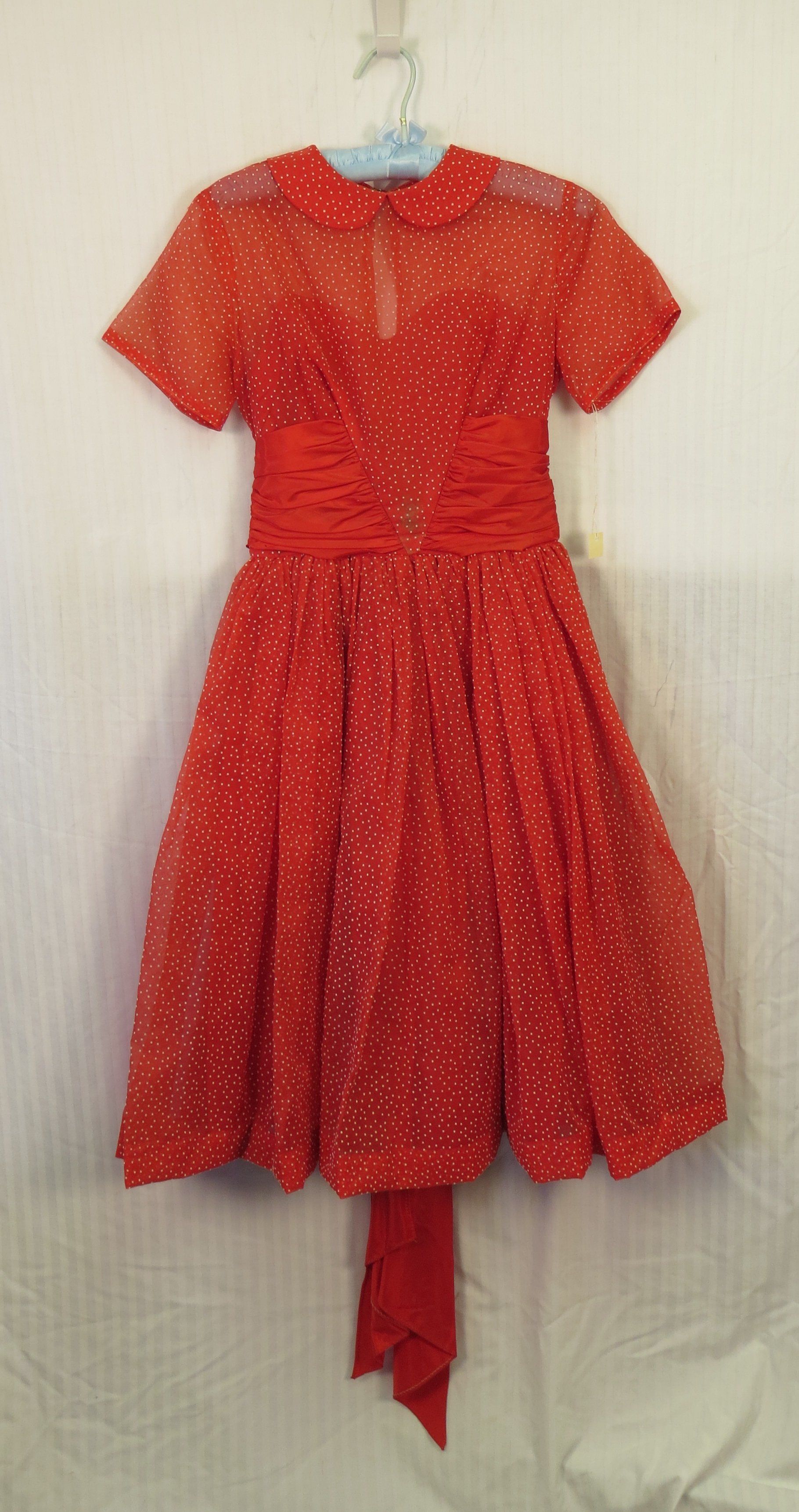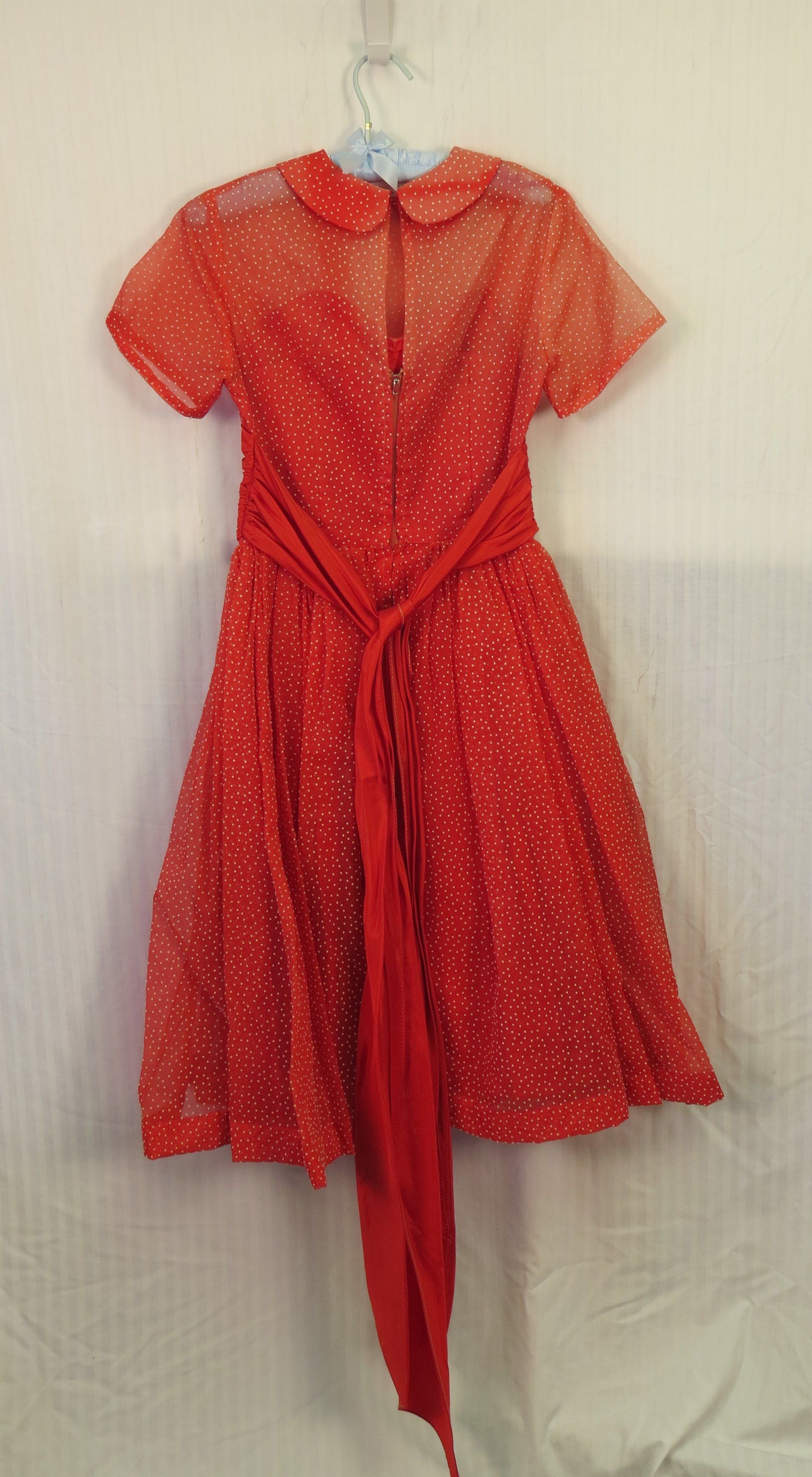 This is a red knee-length, short-sleeved dress with white polka dots all over it. The dress ties at the waist. The dress measures 21" (w) x 41" (l).