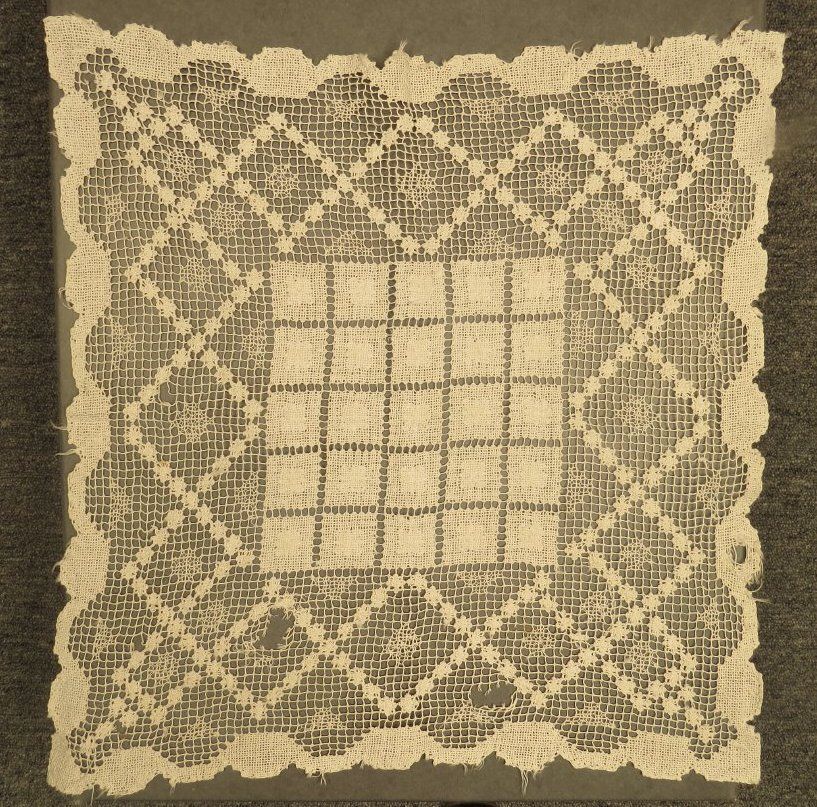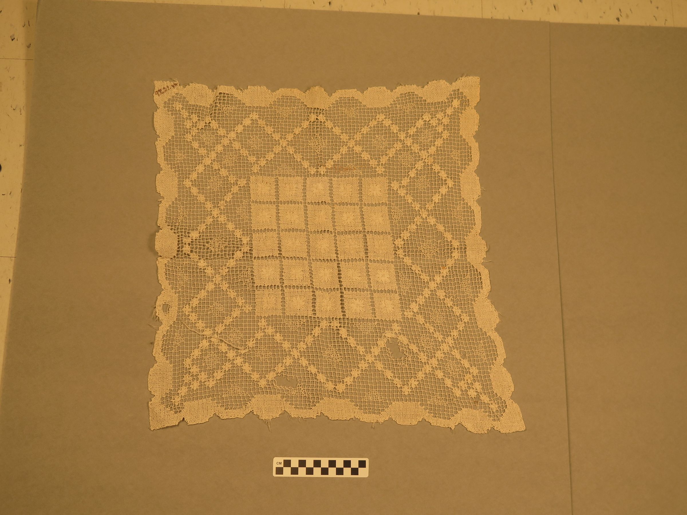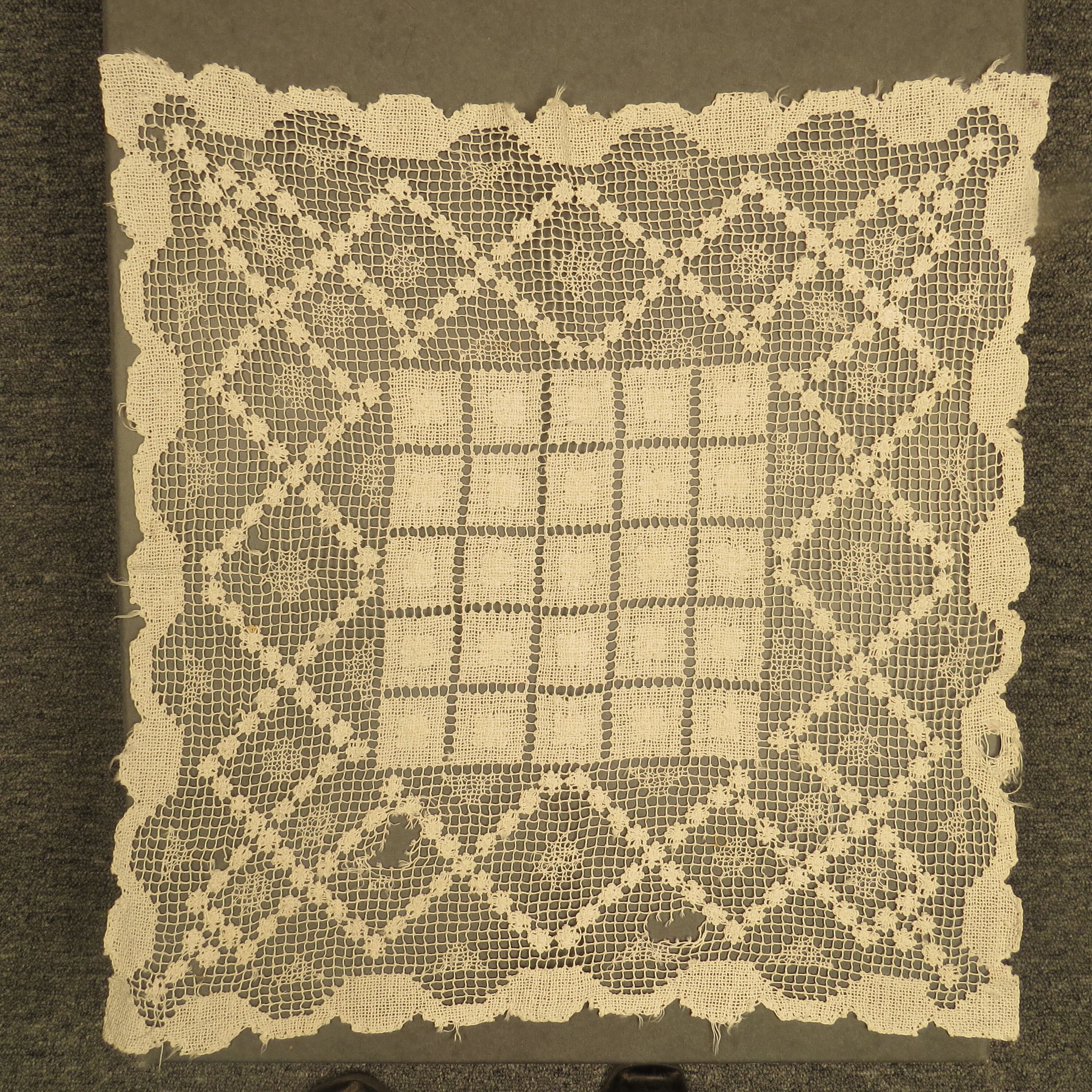 White square crocheted doily that has scalloped edges. The inside has a geometric box design. The doily measures 20" (w) x 20" (l).