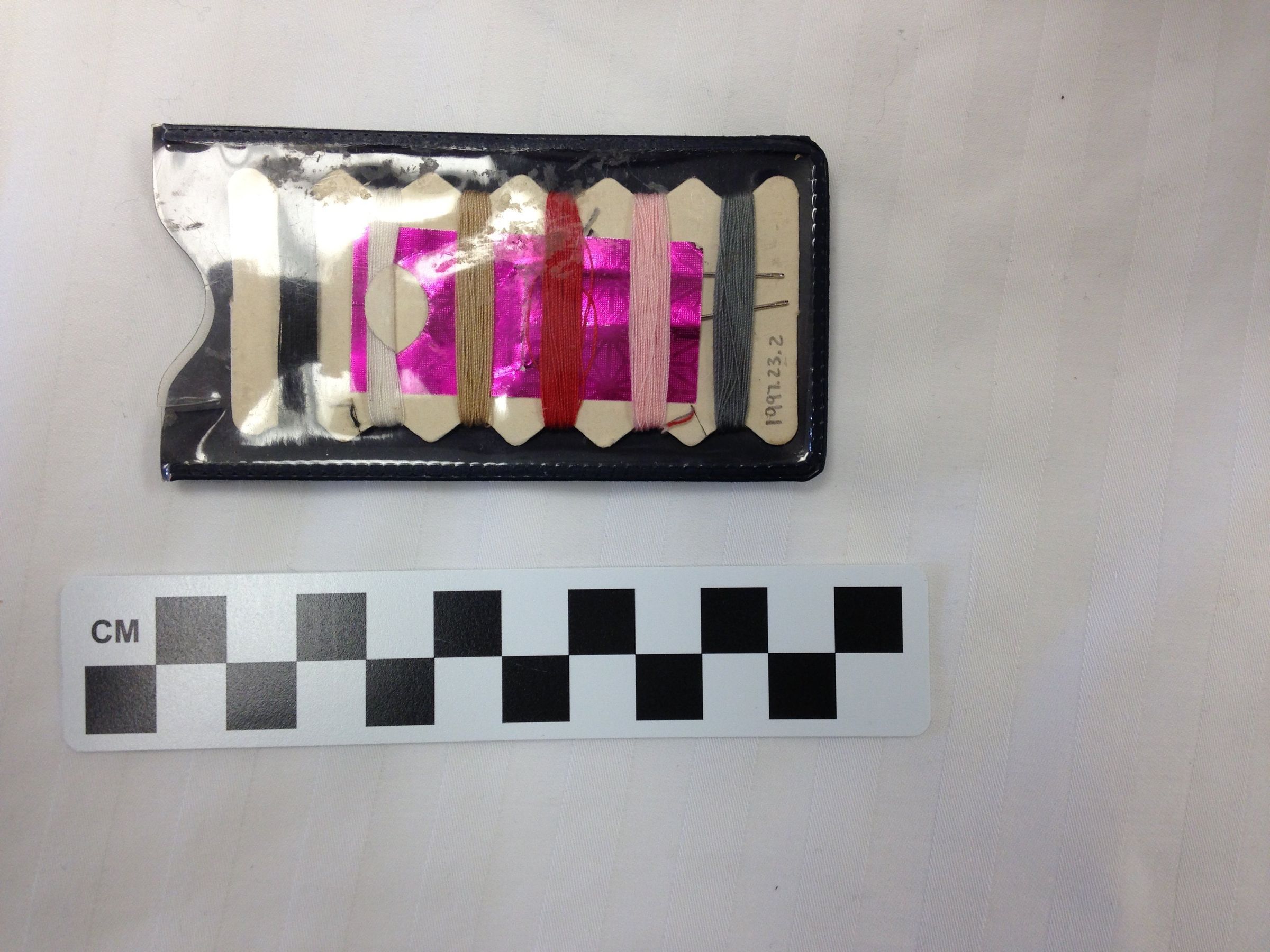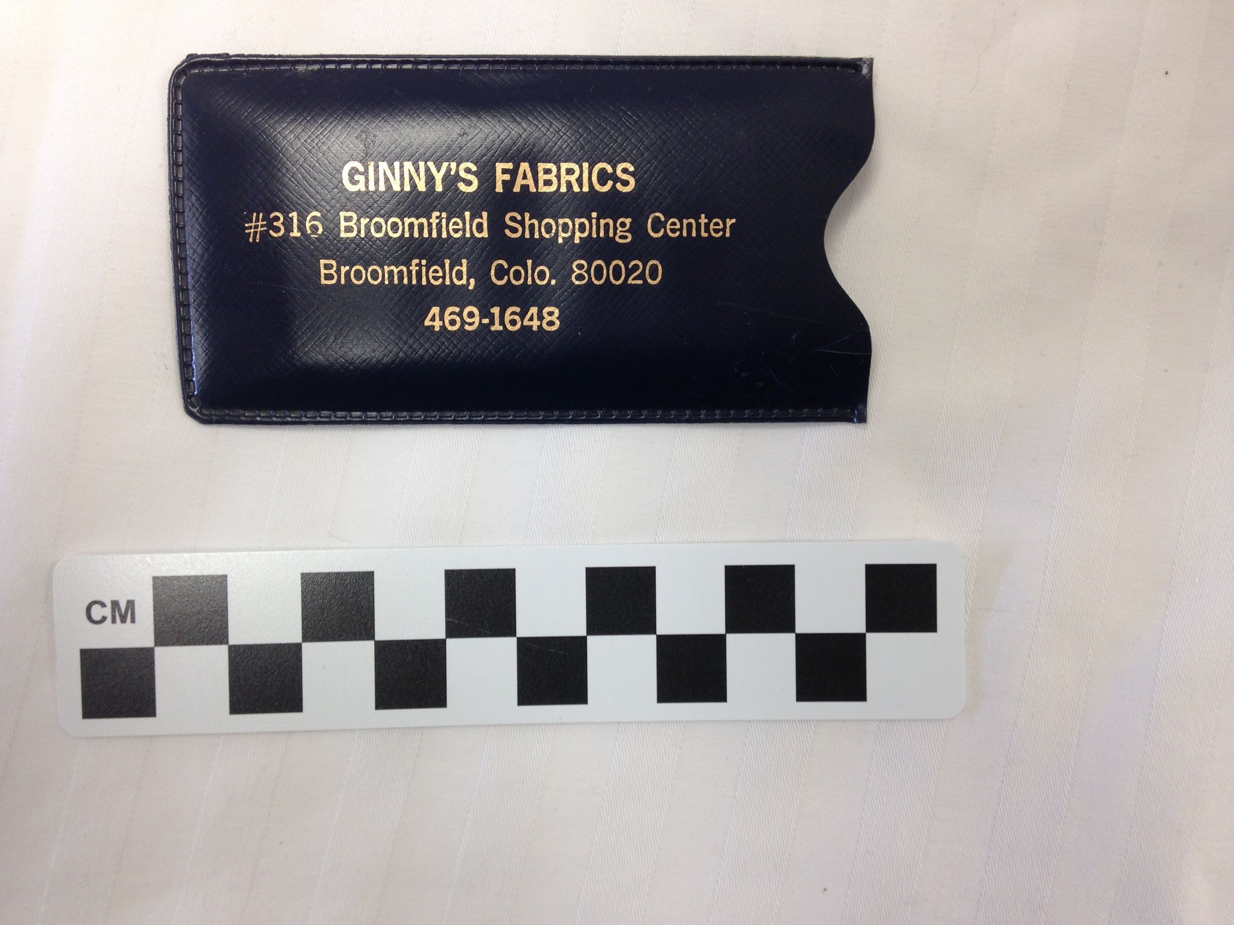 This is a sewing kit inside of a plastic sleeve. The sleeve is clear on one side and blue on the other. The blue side of the sewing kit sleeve has gold text that reads. "Ginny's Fabrics/ #316 Broomfield Shopping Center/ Broomfield, Colo. 80020/ 469-1648". The sewing kit has a piece of cardboard with 6 colors of thread and 2 needles inside. The sewing kit measures 2" (w) x 3.75" (l).
