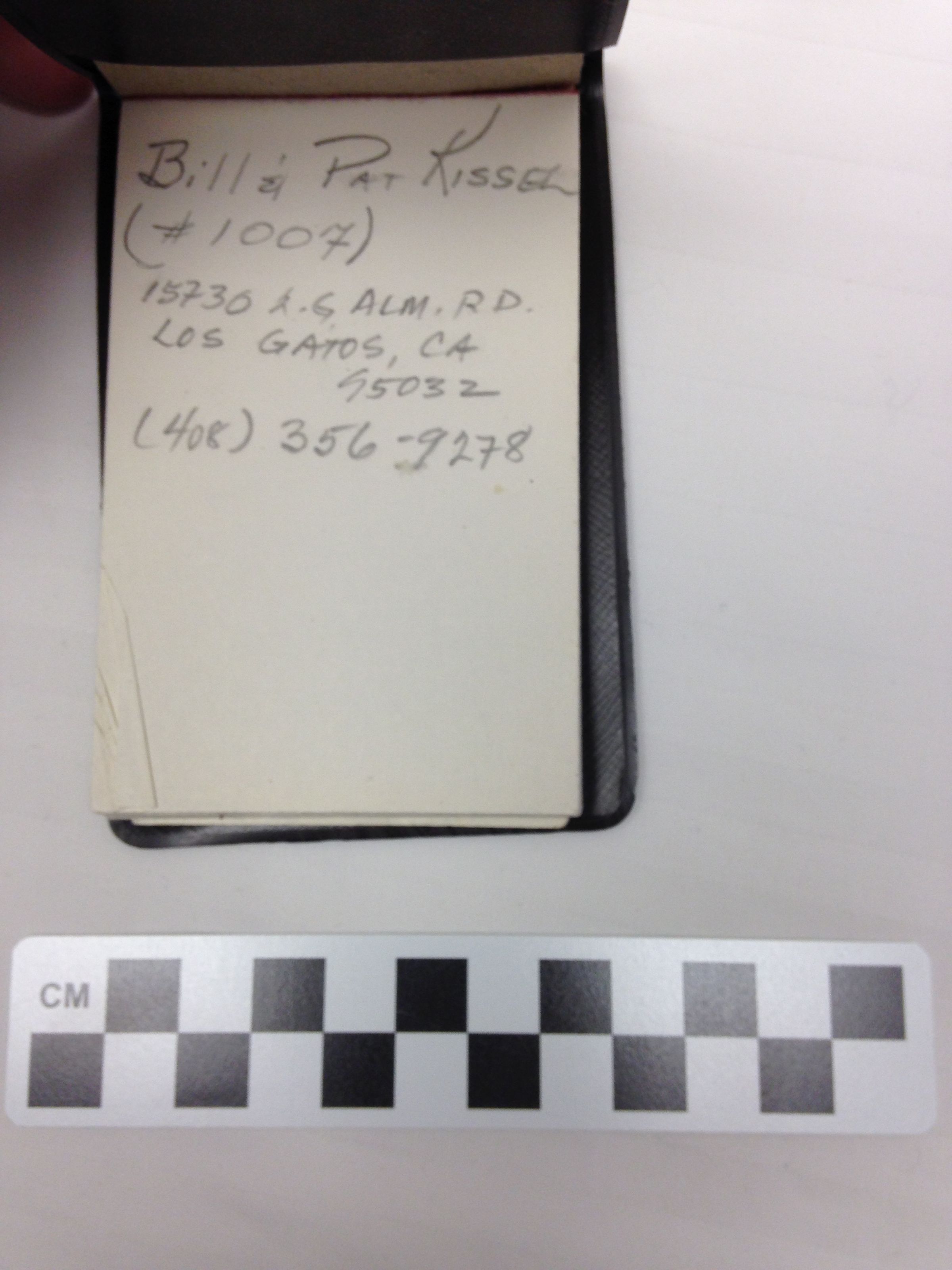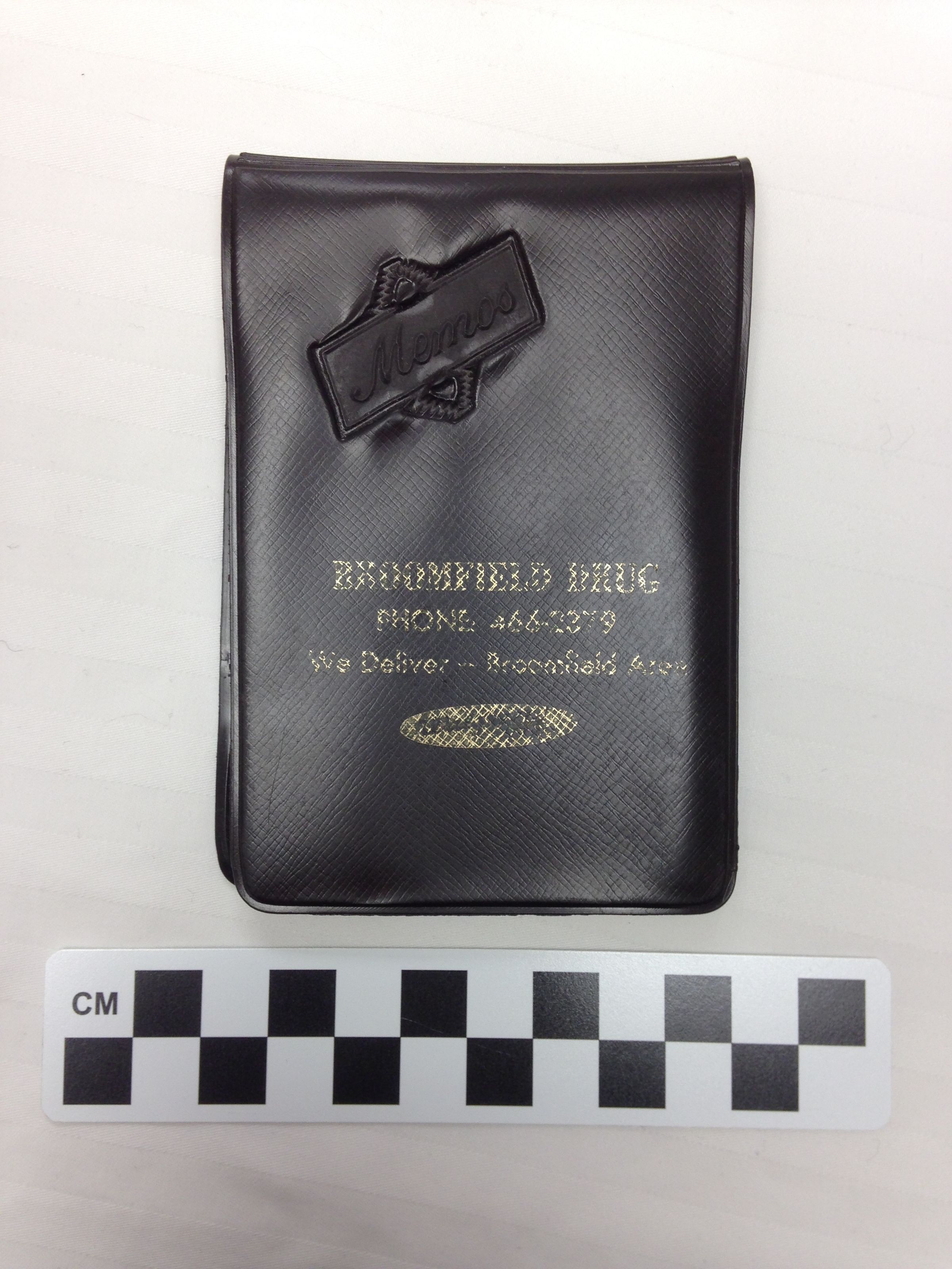 This is a notepad with a brown plastic cover. The cover has gold text on the front that reads, "Broomfield Drug/ Phone 466-2379/ We Deliver- Broomfield Area/ Walgreens". There is a note on the last page of the notepad that contains contact information for "Bill & Pat Kissel". The notepad measures 0.25" (h) x 3" (w) x 4.5" (l).