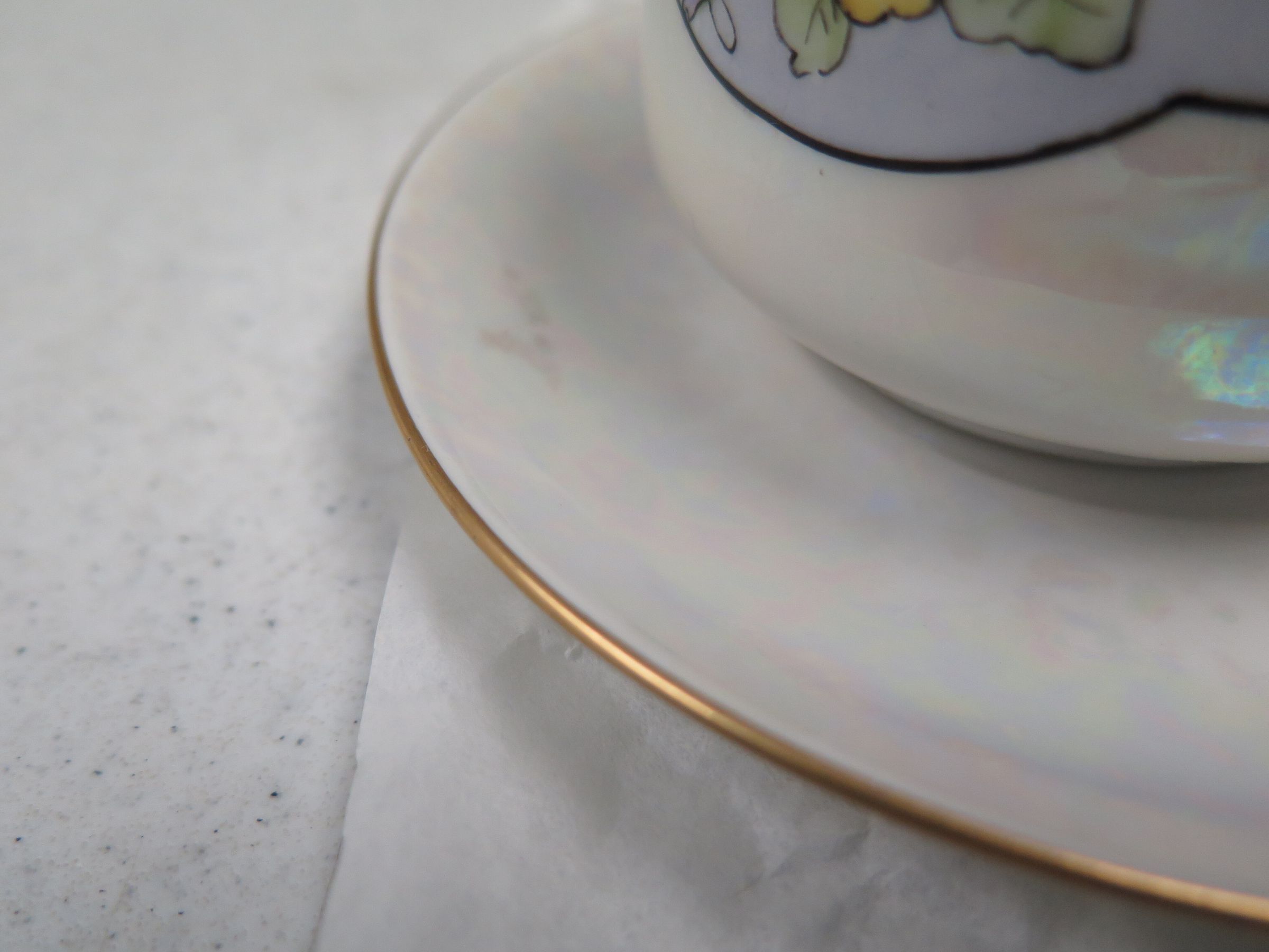 This is a set of 3 cups and saucers. The cups are white and pink or purple with a pink or purple floral pattern and gold handle. They measure 2.25"(h) x 4" (w) x 3.5" (l). The saucers are white with a gold rim. They measure 0.5" (h) x 5.5" (d).