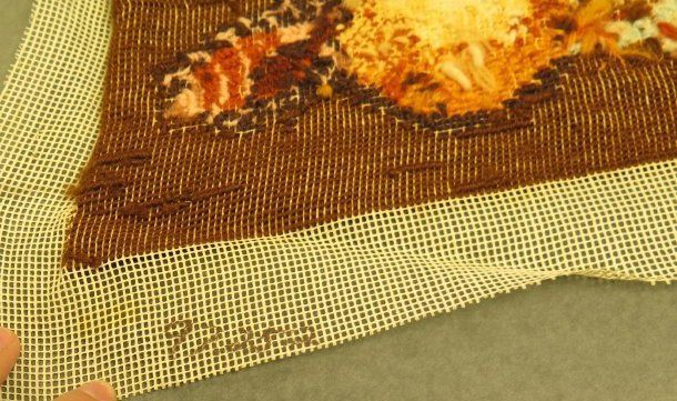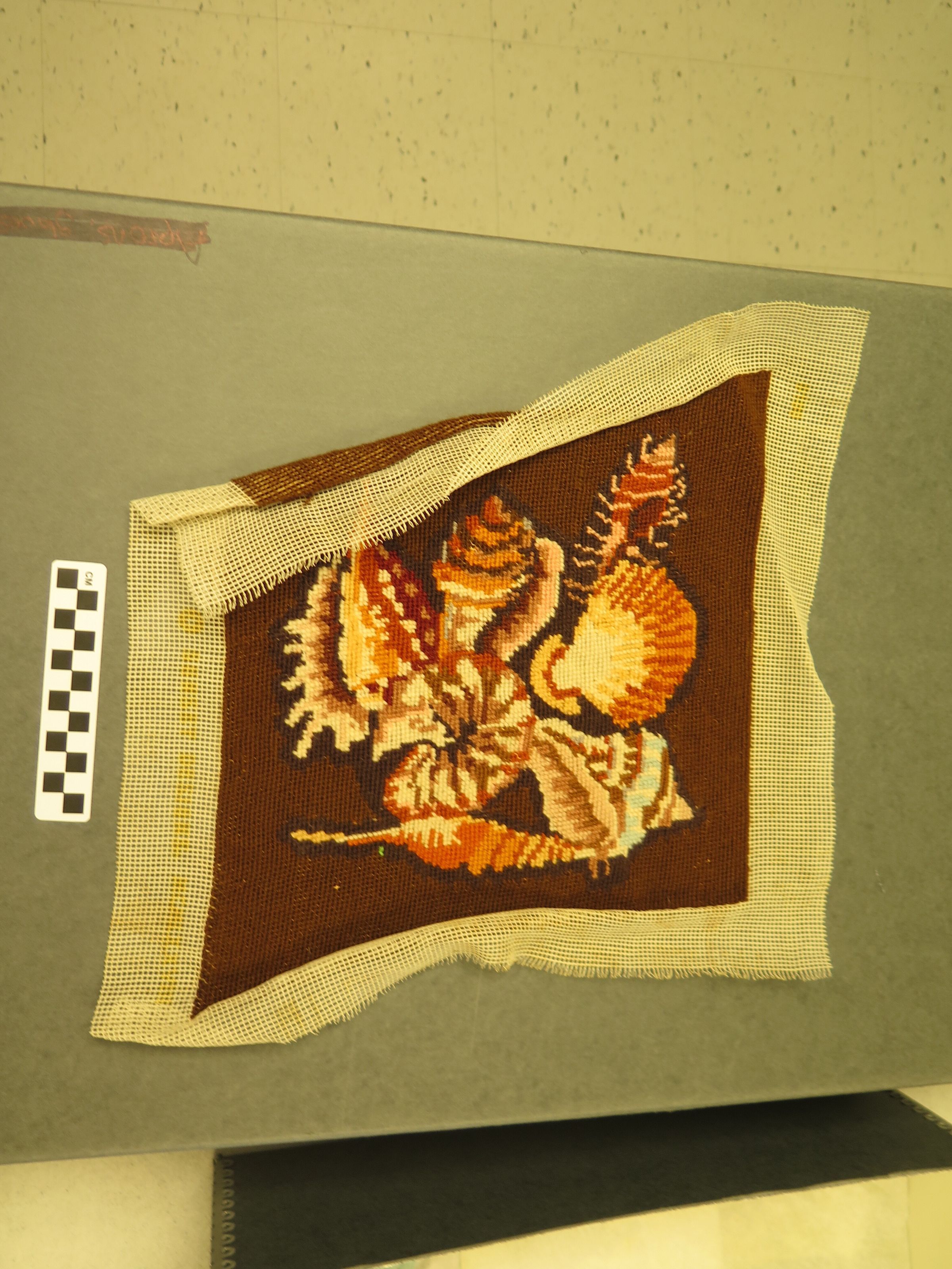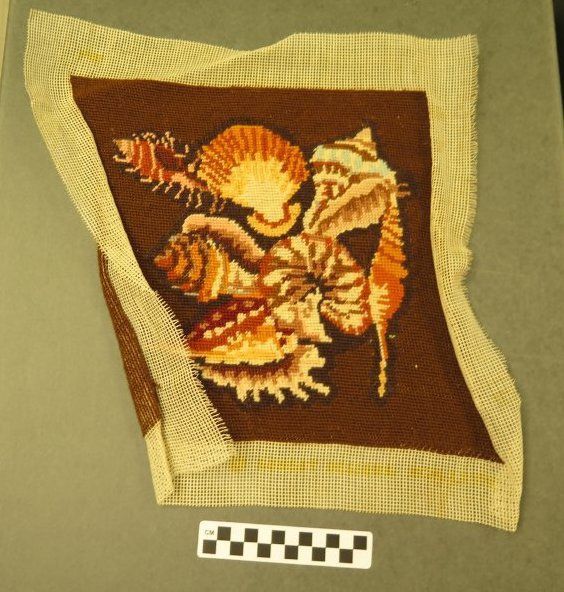 This is a latch hook with a brown background and pink, blue, orange, and white sea shells on the front. The latch hook measures 15" (w) x 15" (l).Collection