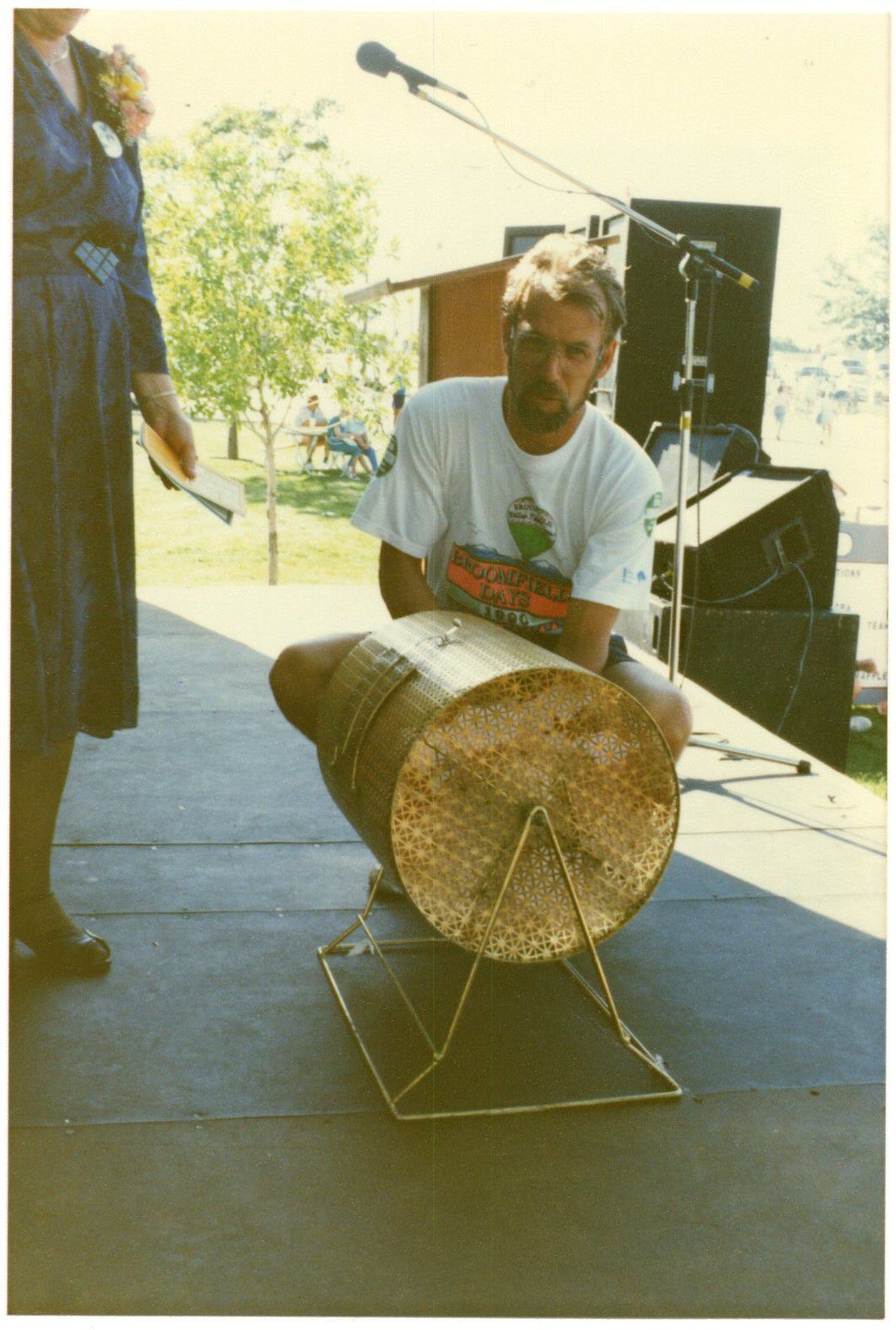 Item is a colored photograph taken during the 1990 Broomfield Days celebration. The photo centers around Mayor Robert Schulze, who is wearing a shirt that reads "Broomfield Days 1990" with the image of a hot air balloon floating above the mountains. He is crouching behind a metallic cage-like cylinder that raffle tickets can be pulled out of. He is standing on a stage, and half of another person wearing a blue dress is also visible to the left of the picture. A microphone and speaker equipment make up the background of the photo. Schulze was elected as mayor in 1989, and his term ended in 1994.Photograph Details