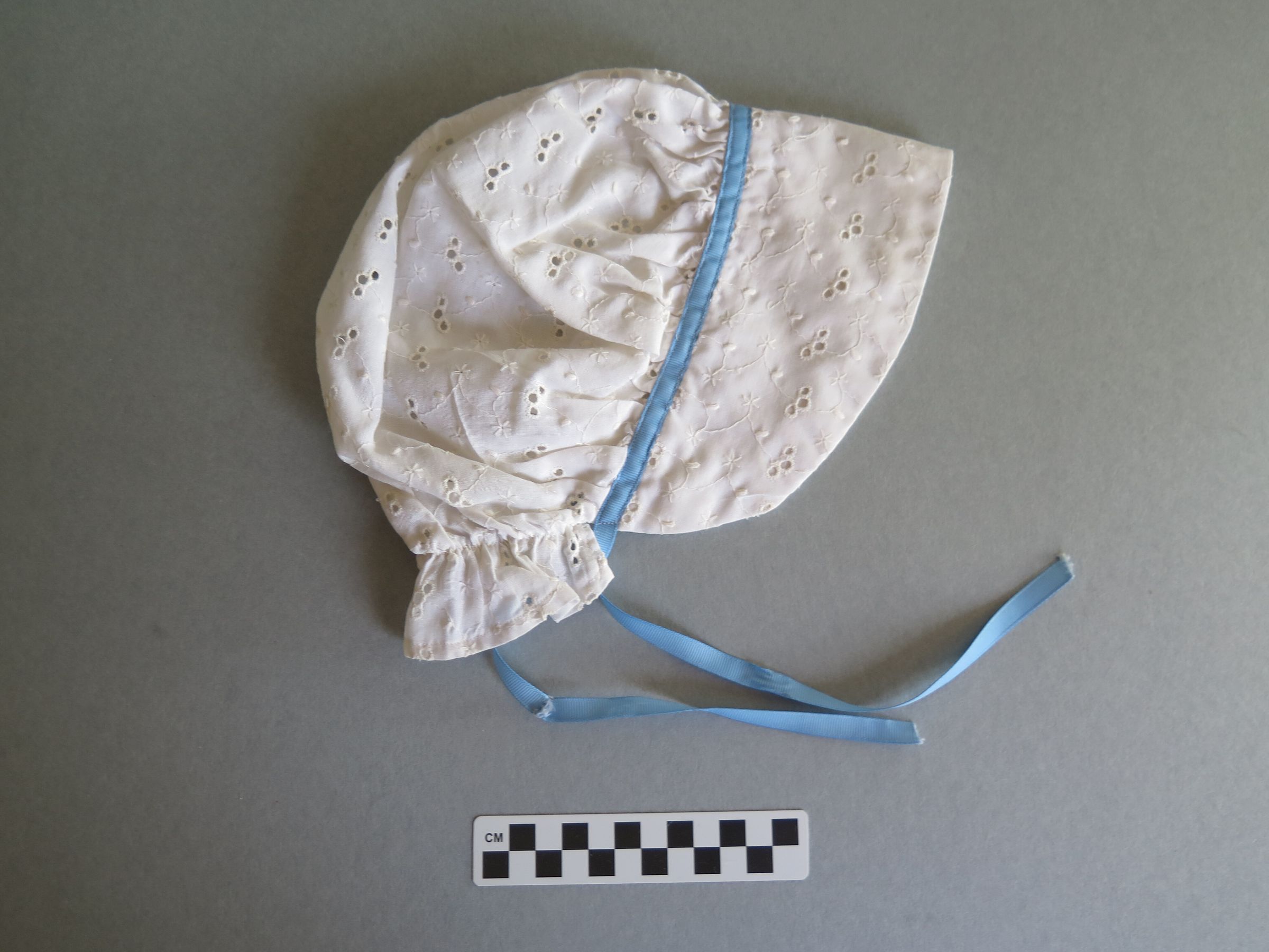 White cotton eyelet baby bonnet with light blue satin strings to tie it together that run through the top of the bonnet. The bonnet measures 9" (w) x 9" (l).