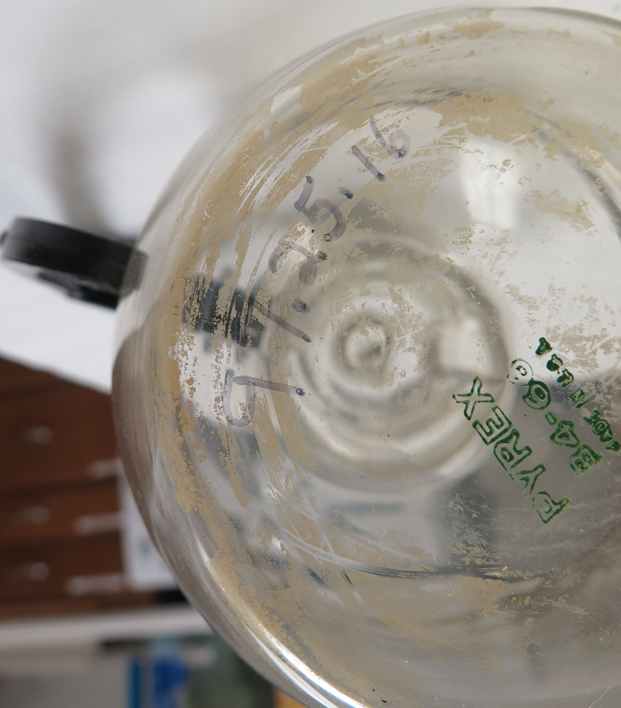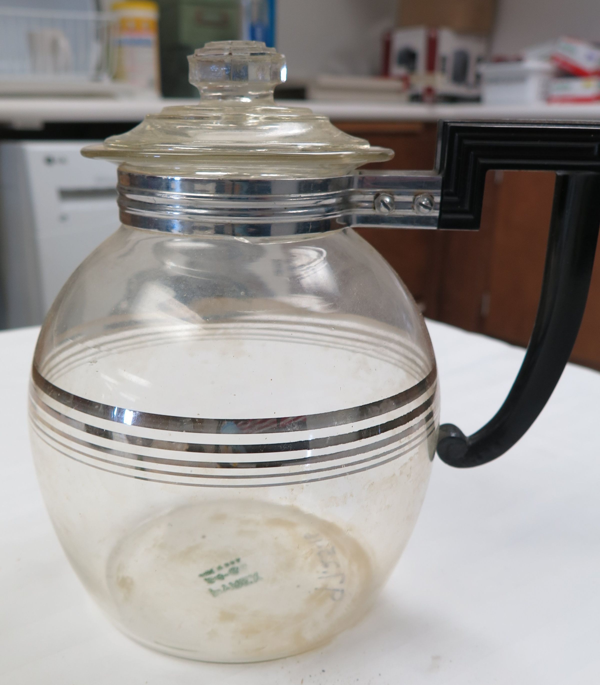 This Pyrex clear glass cofffee pot measures 7"(H) x 6.5"(W) x 4.5"(D). It has a black handle.