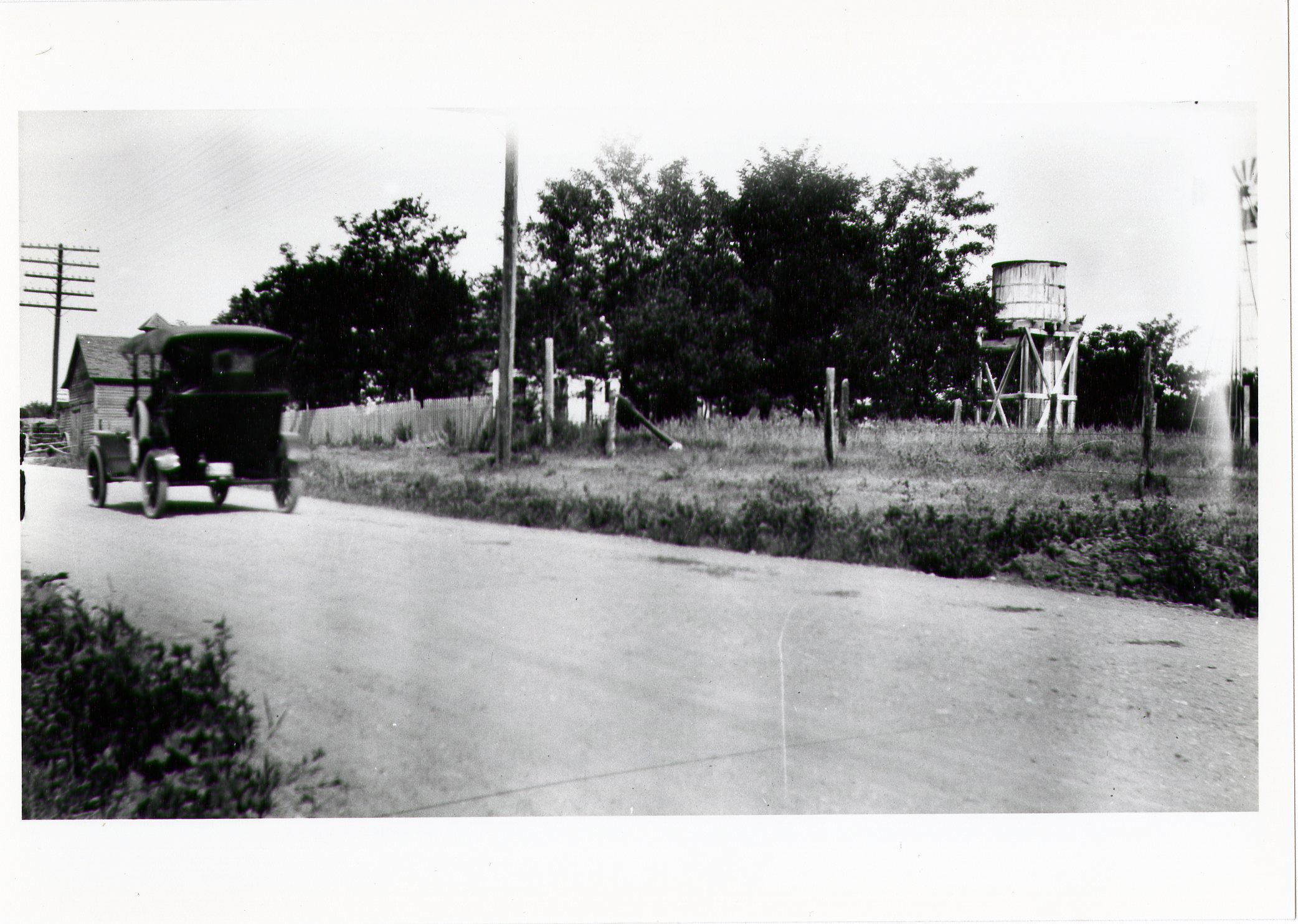 This is a black and white photo (not original but copied on modern photo paper) of what is believed to be the Crawford Family's car. ITs going down a road that is believed to be 120th. There is a thick tree line that is believed to be the Crawford Family farm. On the edge of the tree line is a wooden water tower and a windmill.