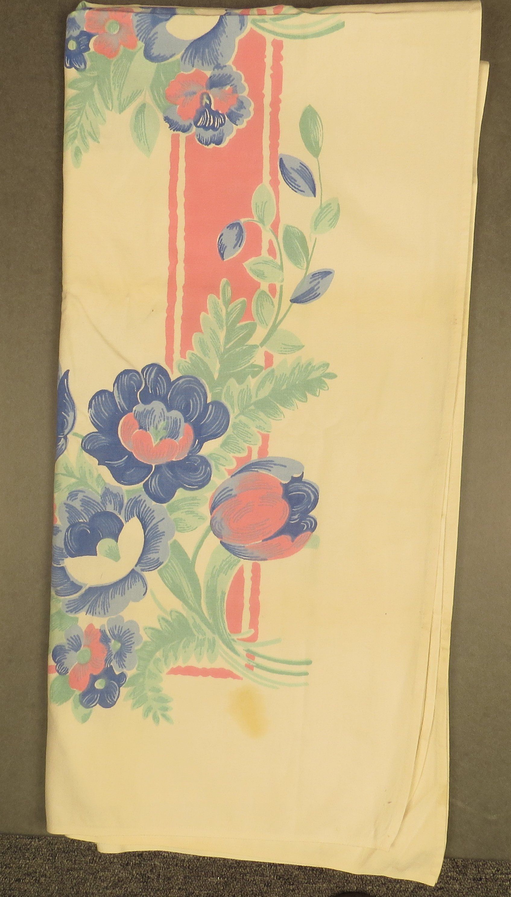 White tablecloth with pink border, blue flowers and green leaves. Tablecloth measures 7" (w) x 14" (l). Note: This was recommended for disposal by Megan Huelman in October 2013 (TTempleman 06/30/2017).