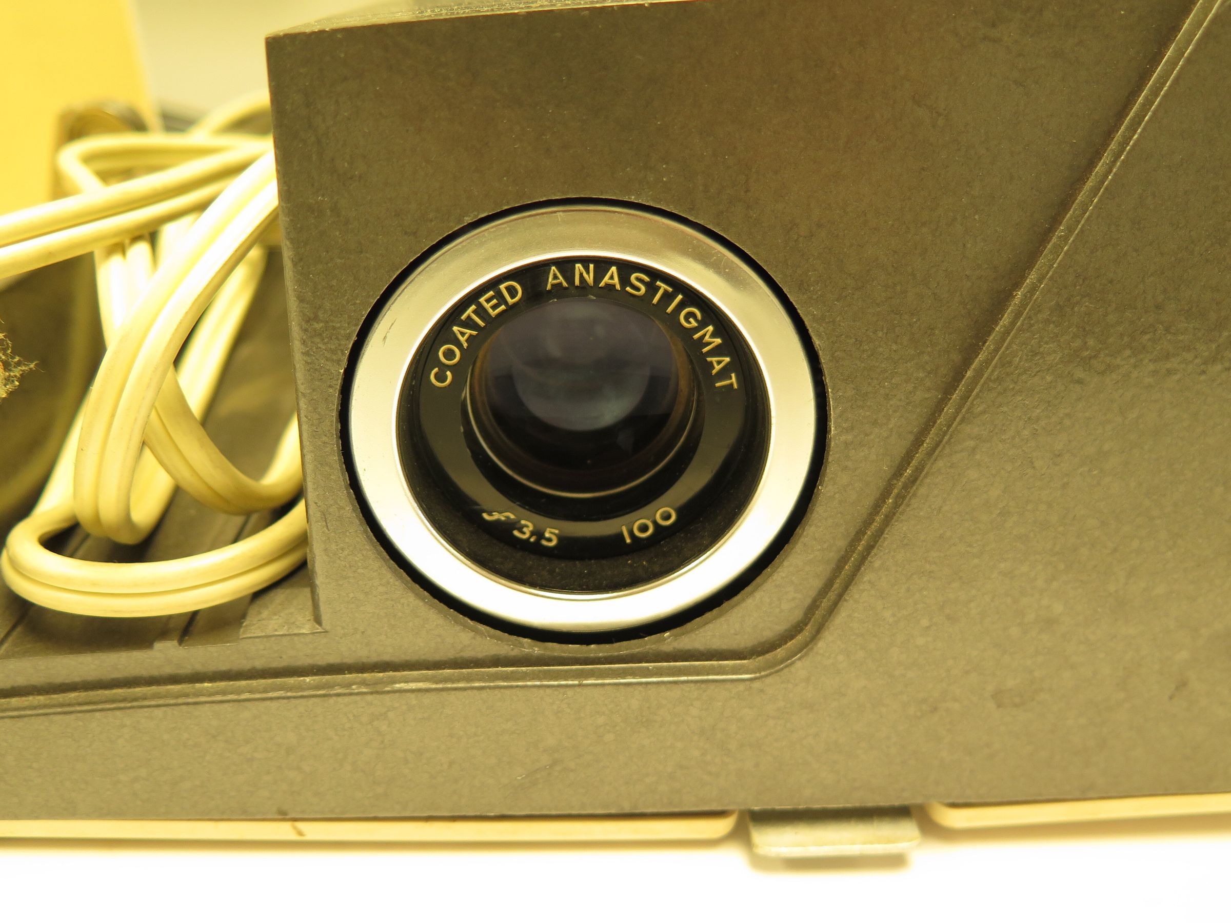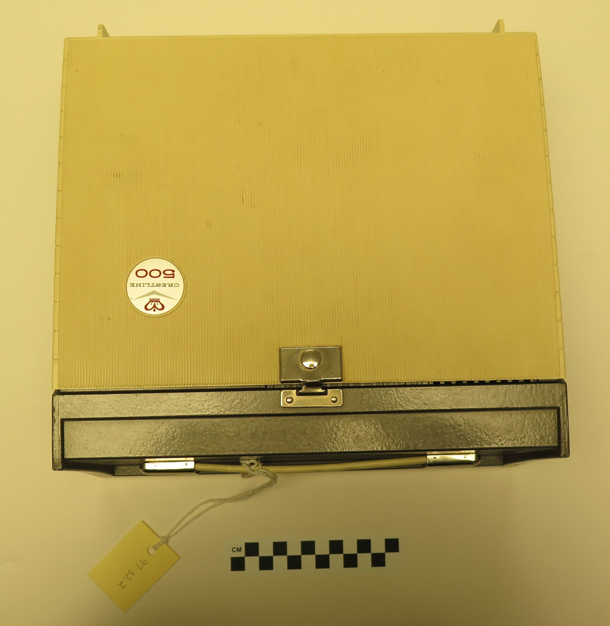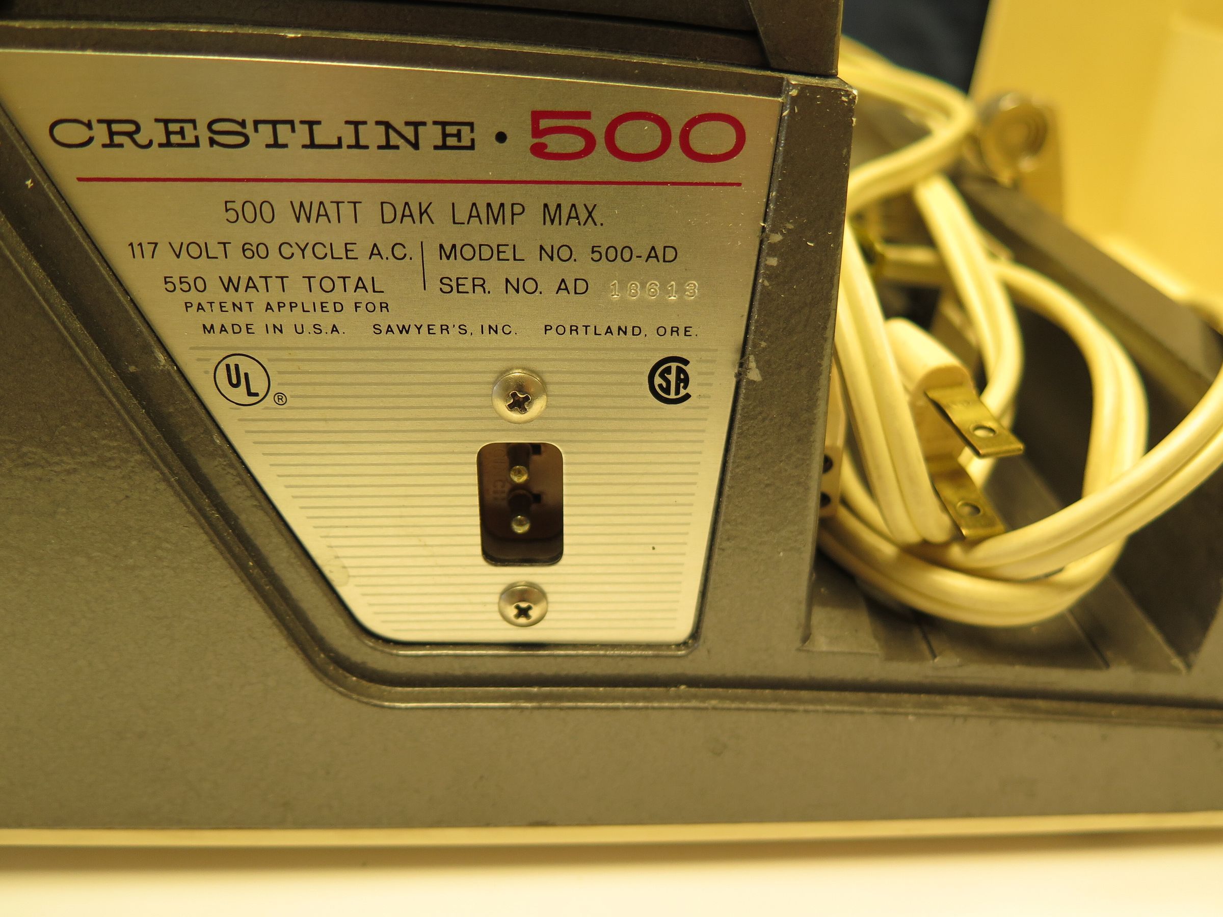 This is a Crestline 500 projector made by Sawyer's Inc. in Portland Oregon. The projector has a tan plastic case. The model number is 500-AD. The projector measures 5.25" (h) x 11" (w) x 10" (l).