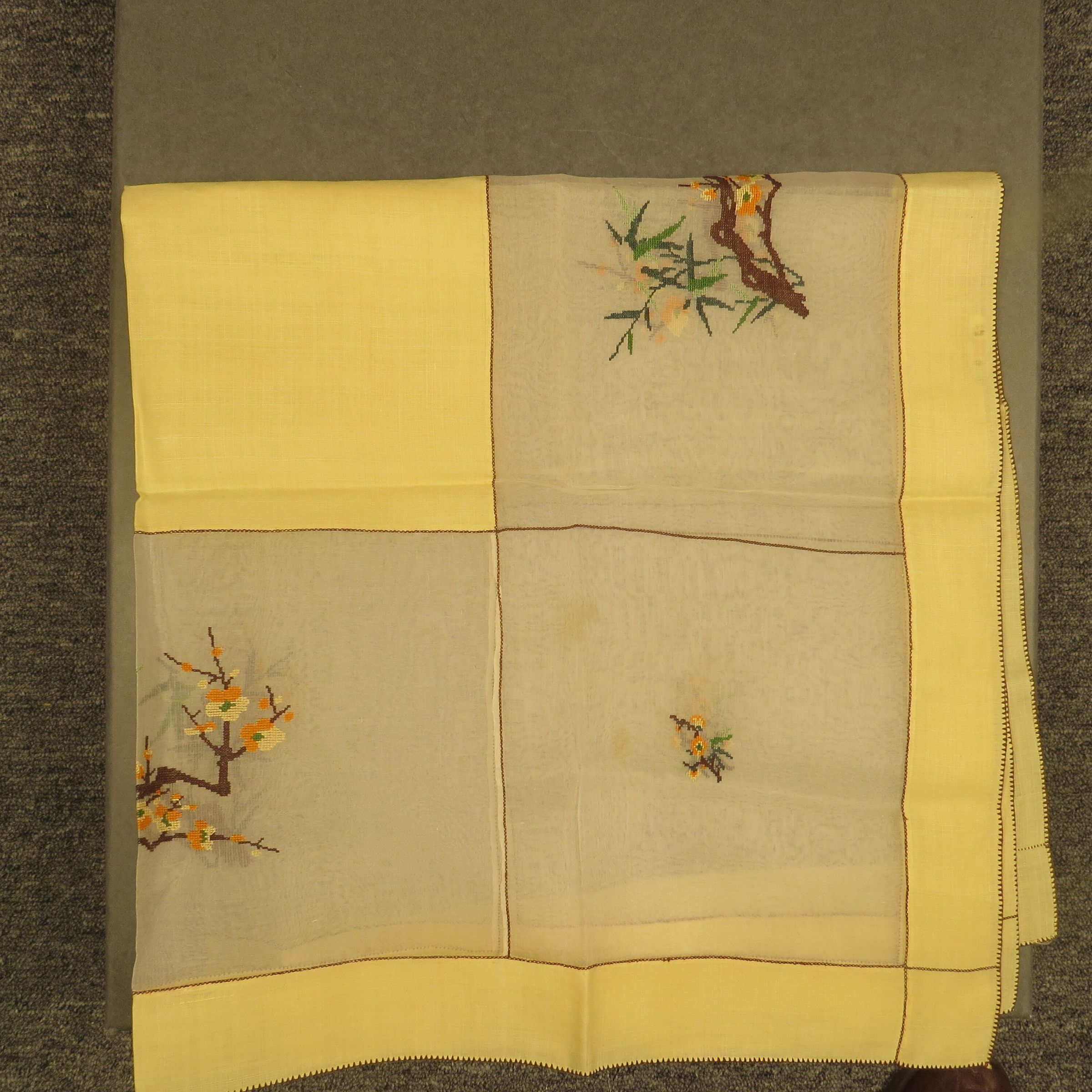 Yellow tablecloth with a block design. There mesh squares lining the border and floral embroidery done in the mesh. The trim is yellow. Tablecloth measures 9" (w) x 10" (l).
