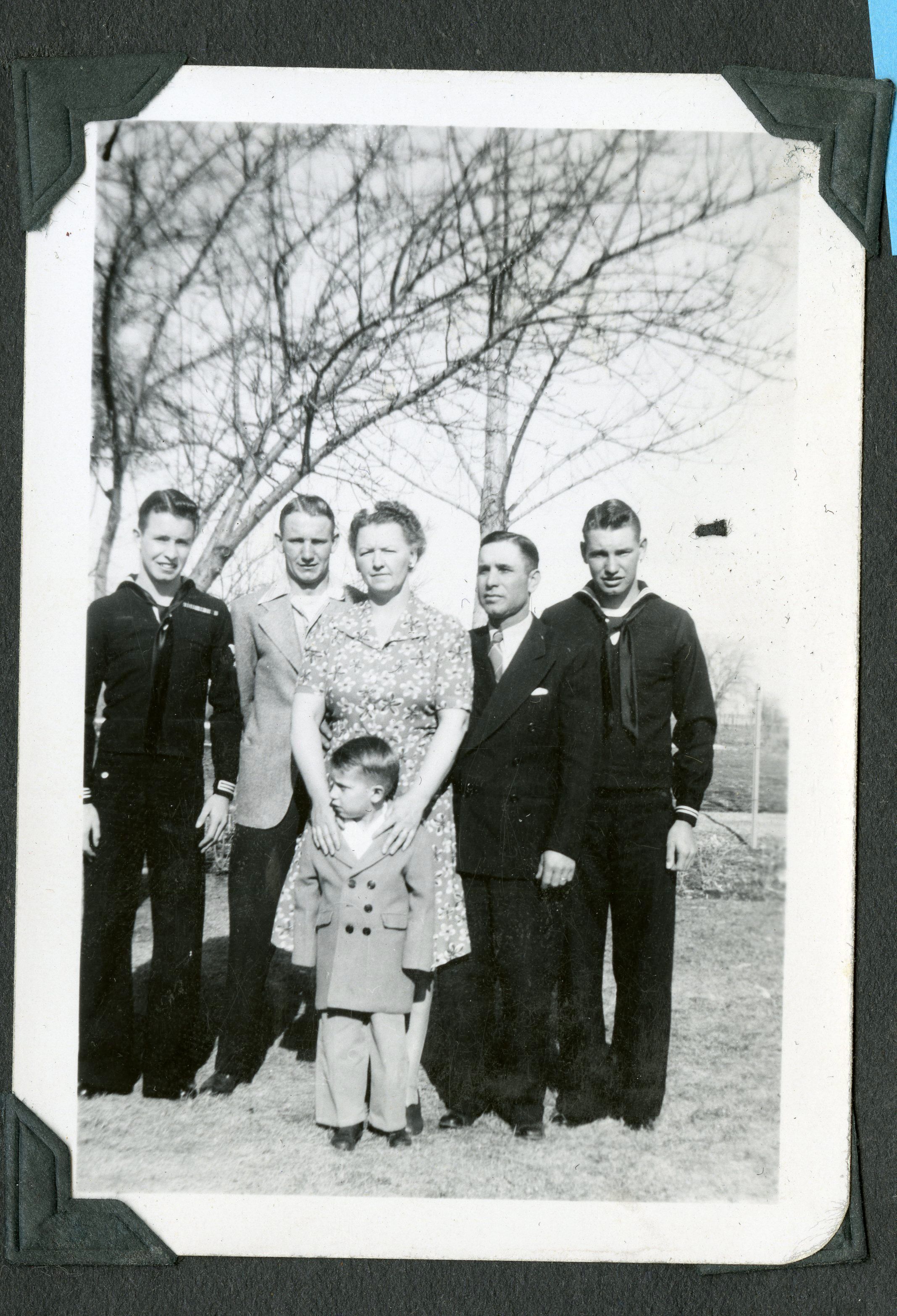 Black and white photo of six people. From left to right they are Clyde, Dale, Lib, Lester C, and Gib. Lester K is in front.