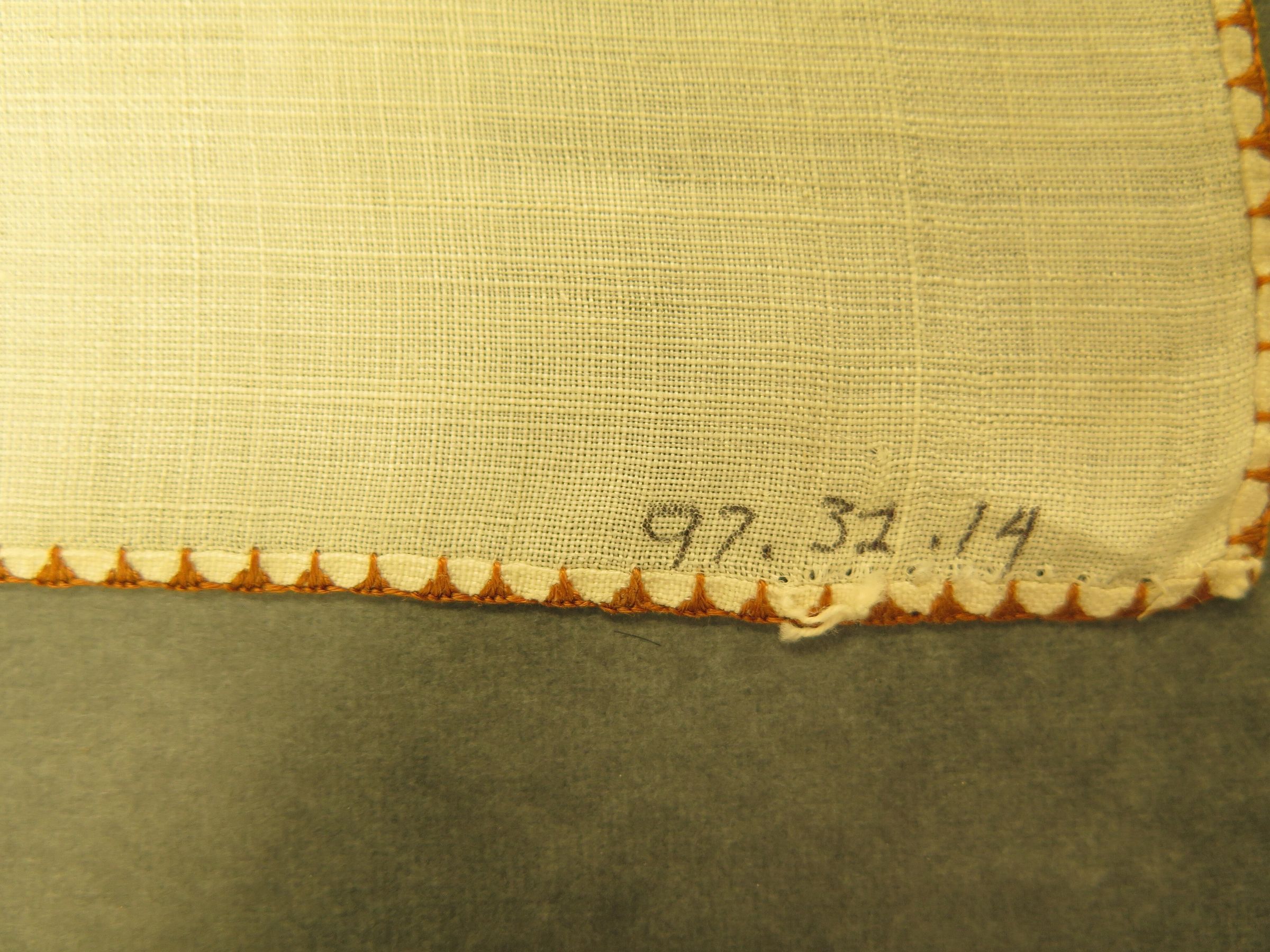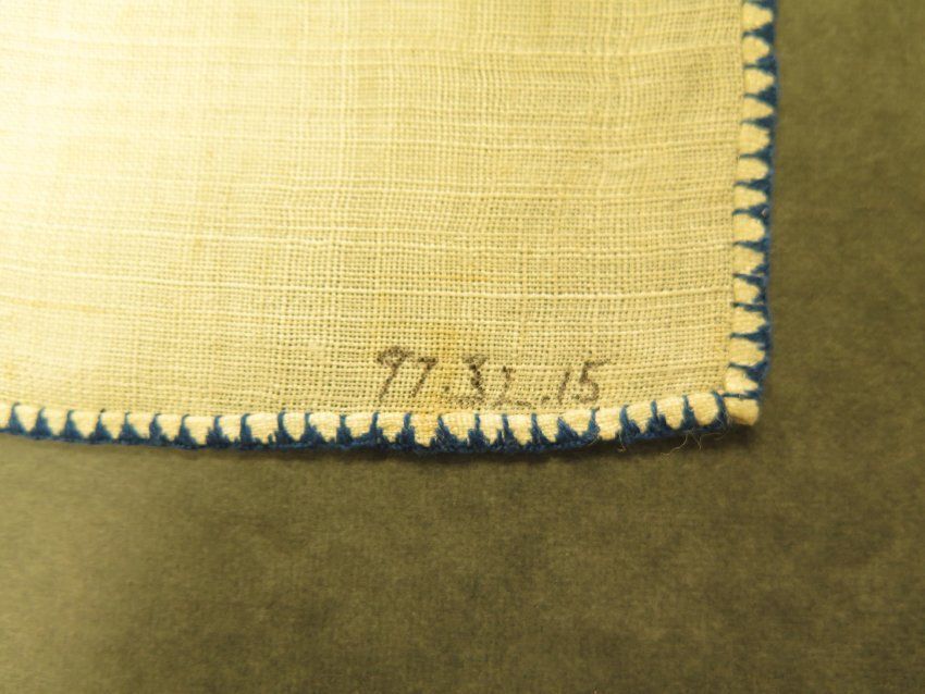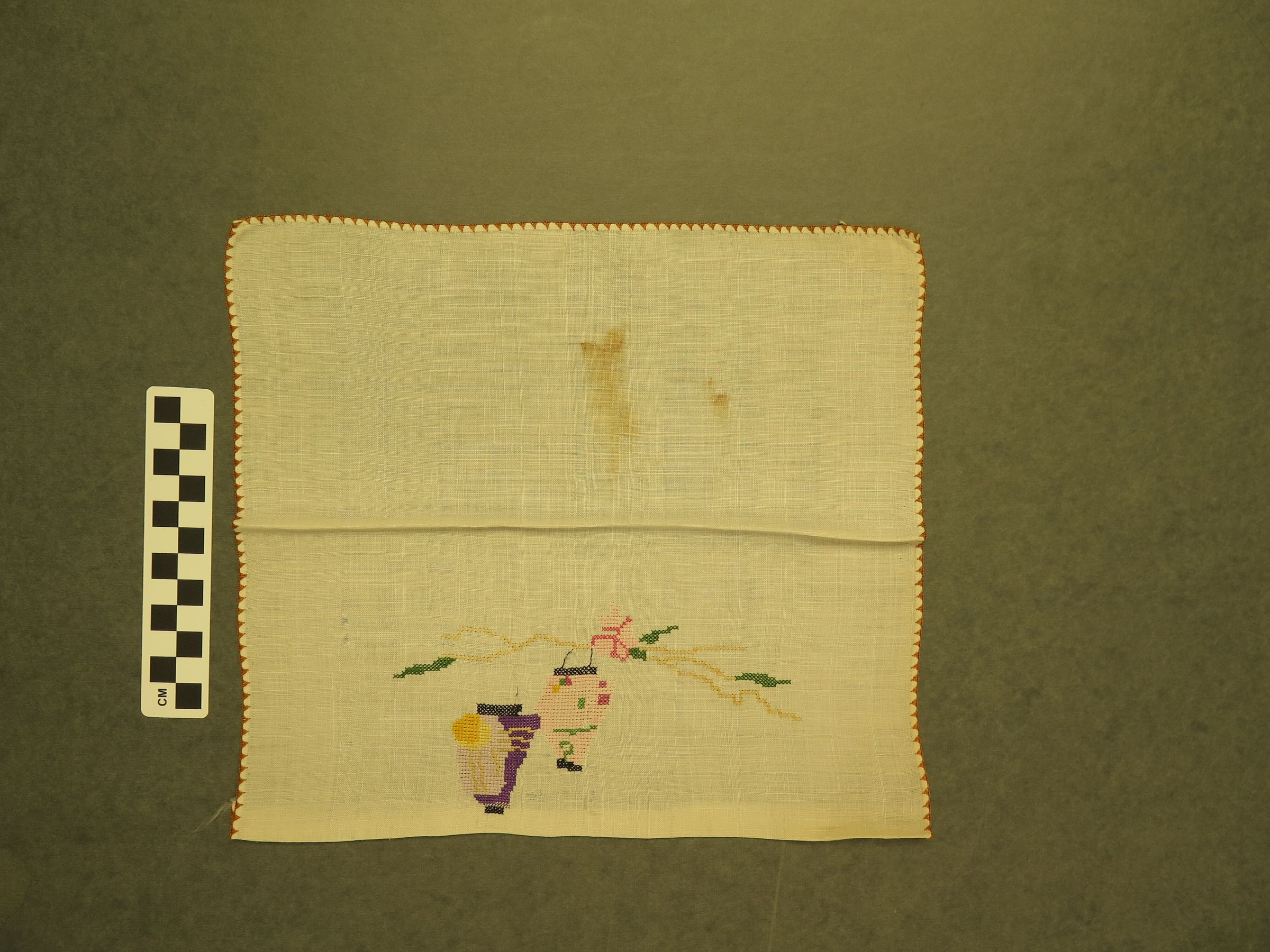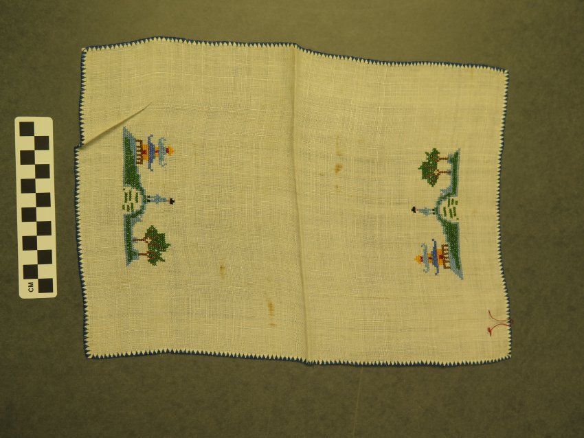 This is a white linen furniture scarf or decorative towel with the image of man in a hat standing on a bridge with a building and trees in the background. The furniture scarf has blue trim on the edges. The furniture scarf measures 9" (w) x 12.5" (l).Collection