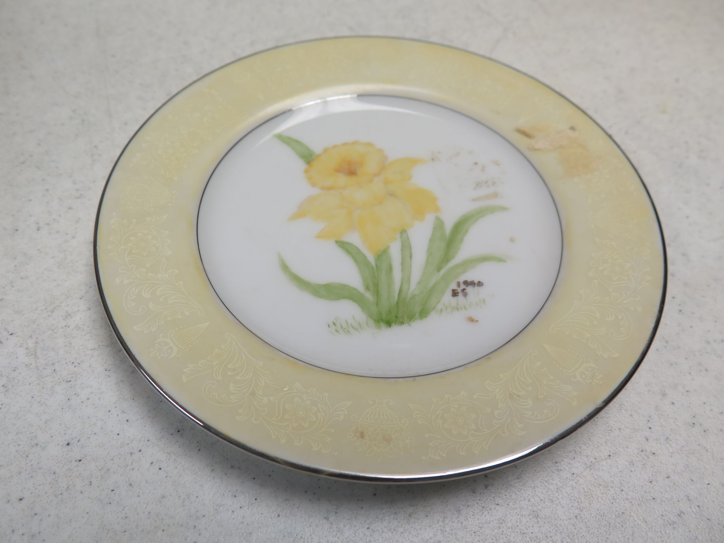 This is a Lovelace brand plate with a yellow and silver rim and a yellow flower in the center. The plate measures 0.5" (h) x 6.5" (dia).
