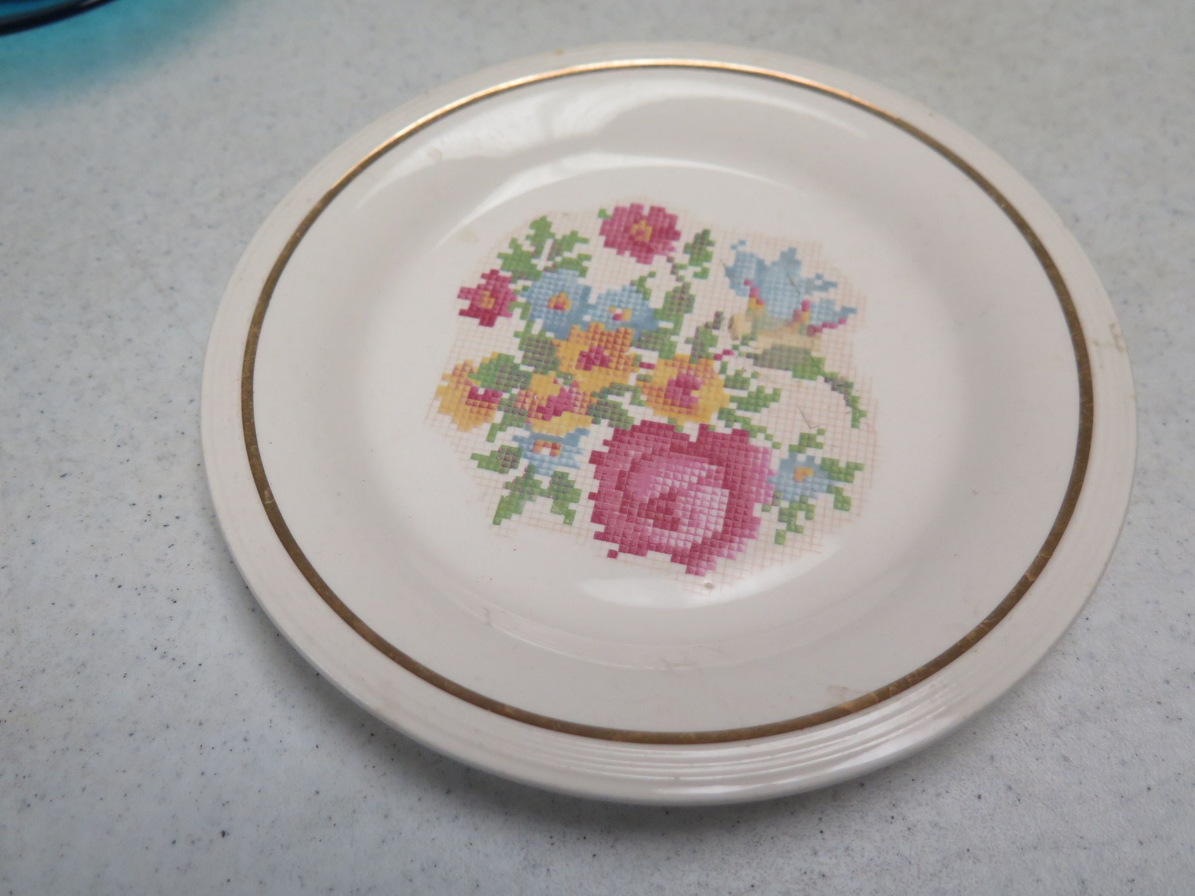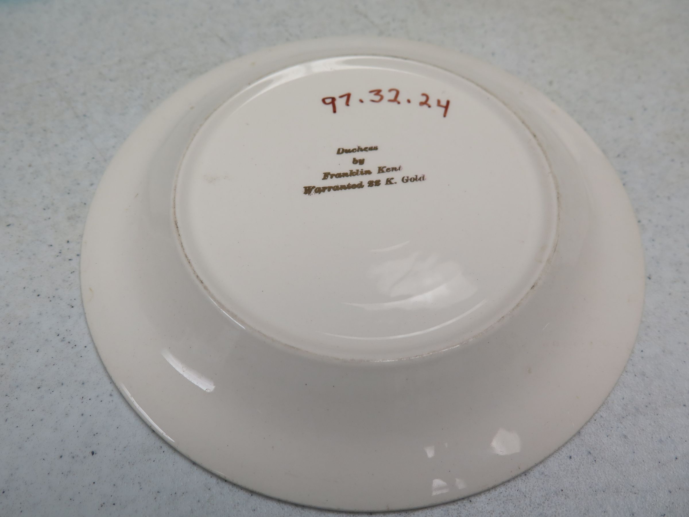 This is a white plate with a gold stripe near the rim and the image of embroidered flowers in the center. The plate is the Duchess by Franklin Kent. The plate measures 0.5" (h) x 7.25" (dia).