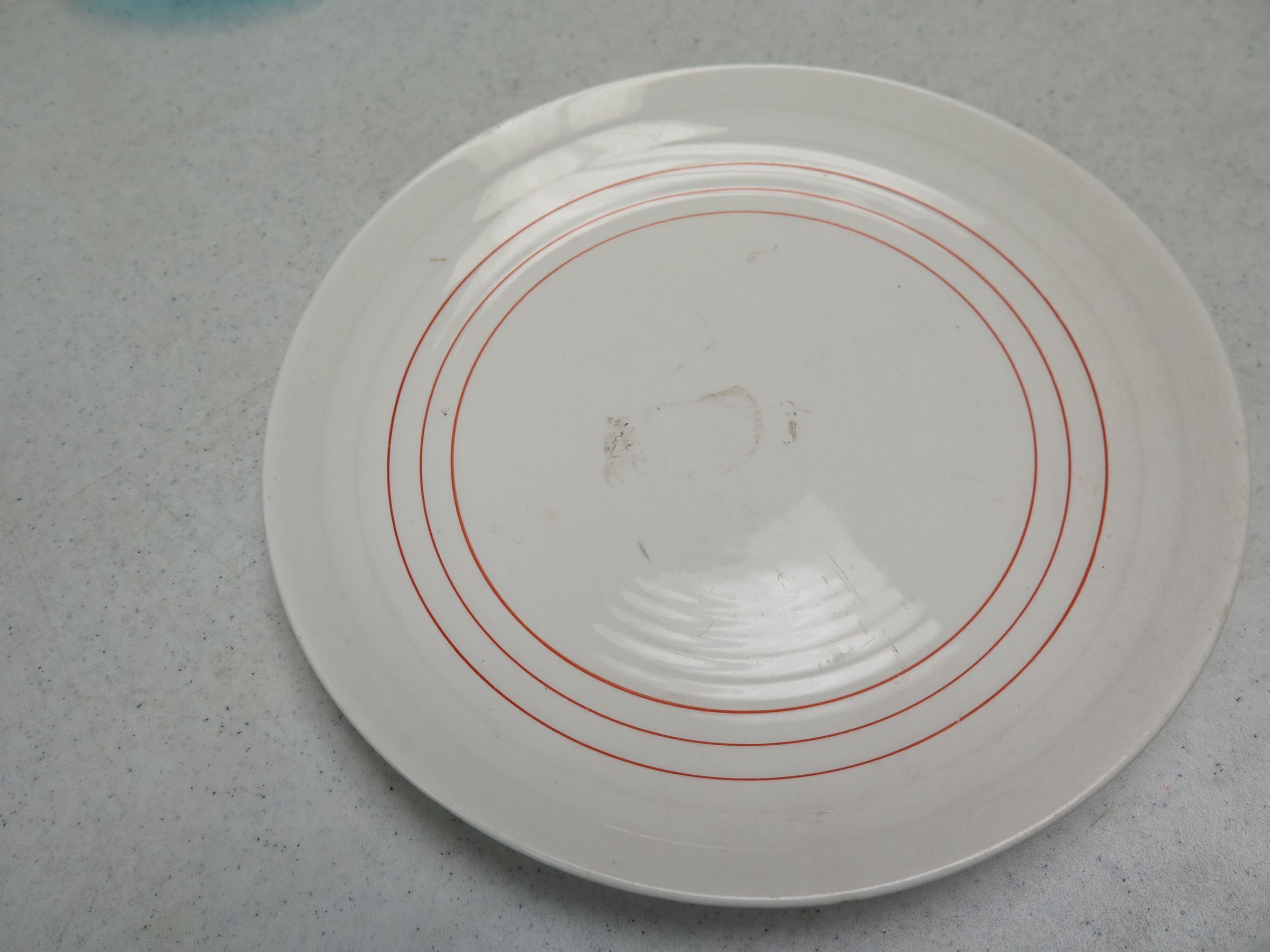 This is a white plate with 3 red stripes around the edge. The plate measures 1" (h) x 9.5" (dia).