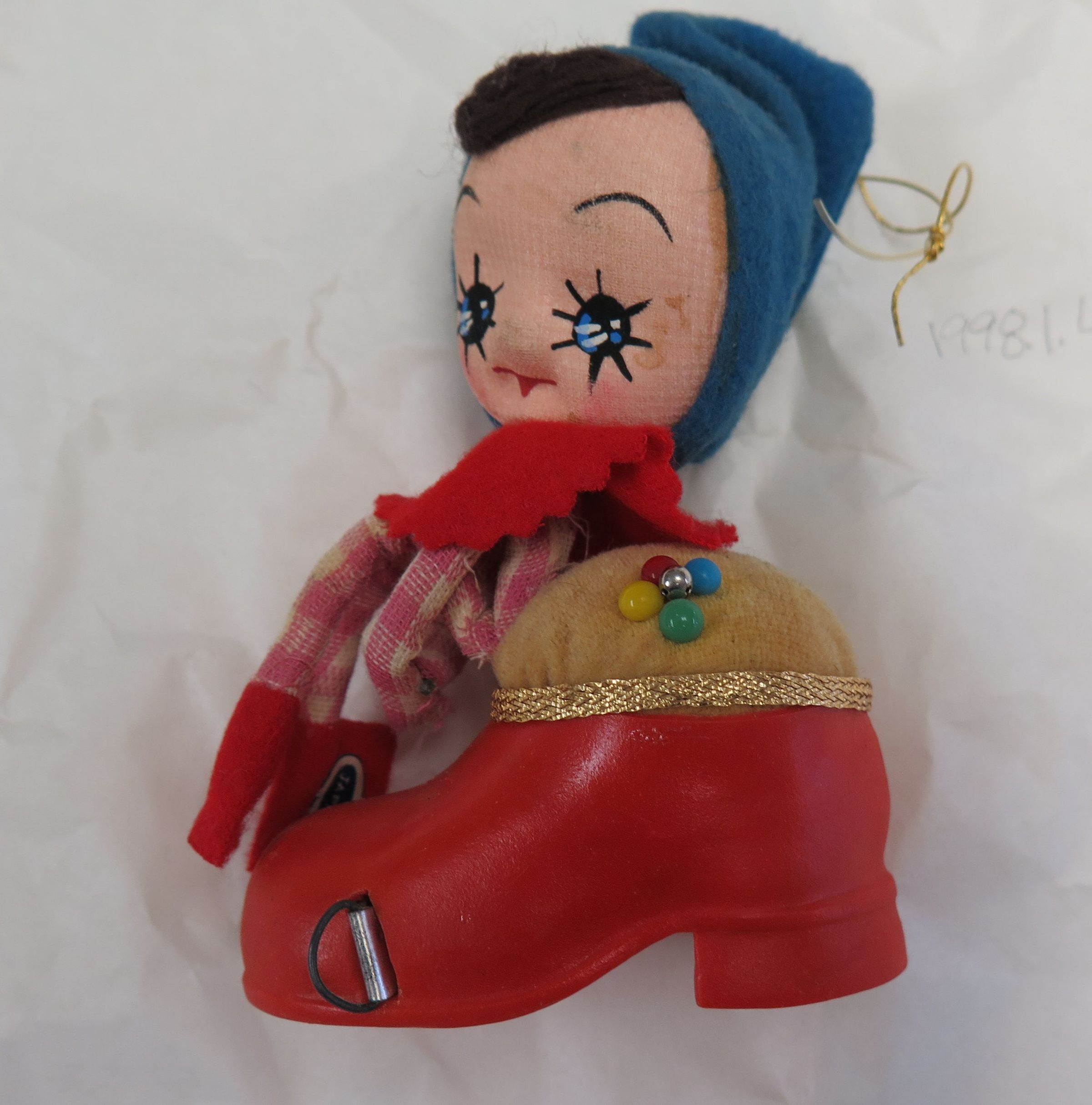 This is a pincushion shaped like an elf inside of a shoe. The elf is wearing a red and white checkered outfit with a blue hat, and the shoe is red. There are 5 pins stuck in the side of the pincushion. There is a label that says made in Japan. The pincushion measures 4.5" (h) x 3" (w) x 1.5" (l).