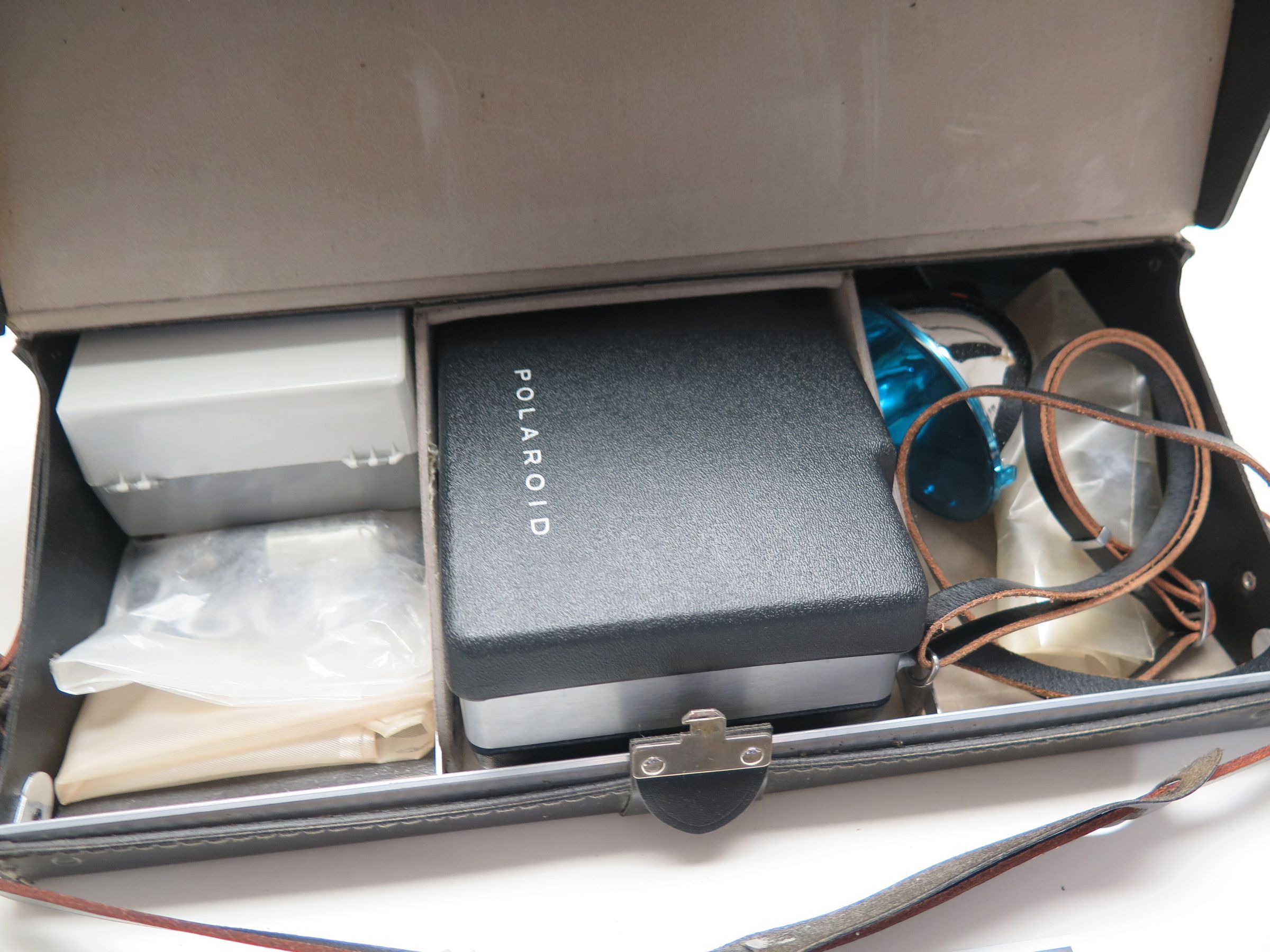 This is a Polaroid 100 Land camera and the accessories. The whole set measures 14" (w) x 8.5" (l) 3.5" (d).