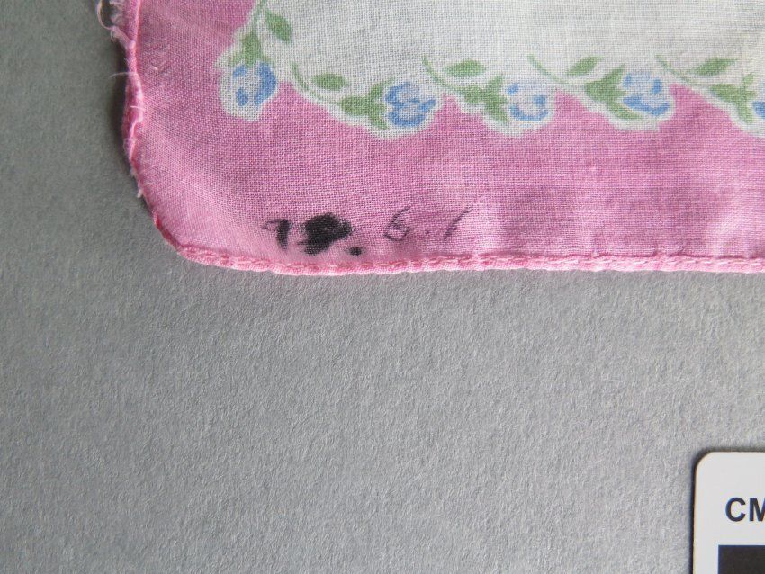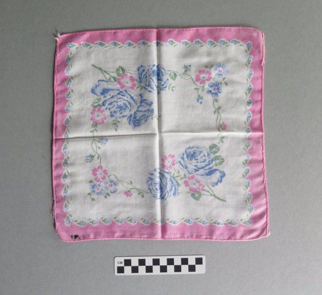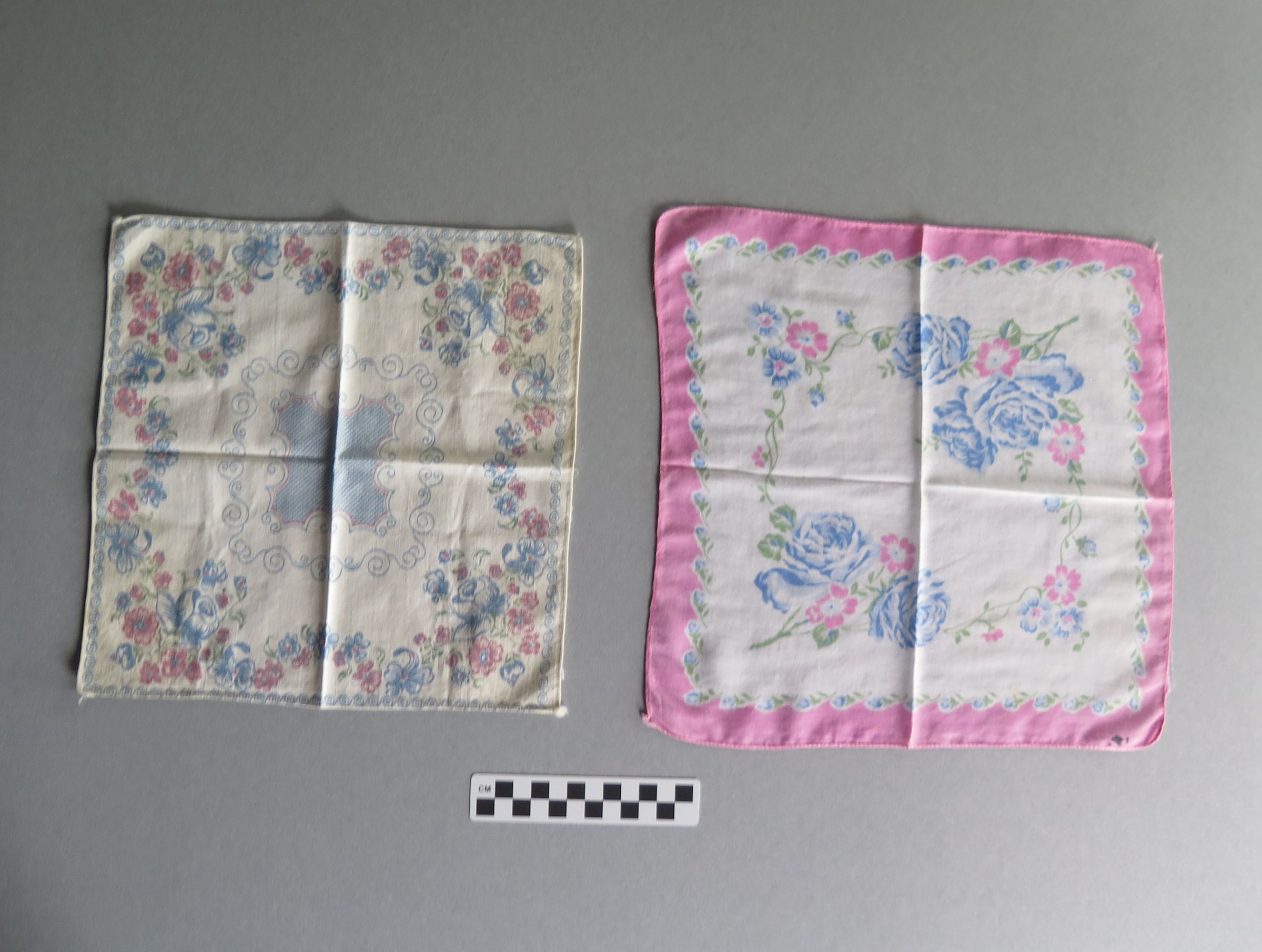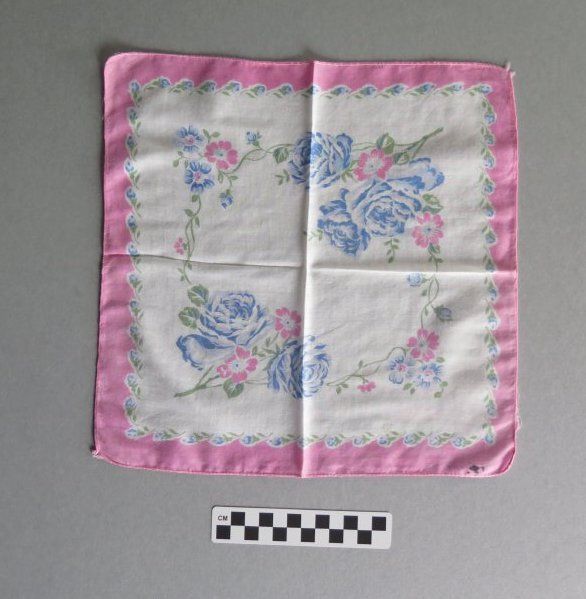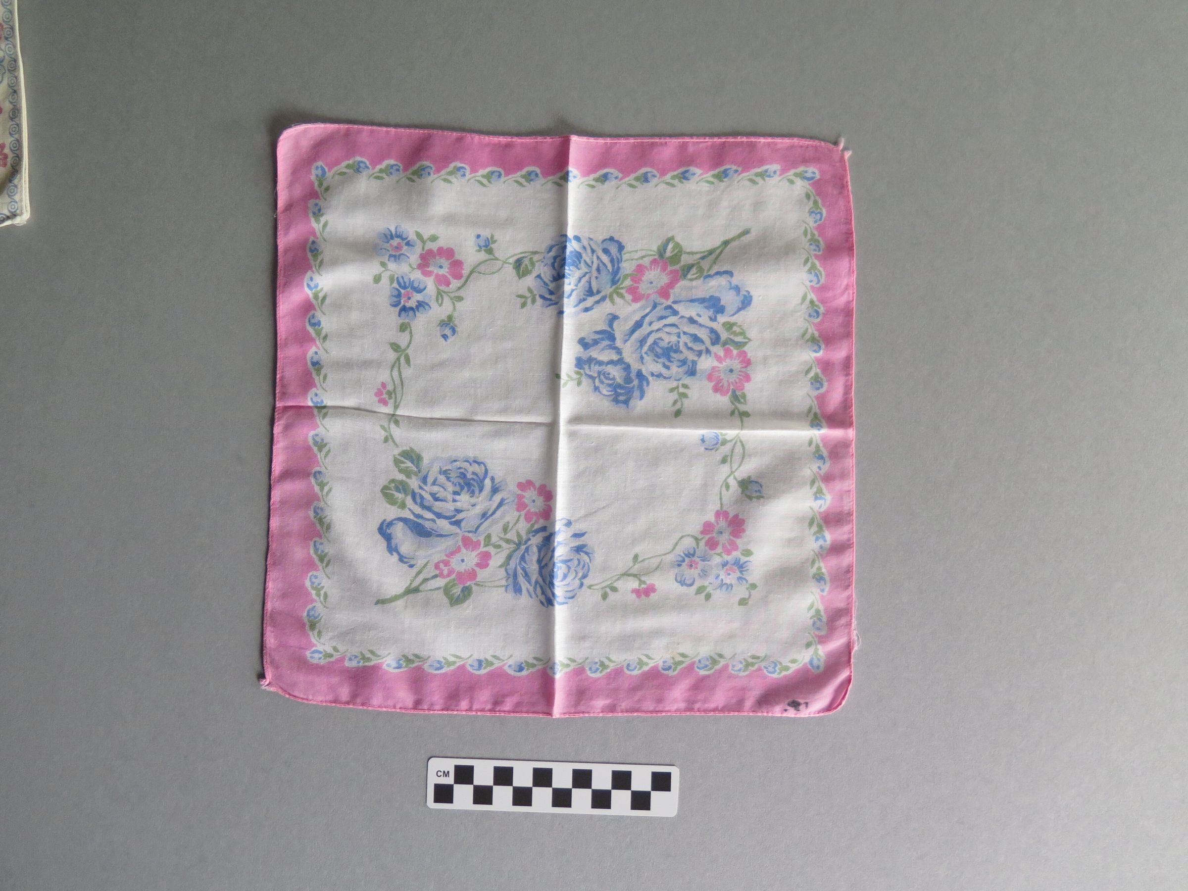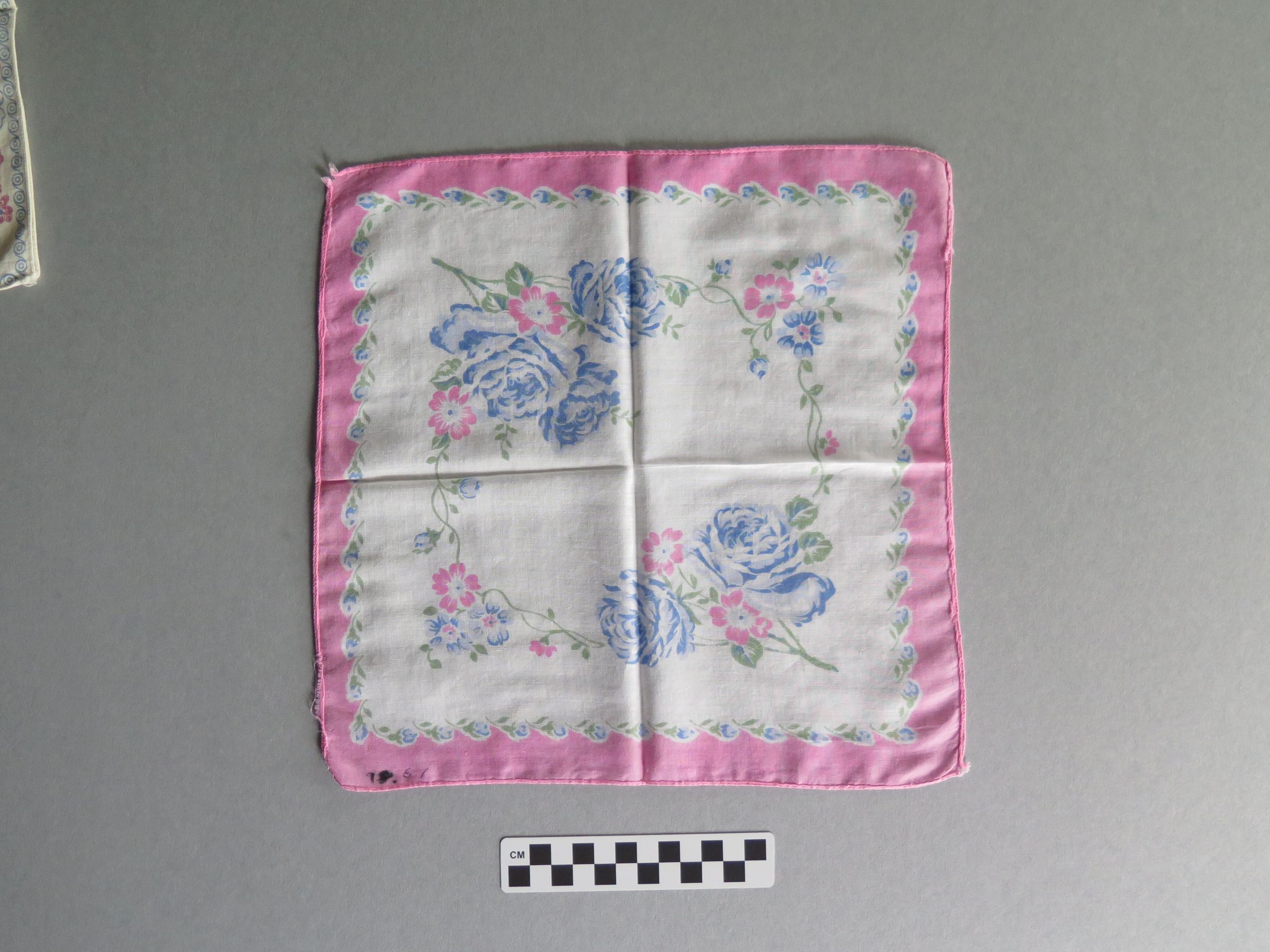 White handkerchief with pink and blue flowers bordering the handkerchief (a). There is a large blue floral design in the center of the handkerchief. White handkerchief with bright pink border (b). There is a pink and blue floral design in in the center of the handkerchief. The handkerchiefs measure 10.5" (w) x 10.5" (l), 12" (w) x 12" (l).