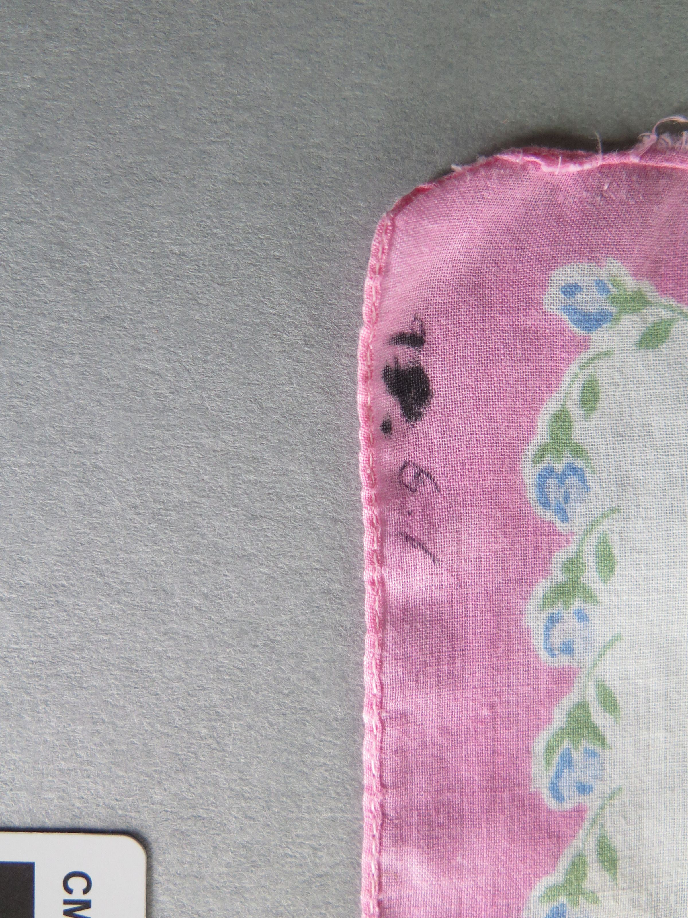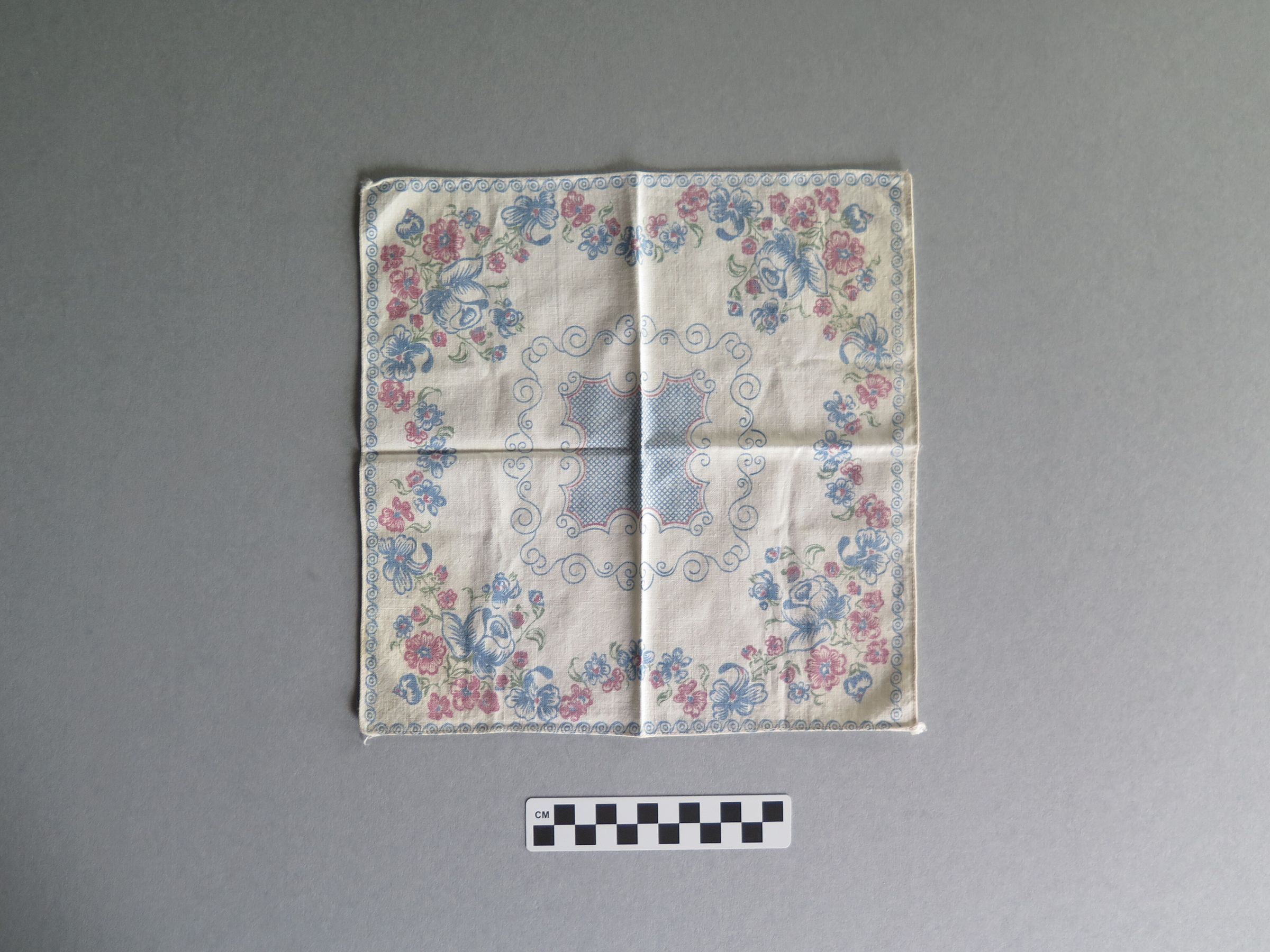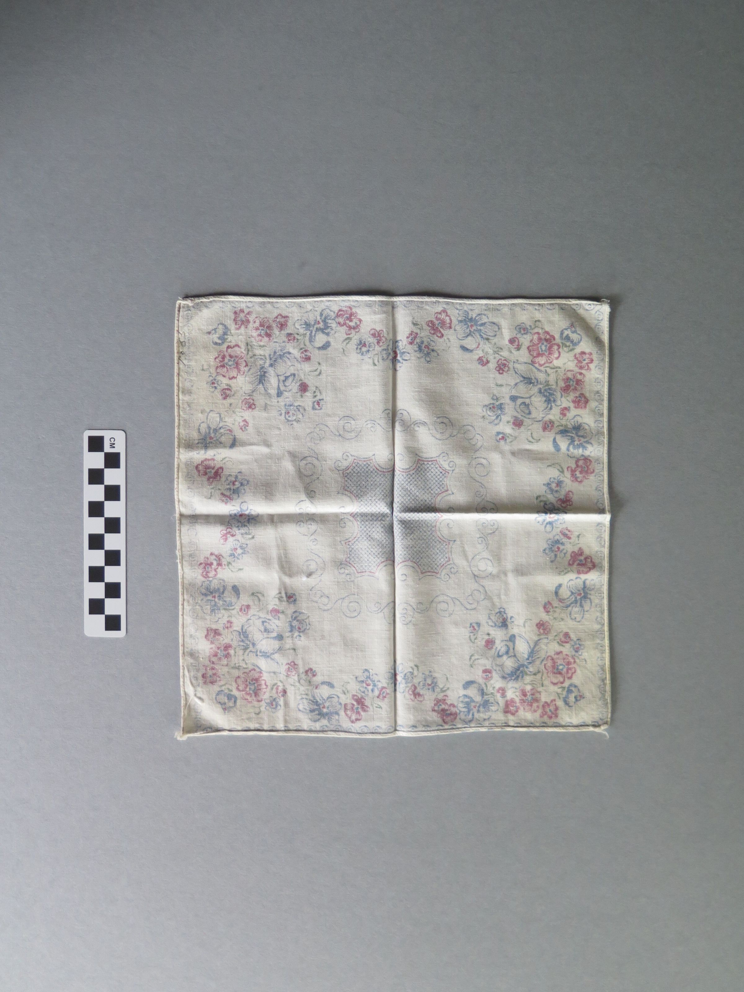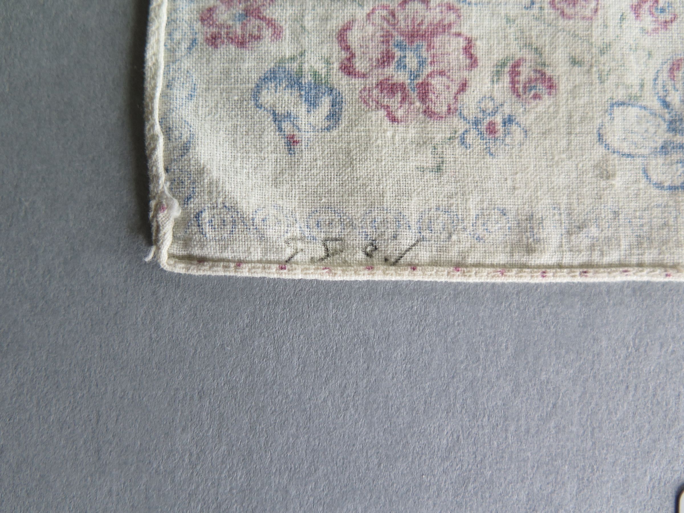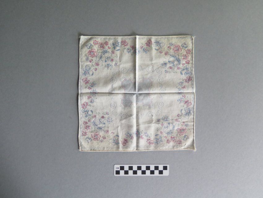White handkerchief with pink and blue flowers bordering the handkerchief (a). There is a large blue floral design in the center of the handkerchief. White handkerchief with bright pink border (b). There is a pink and blue floral design in in the center of the handkerchief. The handkerchiefs measure 10.5" (w) x 10.5" (l), 12" (w) x 12" (l).