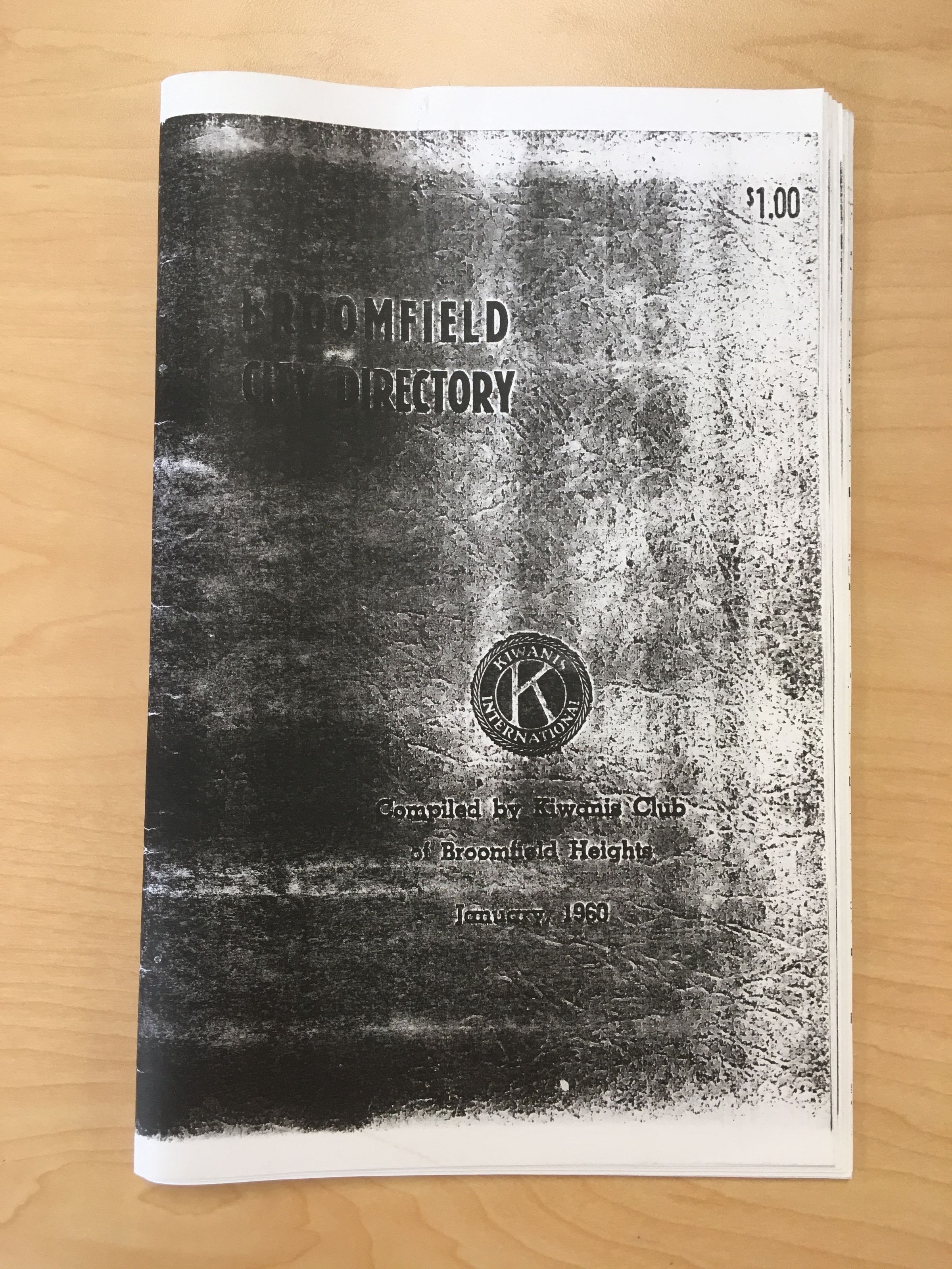 Copy of a Broomfield directory from January 1960. Compiled by Kiwanis Club of Broomfield Heights