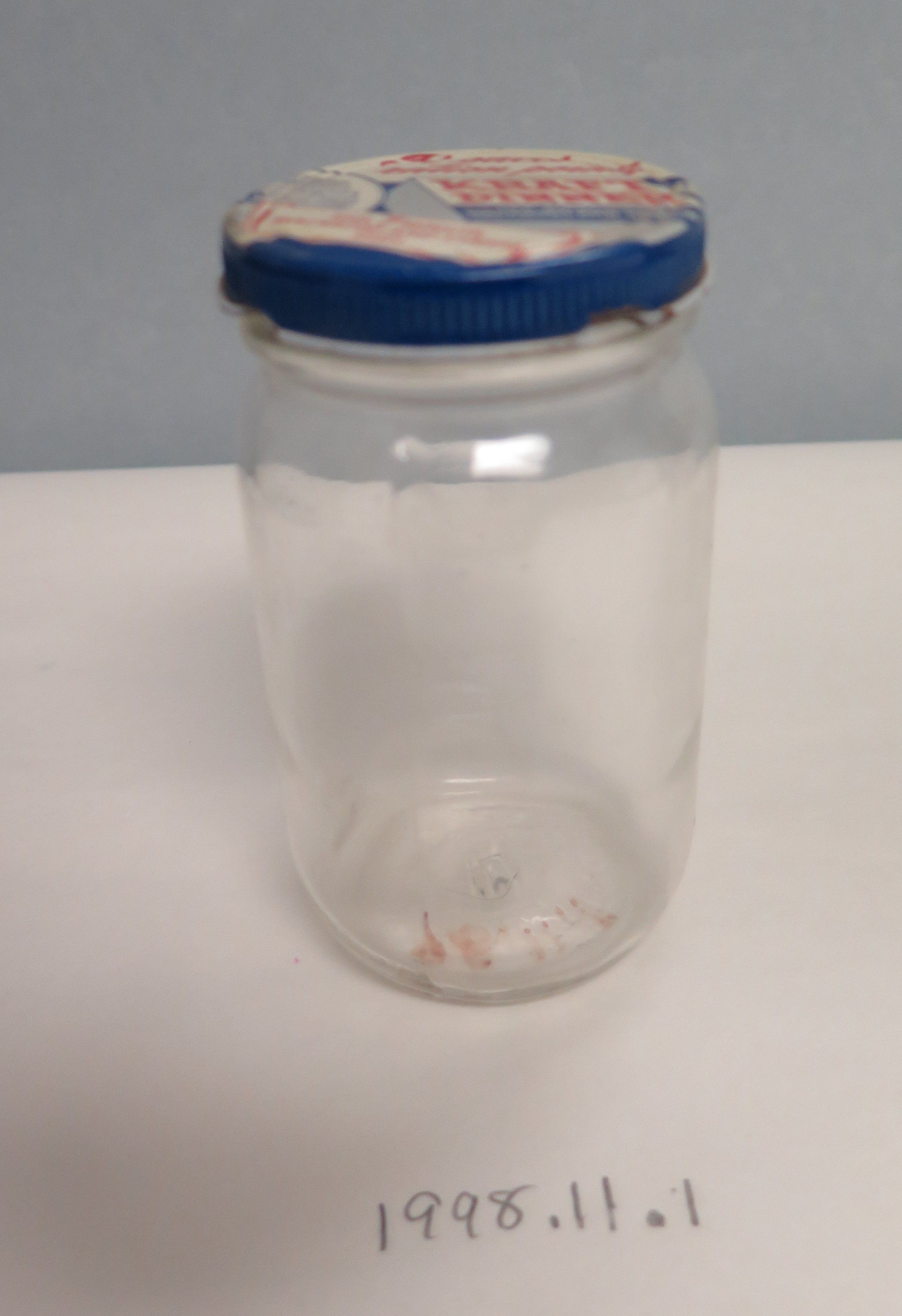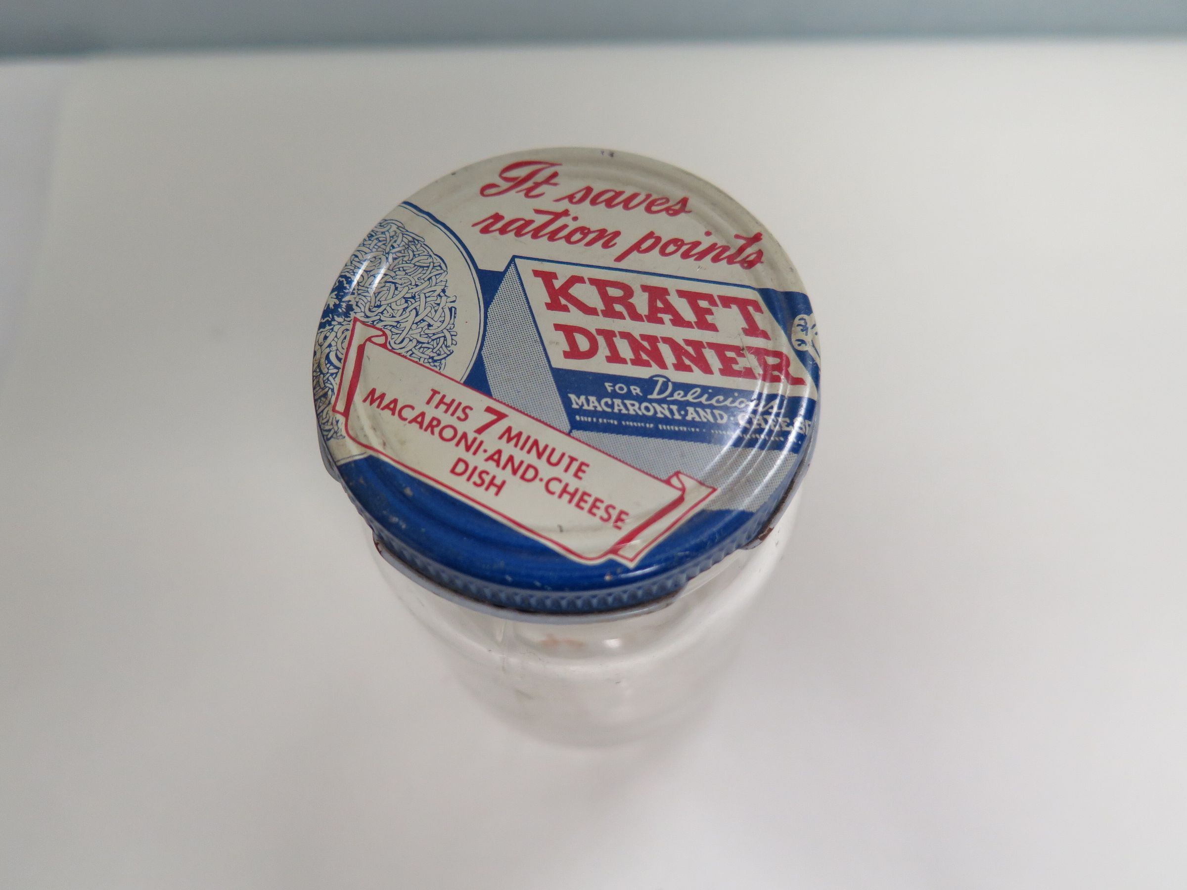 This is a clear glass jar with a round base and a round opening on the top. The jar has a metal lid that is blue and white with red text on top that reads, "It saves/ nation points/ Kraft/ Dinner/ for Delicious/ Macaroni and Cheese/ This is a 7 minute/ Macaroni and Cheese/ Dish". The jar measures 4.25" (h) x 2" (dia).Collection