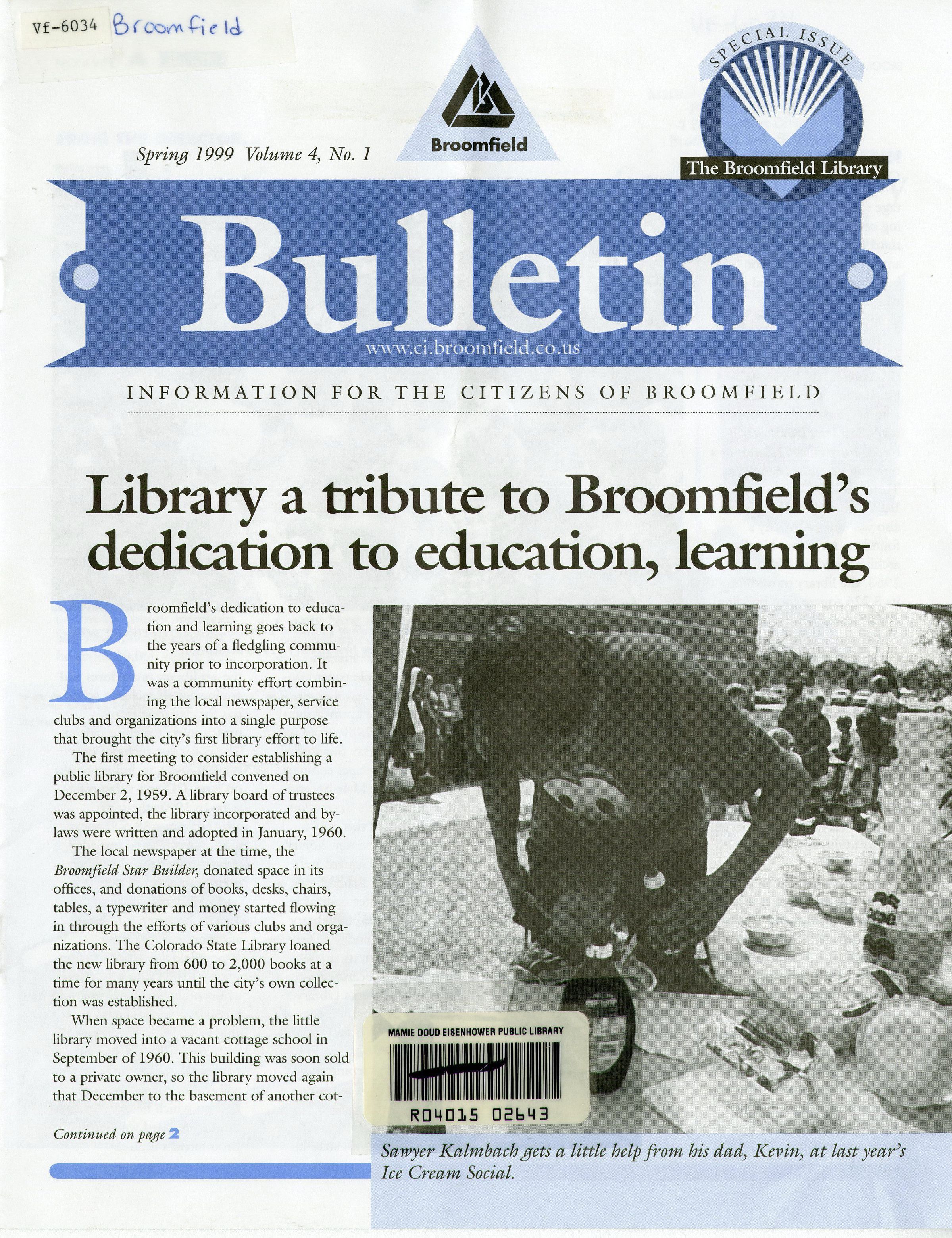 Volume four, number one of Bulletin. Published in spring of 1999. Has sections on the Library being a tribute to Broomfield's dedication to education, the theme for the summer reading program, the Broomfield Library Friends group, interlibrary loans, technology and modern libraries, and Young Adult Services for middle and high school students.Lexicon