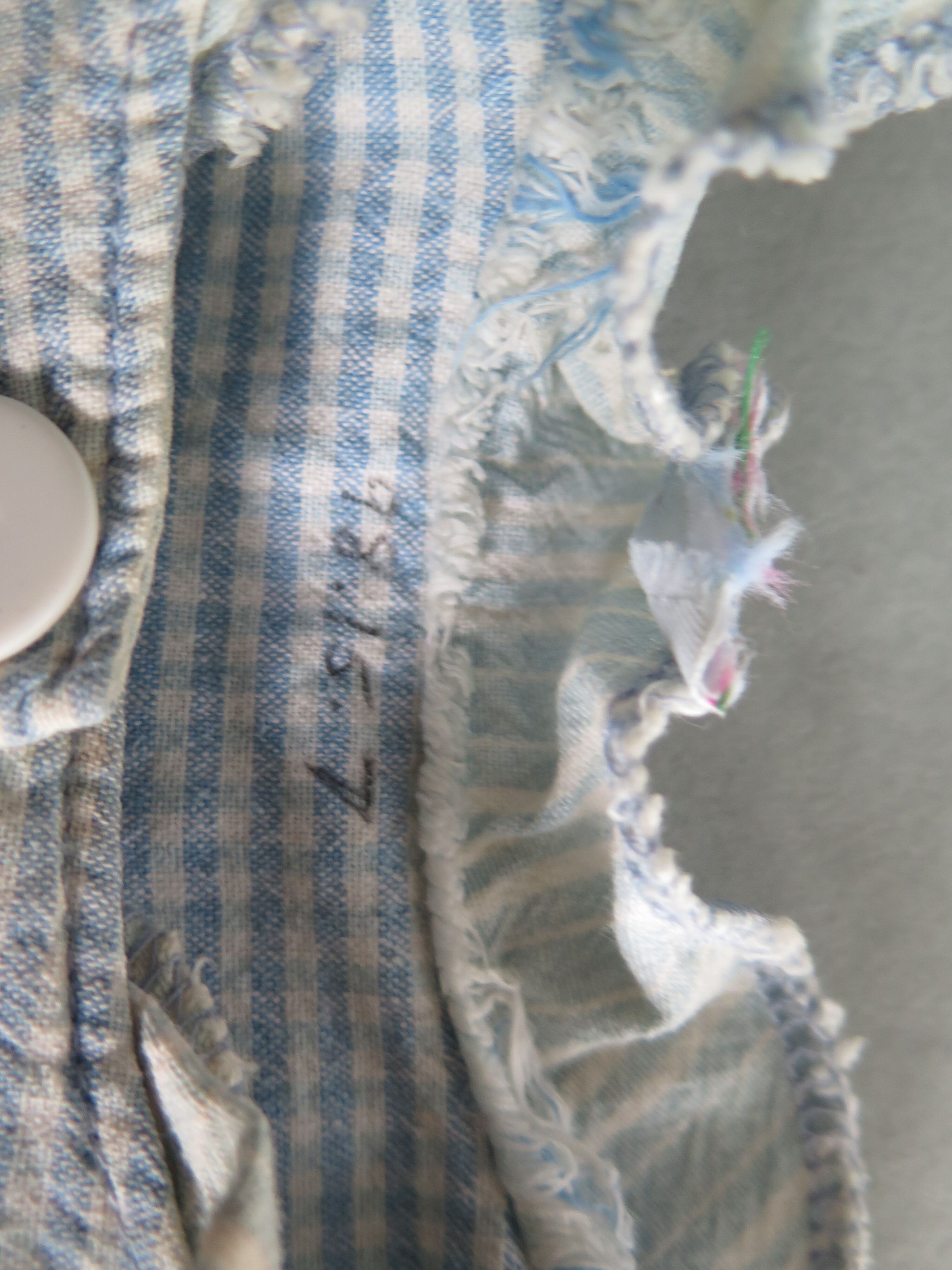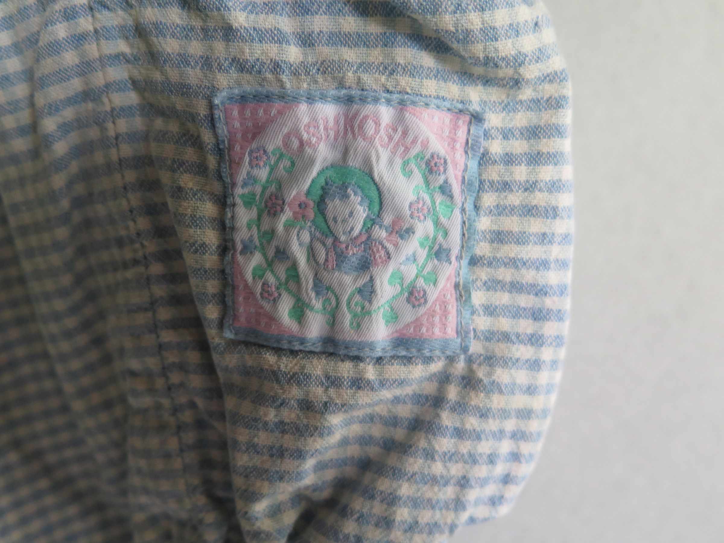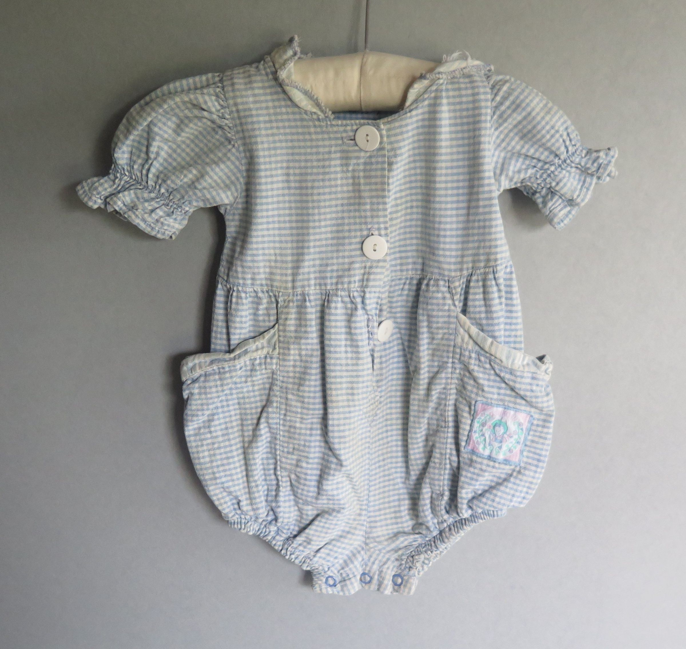 Child's blue and white checked romper. There are three large white buttons going down the front of the romper. There are two pockets on the sides of the romper and one has a tag that reads "Oshkosh'" with a girl in a hat holding a flower. There is elastic on the sleeves and on the legs with three clip buttons on the very bottom to close around legs. The neckline has a white collar that is trimmed in blue. Jumper measures 8" (w) x 16" (l).