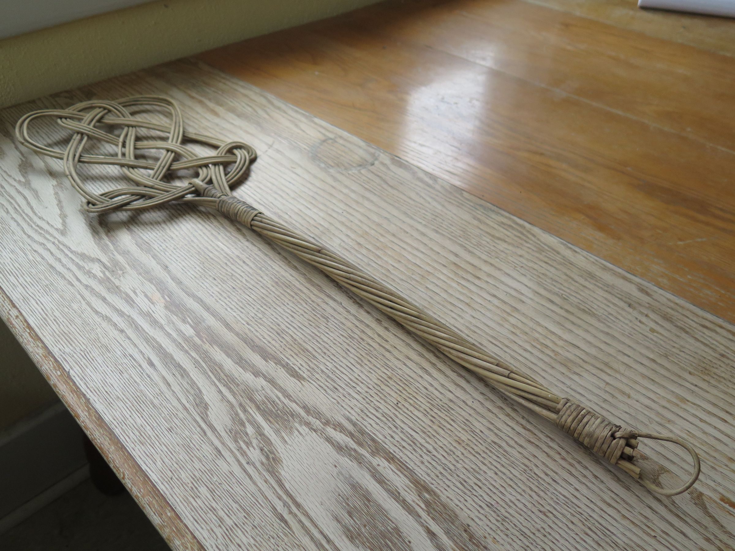 Whicker rug beater with a braided design. There is a loop at the end of the handle for hanging. The rug beater measures 8.5" (w) x 30.25" (l).