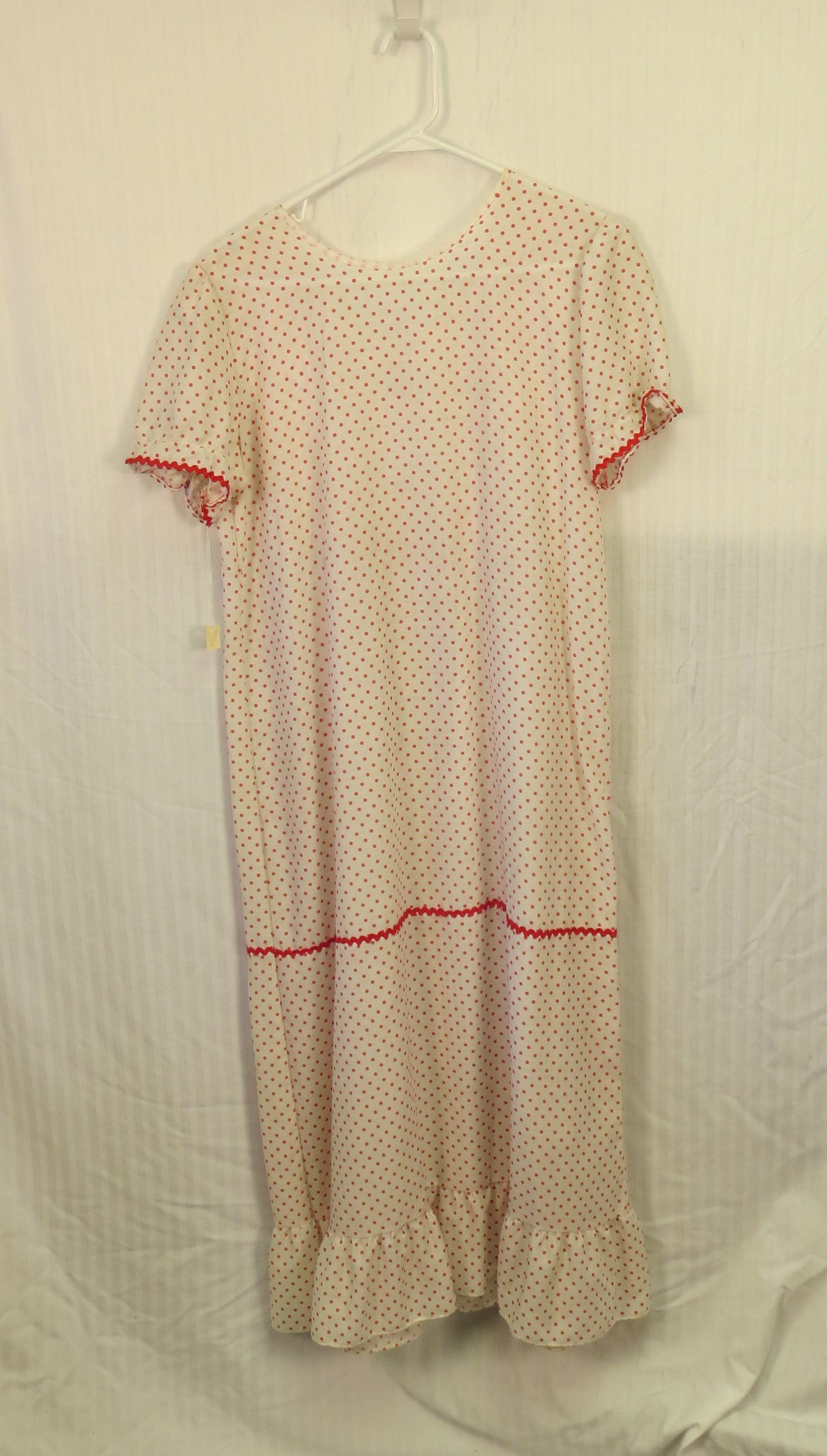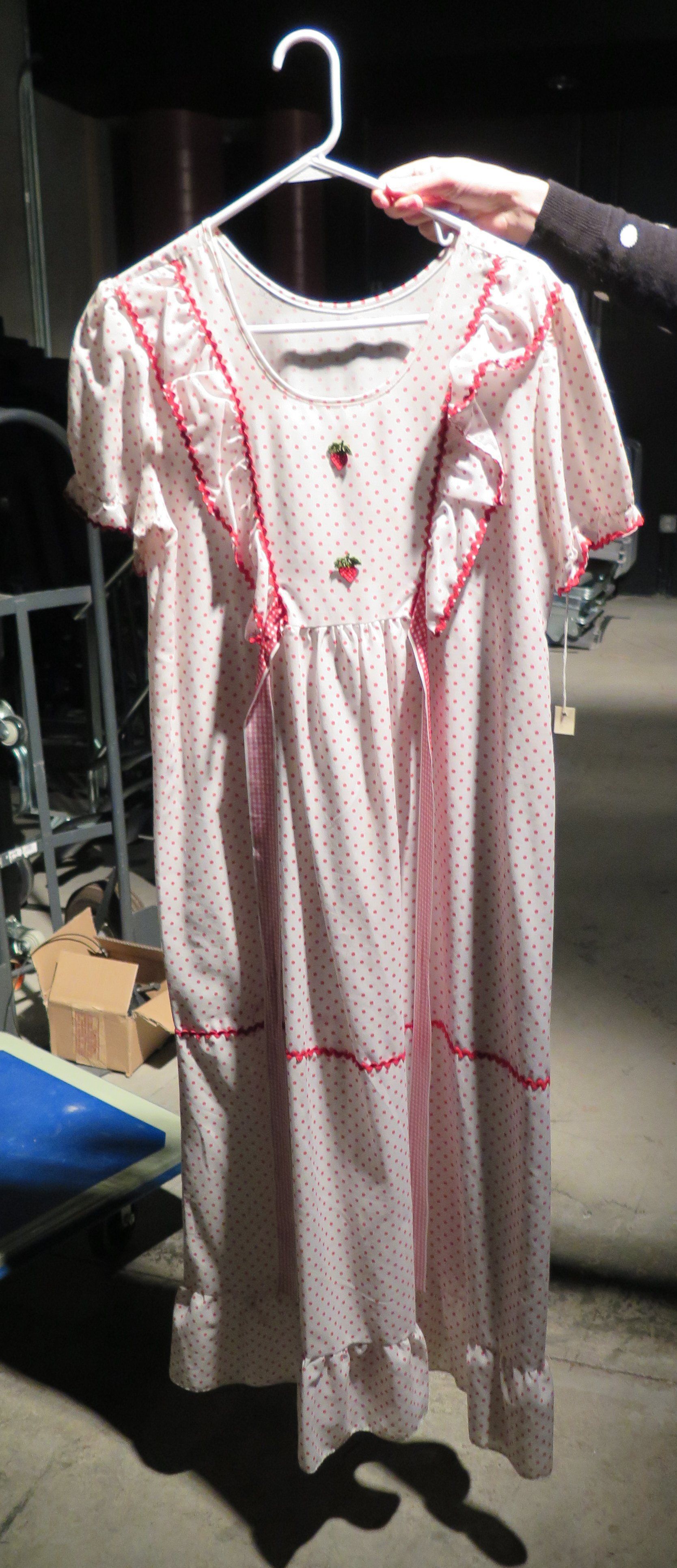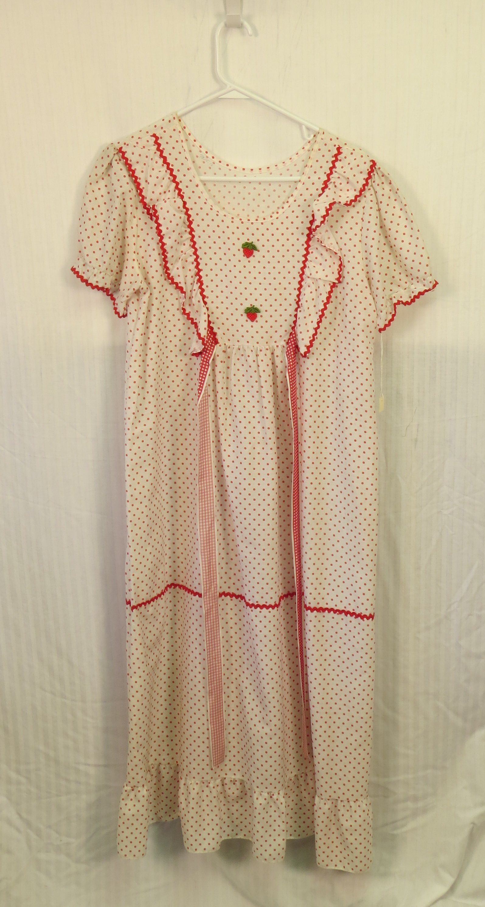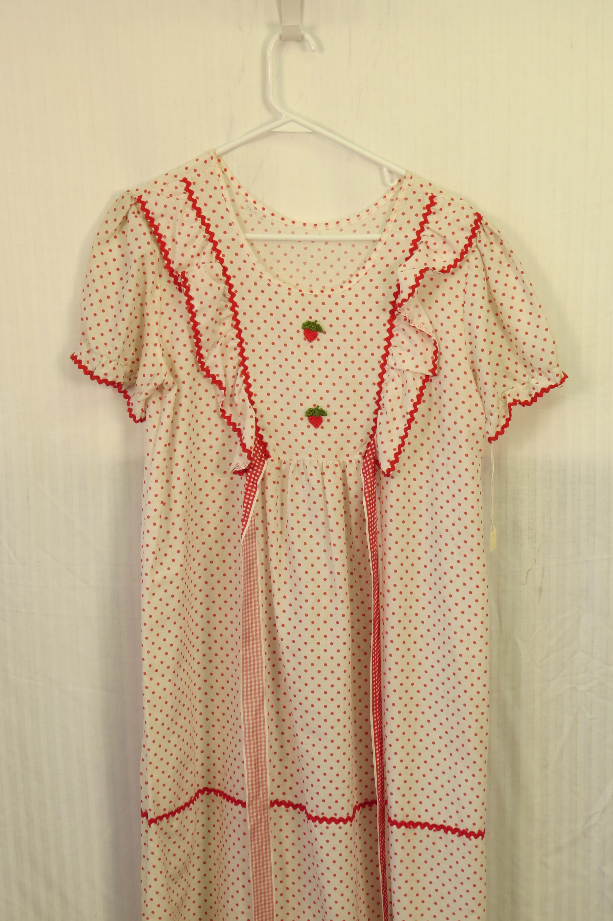 This is a white. short-sleeved dress with red polka dots all over it. The dress has some decorative ruffles on the chest, and 2 strawberries in the middle of the chest. There are 2 ribbons hanging off the front of the dress that could be tied around the wearer. The dress measures 52" (l).