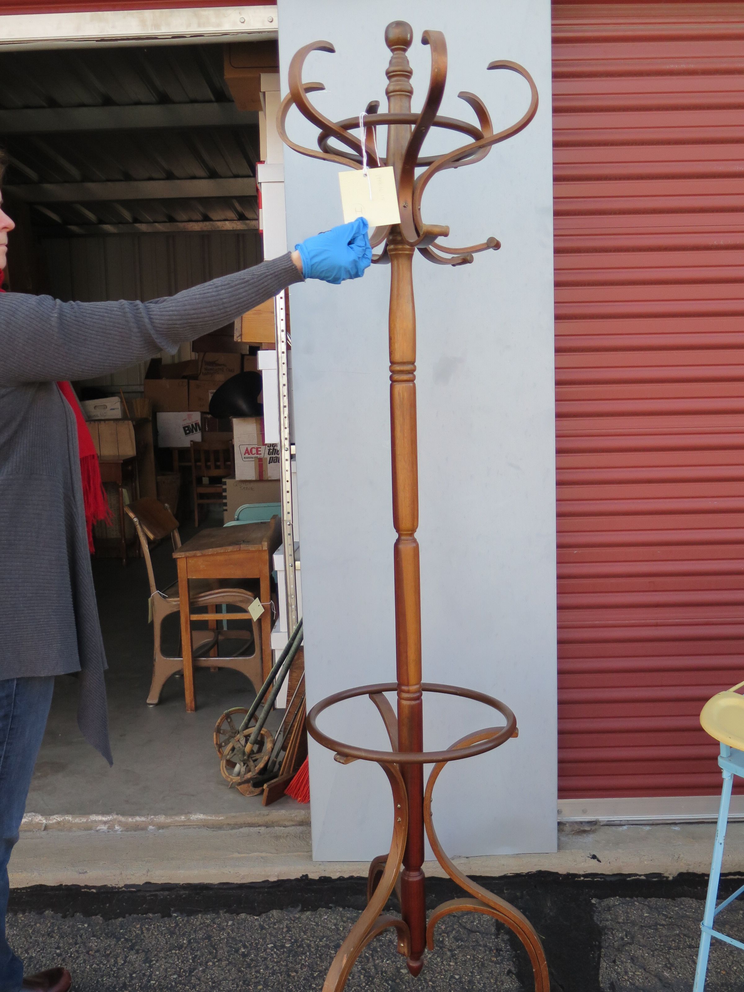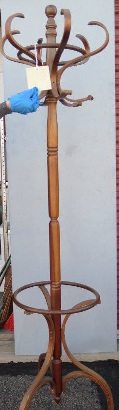 This coat rack is 72"(h) x 17"(d). It is made of wood.