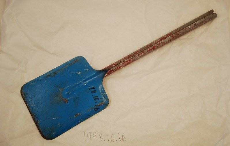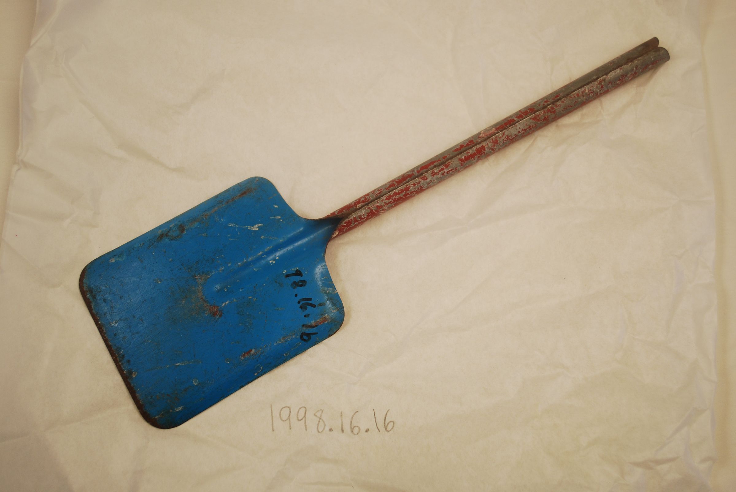 The child's shovel measures 12" (h) x 3" (w). It is a metal shovel with a blue blade.Collection