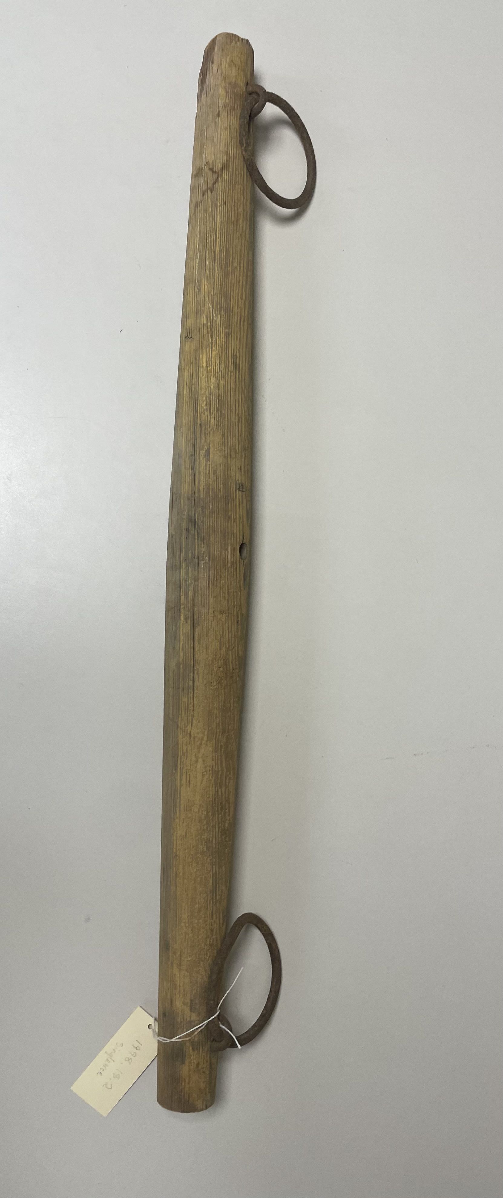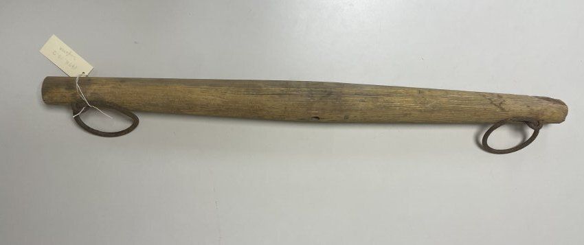 Singletree, a crossbar pivoted in the middle, to which the traces are attached in a horse-drawn wagon or plow. Wooden bar with two iron rings at either side. Remnants of light yellow paint throughout. Hitch, yoke.