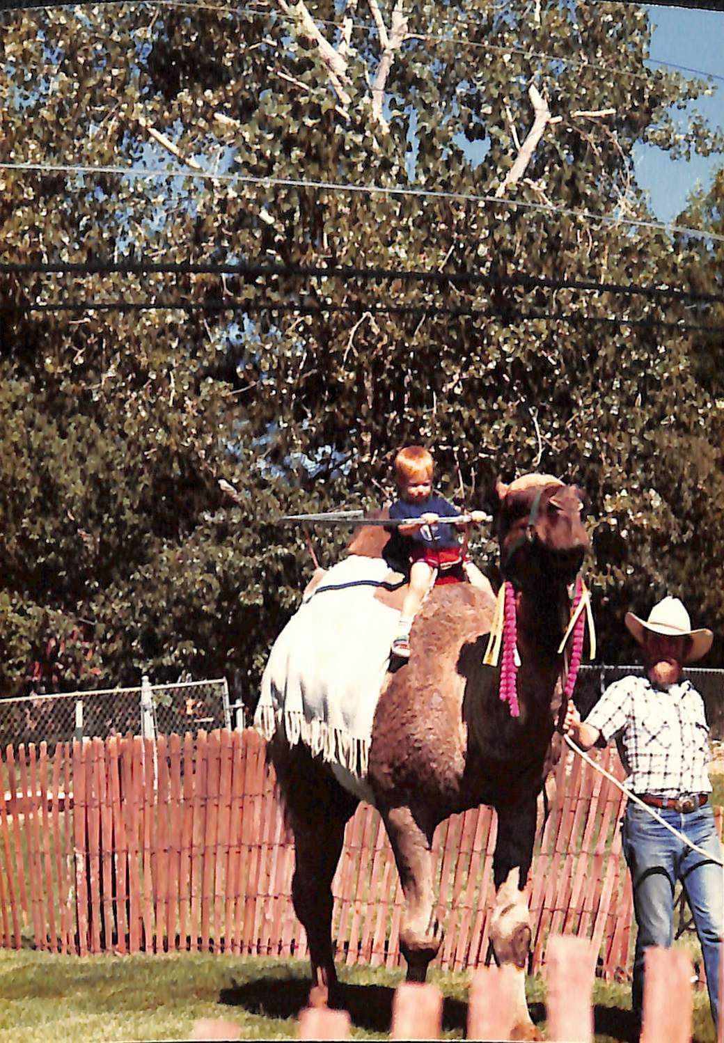 Item is a photograph printed on Kodak paper taken during the 1989 Broomfield Days event. In the photo, a little boy in a blue shirt and red shorts is riding a camel in a grassy area enclosed by a wooden fence. The camel has a white blanket on its back and purple and yellow accessories dangling from its head. It is being led throughout the enclosure by a bearded man wearing a cowboy hat, jeans, and a flannel shirt. Large trees and power lines take up most of the background.Photograph Details