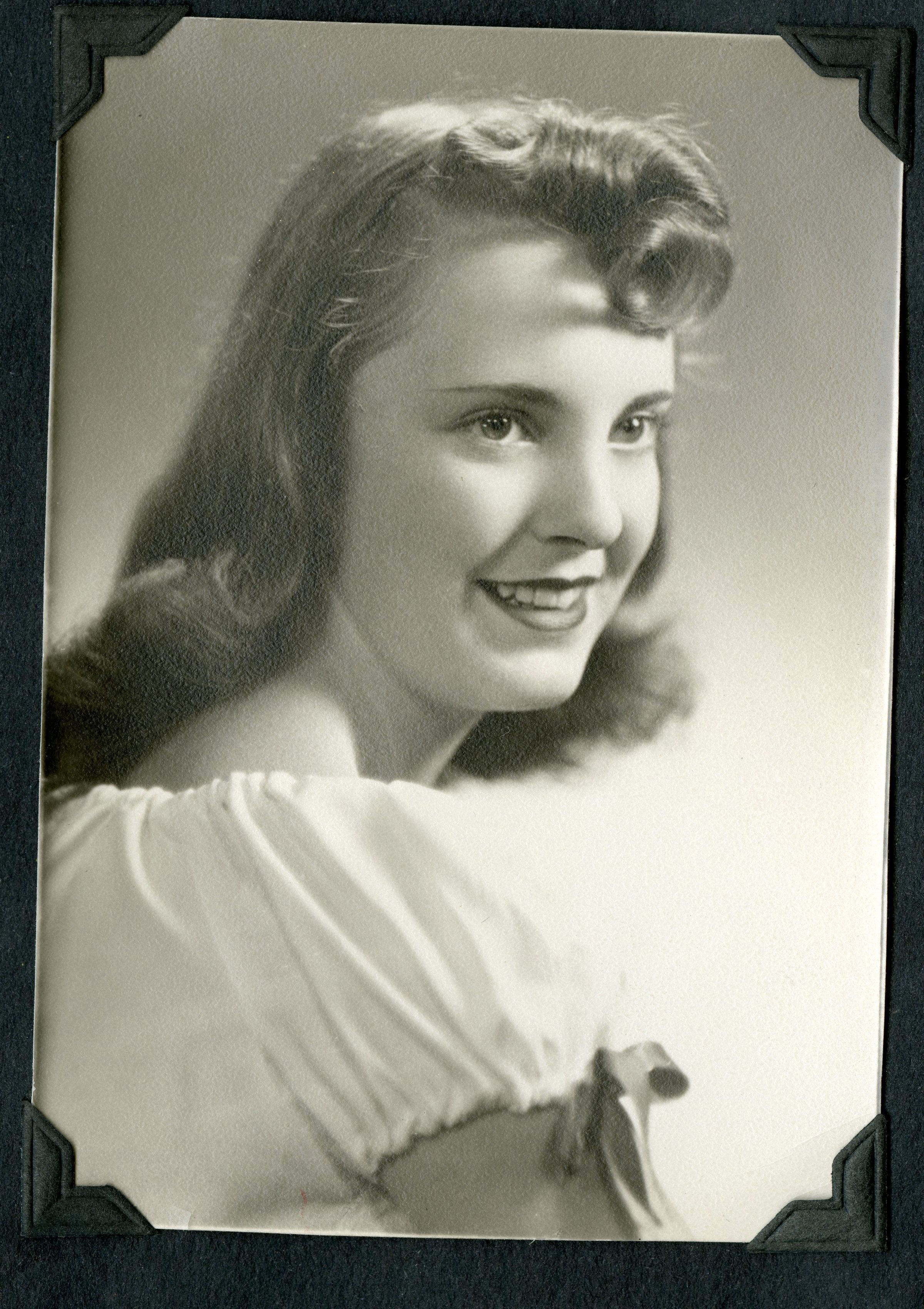 Black and white photograph of a young woman, possibly Carrie Brunner.