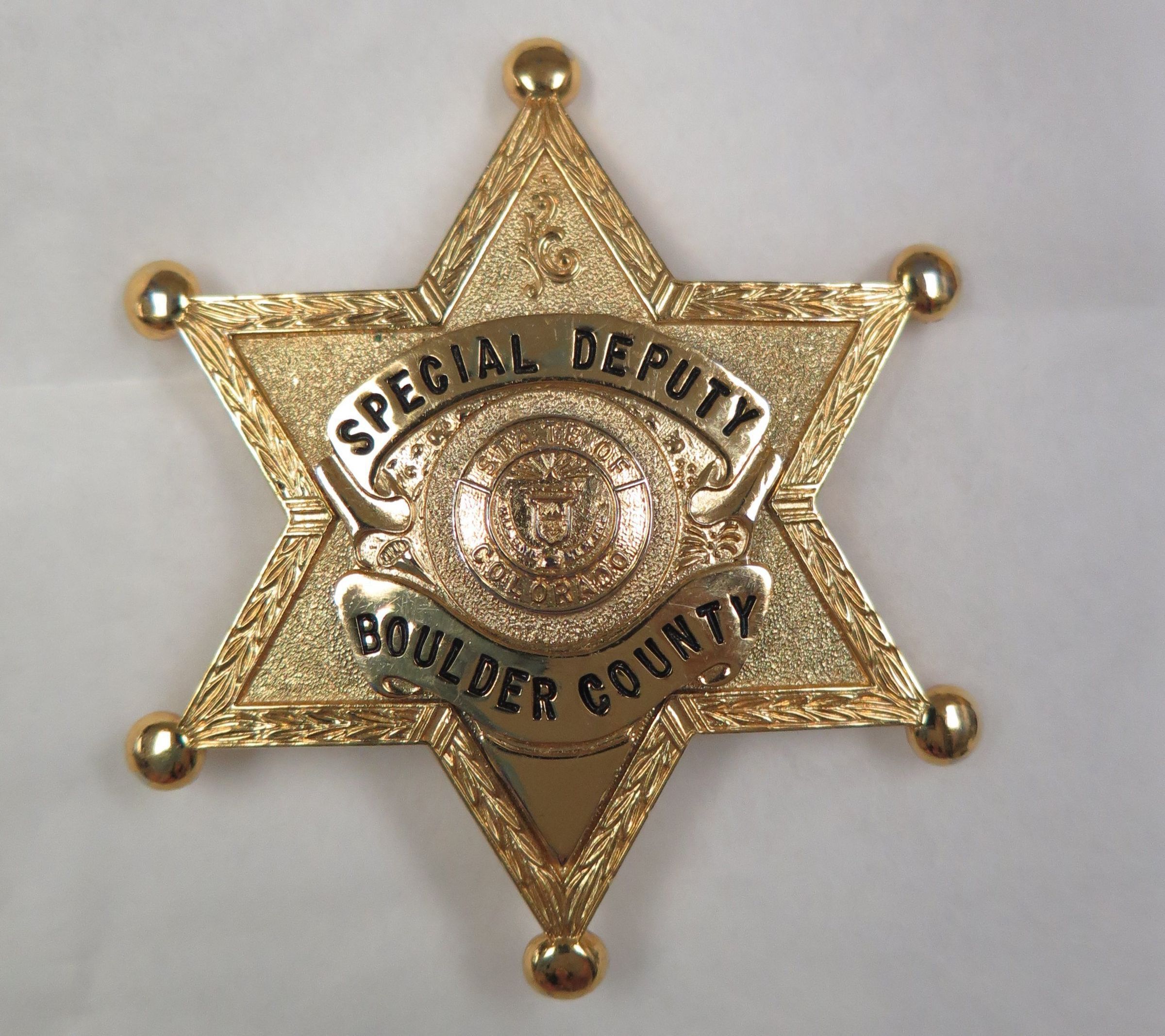 This is a special deputy badge for Boulder County. The badge is shaped like s 6 pointed star and is made of a gold metal. The star has round balls at the end of each point. The black text in the middle of the star reads, "Special Deputy/ Boulder County". The badge measures 2.5" (h) x 2.5" (w).