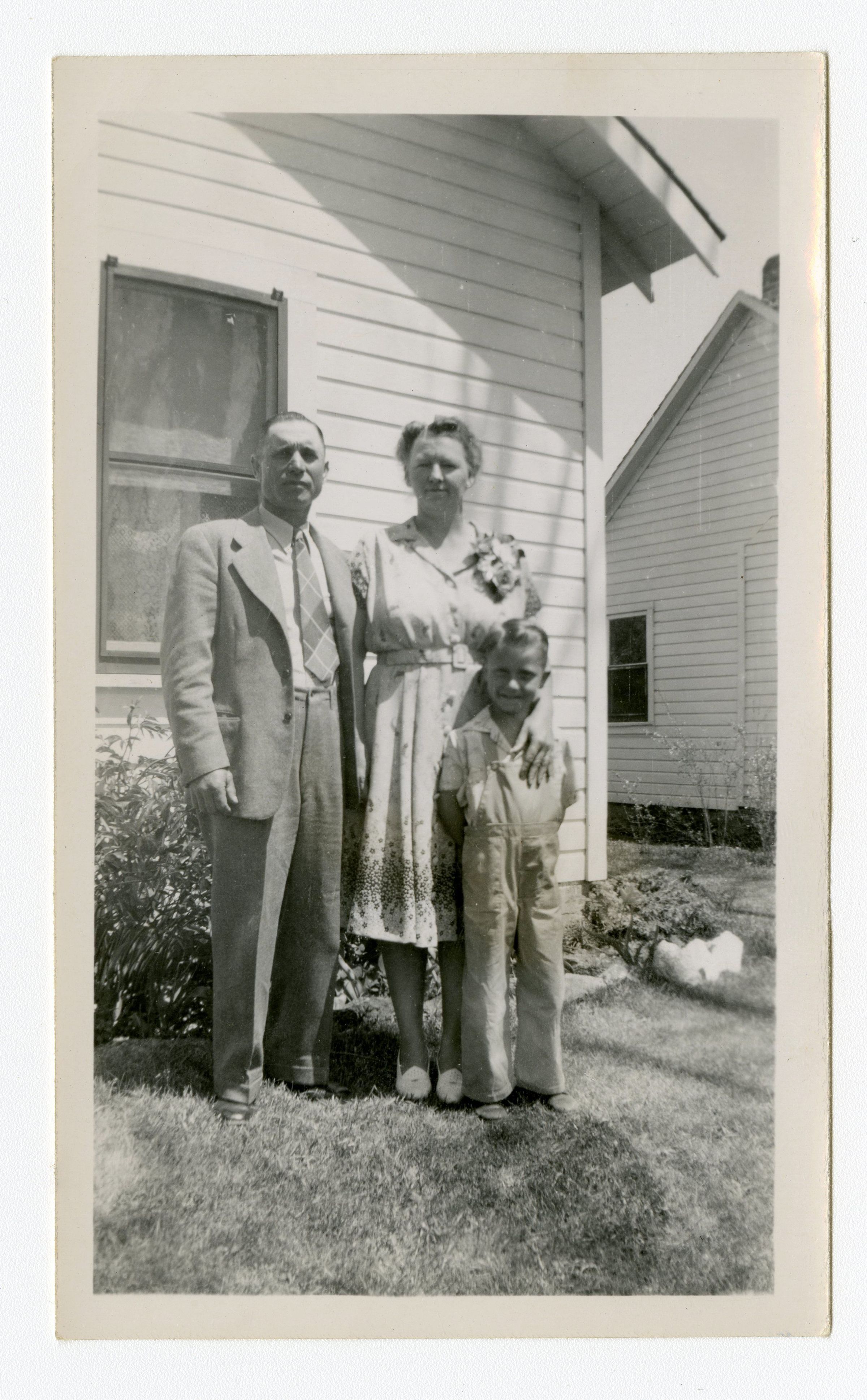 Black and white photograph of a man, a woman, and a boy standing outside of a house. The man is wearing a light suit. The woman is wearing a dress with flowers on her left shoulder. The boy is wearing a white shirt and overalls. The woman is Liz Brunner. The man is Lester C Brunner. The boy is probably Lester K Brunner.